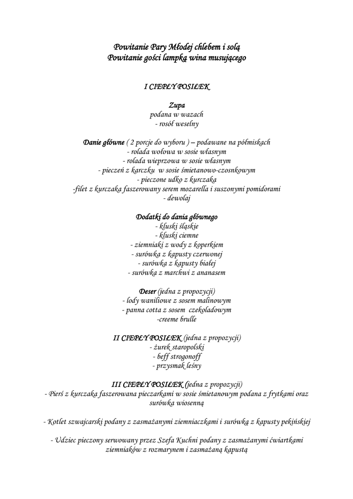 Powitanie Pary Młodej chlebem i solą Powitanie gości lampką wina musującego I CIEPŁY POSIŁEK Zupa podana w wazach - rosół weselny Danie główne ( 2 porcje do wyboru ) – podawane na półmiskach - rolada wołowa w sosie własnym - rolada wieprzowa w sosie własnym - pieczeń z karczku w sosie śmietanowo-czosnkowym - pieczone udko z kurczaka -filet z kurczaka faszerowany serem mozarella i suszonymi pomidorami - dewolaj Dodatki do dania głównego - kluski śląskie - kluski ciemne - ziemniaki z wody z koperkiem - surówka z kapusty czerwonej - surówka z kapusty białej - surówka z marchwi z ananasem Deser (jedna z propozycji) - lody waniliowe z sosem malinowym - panna cotta z sosem czekoladowym -creeme brulle II CIEPŁY POSIŁEK (jedna z propozycji) - żurek staropolski - beff strogonoff - przysmak leśny III CIEPŁY POSIŁEK (jedna z propozycji) - Pierś z kurczaka faszerowana pieczarkami w sosie śmietanowym podana z frytkami oraz surówka wiosenną - Kotlet szwajcarski podany z zasmażanymi ziemniaczkami i surówką z kapusty pekińskiej - Udziec pieczony serwowany przez Szefa Kuchni podany z zasmażanymi ćwiartkami ziemniaków z rozmarynem i zasmażaną kapustą IV CIEPŁY POSIŁEK (jedna z propozycji) - bogracz - barszcz czerwony z pasztecikiem z ciasta francuskiego Zimne przekąski -wachlarz wędlin i mięs pieczonych -deski serów żółtych i pleśniowych -roladki szynkowe z musem chrzanowym -roladki serowe z nadzieniem fromage -tymbaliki drobiowe -marynaty mix -jajka faszerowane na trzy sposoby -muszle makaronowe z sałatką tuńczykową -kuleczki rybne w marynacie -śledzik w śmietanie -pieczywo mieszane -masło Dwie sałatki do wyboru : -sałatka grecka -sałatka z brokułami i grillowanym kurczakiem -sałatka z brokułami i serem feta -sałatka tradycyjna jarzynowa - sałatka z paluszkami krabowymi Napoje gorące (bez limitu) -kawa rozpuszczalna z mleczkiem -herbata z cytryną Napoje zimne -coca-cola, fanta, sprite ( 3 szt./os) -soki owocowe (bez limitu) -woda mineralna niegazowana (bez limitu) Apartament dla Pary młodej gratis Koszt przyjęcia weselnego 170 zł od osoby *dzieci do lat 3 – gratis ,dzieci do lat 7 - 50% *obsługa (orkiestra, fotograf) – 50% *parking dla gości weselnych – gratis *pokoje dla gości weselnych – 150 zł/pokój ze śniadaniem Potrawy uzupełniające:/ceny podane za porcję na osobę/ Przystawki: Mozarella z pomidorami i sosem balsamicznym 9 zł Medalion ze schabu z jajkiem przepiórczym 10 zł Łosoś norweski z musem koperkowym 12 zł Dodatkowy ciepły posiłek: Chrupiący camembert z żurawiną 13 zł Szaszłyk drobiowy z frytkami z sałatką Colesław 18 zł Polędwiczki w sosie myśliwskim z ziemniakami i buraczkami 22 zł Zimna płyta: Befsztyk tatarski 7 zł Roladki z boczku nadziewane śliwką kalifornijską 6 zł Różyczki z łososia wędzonego z musem koperkowym 10 zł Pstrąg w galarecie 10 zł Ryba po grecku 11 zł Mozarella z pomidorami i sosem balsamicznym 8 zł Śledź w oleju 6 zł Sałatka (warzywna, grecka, brokułowa, z paluszkami krabowymi) 7 zł Patery z owocami 45 zł Ciasta (jabłecznik, makowiec, sernik) 35zł/1 kg Dodatkowo istnieje możliwość przygotowania : *wiejskiego stołu(kwaśnica smalec, kiełbasa myśliwska chleb wiejski, ogórki kiszone, kaszanka) *fontanna czekoladowa (2 kg czekolady, owoce) Oferta obowiązuje od 01.12.2013r. 1000 zł 550 zł