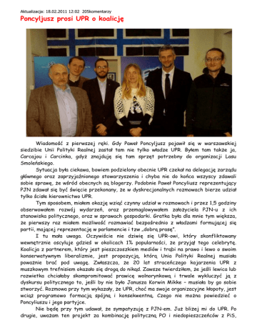 Aktualizacja: 18.02.2011 12:02 205komentarzy Poncyljusz prosi UPR o koalicję Wiadomość z pierwszej ręki. Gdy Paweł Poncyljusz pojawił się w warszawskiej siedzibie Unii Polityki Realnej zastał tam nie tylko władze UPR. Byłem tam także ja, Carcajou i Carcinka, gdyż znajduję się tam sprzęt potrzebny do organizacji Lasu Smoleńskiego. Sytuacja była ciekawa, bowiem podzielony obecnie UPR czekał na delegację zarządu głównego oraz zaprzyjaźnionego stowarzyszenia i chyba nie do końca wszyscy zdawali sobie sprawę, że wśród obecnych są blogerzy. Podobnie Paweł Poncyliusz reprezentujący PJN zdawał się być święcie przekonany, że w dyskrecjonalnych rozmowach bierze udział tylko ścisłe kierownictwo UPR. Tym sposobem, miałem okazję wziąć czynny udział w rozmowach i przez 1,5 godziny obserwowałem rozwój wydarzeń, oraz przemaglowywałem założyciela PJN-u z ich stanowiska politycznego, oraz w sprawach gospodarki. Gratka była dla mnie tym większa, że pierwszy raz miałem możliwość rozmawiać bezpośrednio z władzami formującej się partii, mającej reprezentację w parlamencie i tzw „dobrą prasę”. I tu mała uwaga. Oczywiście nie dziwię się UPR-owi, który skonfliktowany wewnętrznie oscyluje gdzieś w okolicach 1% popularności, że przyjął tego celebrytę. Koalicja z partnerem, który jest pieszczoszkiem mediów i trąbi na prawo i lewo o swoim konserwatywnym liberalizmie, jest propozycją, którą Unia Polityki Realnej musiała poważnie brać pod uwagę. Zwłaszcza, że 20 lat straceńczego kojarzenia UPR z muszkowym trefnisiem okazało się drogą do nikąd. Zawsze twierdziłem, że jeśli lewica lub rozwietka chciałaby skompromitować prawicę wolnorynkową i trwale wykluczyć ją z dyskursu politycznego to, jeśli by nie było Janusza Korwin Mikke – musiała by go sobie stworzyć. Rozmowa przy tym wykazały, że UPR, choć ma swoje organizacyjne kłopoty, jest wciąż programowo formacją spójną i konsekwentną. Czego nie można powiedzieć o Poncyliuszu i jego partyjce. Nie będę przy tym udawał, że sympatyzuję z PJN-em. Już bliżej mi do UPR. Po drugie, uważam ten projekt za kombinację polityczną PO i niedopieszczeńców z PiS, zmierzającą do osłabienia Jarosława Kaczyńskiego oraz do stworzenia miękkiego lądowania dla części platformesów w przypadku przegranych lub wygranych wyborów przez PO. Tusk (lub Schetyna) wymarzył sobie prawdopodobnie stworzenie „konstruktywnej opozycji” jako przeciwwagi dla opozycji „oszołomskiej”, jako drenaż elektoratu na prawo od PO, oraz jako miejsce zsyłki dla tych przydatnych Polityków, którzy mu zawadzają we wprowadzeniu swojej hegemonii i w zbliżeniu z SLD (projekt „Palikot”), a niestety są Popularni lub silni w regionie. Jednym słowem powtórzony numer „okrągłego stołu”. Wtedy wyszło, wiec i dziś może. Niemniej jednak rozmawiając z Pawłem Poncyliuszem starałem się wybić ponad moje własne uprzedzenia i prowadzić rozmowę do bólu merytorycznie. Oto, co usłyszałem. Po pierwsze okazało się, że PJN to formacja, która do końca nie wie nawet jak będzie się nazywała. Po wpadce z rejestracją nazwy stowarzyszenia, co było do przewidzenia, gdyż była ona od początku plagiatem zobaczyłem kompletną bezradność Poncyliusza, który zapytany wprost odpowiadał „zobaczymy, co da się zrobić” i „jakoś to będzie”. Doprawdy, kompetencja i przygotowanie formalne, że ho ho. Jako ciekawostkę dowiedziałem się, że Marek Migalski, jest traktowany kompletnie z buta, lekceważony i bagatelizowany, gdyż robi jedynie za fajnego felietonistę i odwracacza uwagi, bez wpływu na jakiekolwiek decyzje władz tej „partii” (cudzysłów, bo nie wiadomo zupełnie, czym formalnie jest PJN, wygląda na to, że jeszcze niczym). Do kierownictwa PJN należą bowiem: Kluzik (i jej luzik), Poncyliusz, Jakubiak (opoka), Kowal (złote myśli), Kamiński i Bielan (ostatnia wielka wygrana 6 lat temu). Reszta jest milczeniem. Reszta się nie liczy. Reszta nie podejmuje decyzji. Reszta jest pomocna i robi tło. Natomiast autorem przygotowywanego projektu gospodarczego jest dr hab. Krzysztof Rybiński, ale program się jeszcze pisze, więc reszta nie bardzo wie, jaki będzie. Zresztą do sprawy programu gospodarczego zaraz dojdziemy. Otóż, Poncyliusz zapytany o program gospodarczy rzucił dwa hasła: „podwyższenie wieku emerytalnego” i „likwidacja opieki społecznej” – co zdenerwowało i zmroziło szczególnie Carcajou (pracujacego przez lata w OS). Zresztą i w tych sprawach PJN upierać się nie będzie, gdyż dowiedziałem się od Pawła Poncyliusza, iż program gospodarczy PJN nie zależy od PJN, ale od tego większego, kto będzie ich koalicjantem. Myślałem, że się przesłyszałem. Mówię, Panie Pośle, pierwszy raz słyszę, by przystępować do rozmów koalicyjnych nie mając jasnego stanowiska w sprawach gospodarczych. Dowiedziałem się, że ONI zdaja sobie sprawę, iż ich byt polityczny nie ma szans na samodzielność, więc dostosują się do tych, co do wielkiej koalicji przedwyborczej i parlamentarnej ich zaproszą. Oni tylko dają komunikat, że gospodarczo mają inne priorytety niż „Kaczor” (cytuję). No po prostu kosmos. Wtedy zaproponowałem, by zamiast zawracać głowę Rybińskiemu poprosili PSL, SLD i PO o sformułowanie oczekiwań w ich imieniu, a potem wybrali część wspólną i dzięki temu będą super ekstra odlotowo koalicyjni. Poncyliusz się na mnie dziwnie popatrzył. Potem było jeszcze ciekawiej. Paweł Poncyliusz raczył stwierdzić, że nie mają pretensji do PO za likwidacje stoczni, bo dzięki temu tam się dzieją teraz bardzo ciekawe rzeczy. Otwierałem szeroko oczy, gdy słyszałem jak to w stoczniach praca wre pełną parą, jak firmy tam teraz budują wielkie statki, za większe pieniądze – co jest o wiele bardziej opłacalne dla Polski niż przez ostanie 10 lat, oraz jak teraz tam