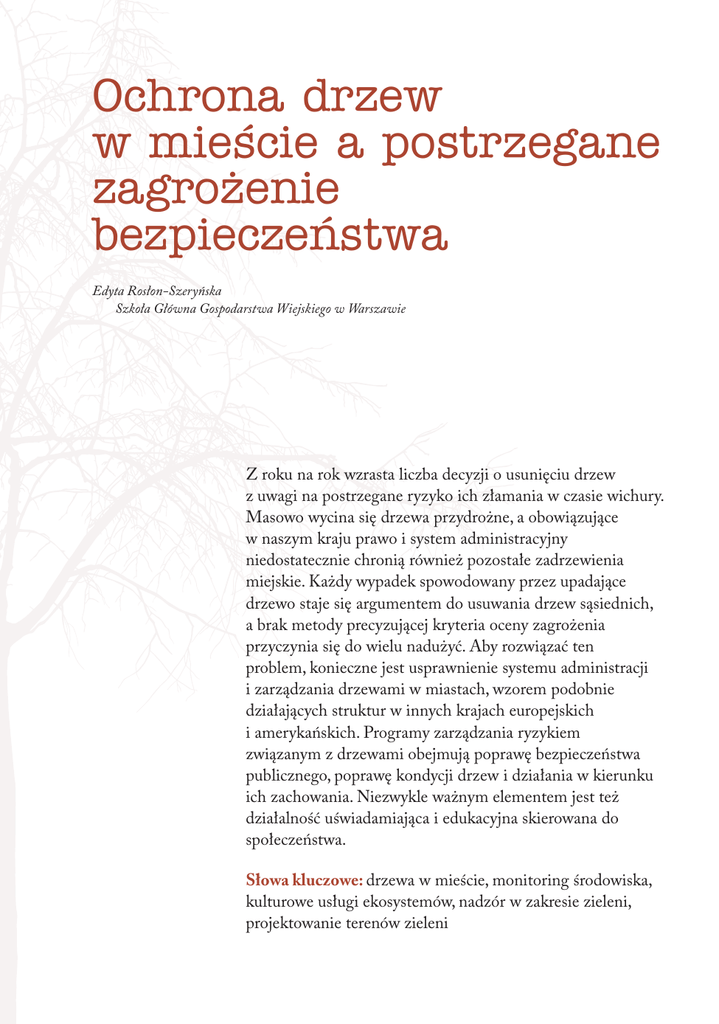 Ochrona drzew w mieście a postrzegane zagrożenie bezpieczeństwa Edyta Rosłon-Szeryńska Szkoła Główna Gospodarstwa Wiejskiego w Warszawie Z roku na rok wzrasta liczba decyzji o usunięciu drzew z uwagi na postrzegane ryzyko ich złamania w czasie wichury. Masowo wycina się drzewa przydrożne, a obowiązujące w naszym kraju prawo i system administracyjny niedostatecznie chronią również pozostałe zadrzewienia miejskie. Każdy wypadek spowodowany przez upadające drzewo staje się argumentem do usuwania drzew sąsiednich, a brak metody precyzującej kryteria oceny zagrożenia przyczynia się do wielu nadużyć. Aby rozwiązać ten problem, konieczne jest usprawnienie systemu administracji i zarządzania drzewami w miastach, wzorem podobnie działających struktur w innych krajach europejskich i amerykańskich. Programy zarządzania ryzykiem związanym z drzewami obejmują poprawę bezpieczeństwa publicznego, poprawę kondycji drzew i działania w kierunku ich zachowania. Niezwykle ważnym elementem jest też działalność uświadamiająca i edukacyjna skierowana do społeczeństwa. Słowa kluczowe: drzewa w mieście, monitoring środowiska, kulturowe usługi ekosystemów, nadzór w zakresie zieleni, projektowanie terenów zieleni Ochrona drzew w mieście a postrzegane zagrożenie bezpieczeństwa w drzewie i jego otoczeniu. Z tego samego powodu, niewystarczające do skutecznego zarządzania drzePodczas wichur najczęstszym problemem są łamiące wami wydają się również dane o drzewach, wprosię drzewa, dlatego liczba decyzji o ich usunięciu wadzane w wielu miastach do systemu informacji z roku na rok wzrasta. Od wielu lat toczą się dys- przestrzennej (GIS). Sytuacji nie poprawia brak regulacji w zakresie kusje wokół zielonych alei lub szpalerów wzdłuż dróg i ulic, a każdy wypadek spowodowany przez kwalifikacji zawodowych arborysty, trudniącego się upadające drzewo staje się argumentem do usuwa- oceną statyki i pielęgnacją drzew. Można spotkać nia drzew sąsiednich. opracowania zawierające nieprecyzyjną terminoZagrożenie bezpieczeństwa to obecnie jedna logię, będącą efektem wiernego tłumaczenia euroz głównych przyczyn usuwania drzew. Związane jest pejskich lub amerykańskich pojęć, bez podparcia to z odpowiedzialnością finansową się stuletnim polskim dorobkiem właściciela terenu za szkody spowo- Drzewa ocenia się okazyjnie, w zakresie klasyfikacji jakościowej dowane przez drzewo, w przypadku głównie w procesie inwesty- drewna i bez wykorzystania wypraudowodnienia zaniedbania w jego cyjnym lub na wniosek wła- cowanej od ponad półwiecza precypielęgnacji i utrzymaniu. W pol- ściciela terenu. zyjnej nomenklatury wad drewna skim prawie1 wymienia się drzewa, opisanej w polskich, a dziś też w euktóre zagrażają bezpieczeństwu urządzeń, ludzi lub ropejskich, normach i klasyfikacjach2. To wprowadza mienia oraz ruchu drogowego, kolejowego i żeglugi. zamęt i dezorientację wśród pracowników adminiIch usunięcie wymaga zezwolenia z gminy, ale bez stracji, którzy tracą możliwość weryfikacji jakości ponoszenia opłat z tego tytułu. Jednak brak metody opracowań eksperckich w zakresie diagnozy drzew. precyzującej kryteria oceny zagrożenia przyczynia Pochopne usuwanie drzew spowodowane jest basię do wielu nadużyć. Pod pretekstem zagrożenia rierami społecznymi, związanymi z postrzeganiem bezpieczeństwa usuwa się drzewa, których wycięcie drzew jako problemu. Wynika to w dużej mierze jest wygodne, ponieważ kolidują z planowaną w da- z niskiej świadomości społecznej na temat znaczenia nym miejscu budową, infrastrukturą podziemną, drzew dla naszego życia, a także z niewiedzy o zasaocieniają wnętrze budynków, zaśmiecają teren opa- dach ich prawidłowej pielęgnacji i ochrony. Sytuacji dającymi liśćmi lub owocami itp. nie poprawia narastające w dobie cyfryzacji zjawisko Brak szczegółowej wiedzy na temat ryzyka odwrotu dzieci od przyrody (Louv 2005). Poznanie wypadkowego i przyczyn osłabienia statyki drzew przez bezpośrednie doświadczenie jest bowiem jedyprowadzi do uogólnień. Za zagrażające bezpieczeń- nym sposobem na nabranie szacunku i pokory wobec stwu uznaje się wszystkie kruche i krótkowieczne środowiska przyrodniczego. Opinię społeczną kształgatunki drzew, bez względu na ich stan i warunki tują również nagłaśniane przez media jednostkowe siedliskowe, w jakich żyją. Rzadko szacuje się też przypadki wypadków śmiertelnych spowodowanych poziom ryzyka wypadku, ograniczając ocenę drzewa przez wiatrołomy, demonizujące skalę zagrożenia. do badania jego statyki, przy zastosowaniu mniej lub bardziej obiektywnych metod. Drzewa ocenia się okazyjnie, głównie w procesie inwestycyjnym lub Jak rozwiązać problem? na wniosek właściciela terenu. Nawet jeśli niektóre miasta prowadzą coroczny przegląd zadrzewień Podstawowe znaczenie w rozwiązaniu przedstawio(zwłaszcza przydrożnych), to przeprowadzenie nego problemu ma usprawnienie systemu adminioceny drzew ma charakter subiektywny i nie po- stracji i zarządzania drzewami w miastach, wzorem zwala na bieżący monitoring zmian zachodzących podobnie działających struktur w krajach europej- Wprowadzenie Ustawa o ochronie przyrody (Dz. U. 2004 nr 92, poz. 880), art. 86, pkt. 4 i 5. Szczegółową klasyfikację drewna użytkowego (wówczas drewno towarne) i odpadowego (zwanego materyałem) po raz pierwszy przedstawił Nowicki w 1913 r., pierwsza polska norma autorstwa Emilii Stebnickiej, opisująca wady drewna, powstała w 1954 r. Stanowi ona podwalinę dzisiejszych norm polskiego brakarstwa. 1 2 52 | Zrównoważony Rozwój — Zastosowania nr 4, 2013 Edyta Rosłon-Szeryńska skich i amerykańskich. W Niemczech w zakres kontroli drzew miejskich wchodzi ocena bezpieczeństwa, której forma została określona w polityce kontroli drzew (Baumkontrollrichtlinie). Inspektorzy, zajmujący się pielęgnacją i oceną drz