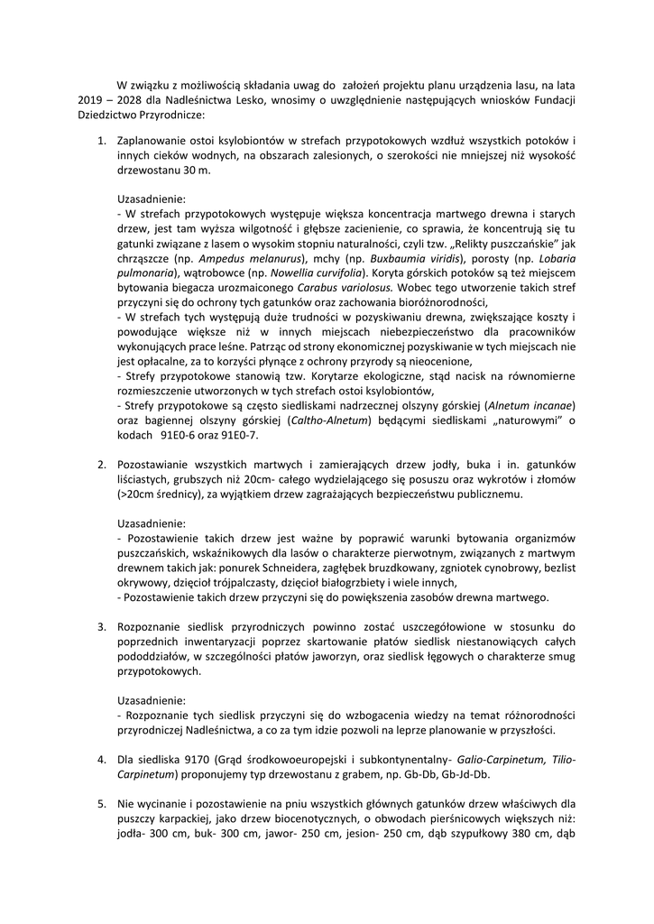 W związku z możliwością składania uwag do założeń projektu planu urządzenia lasu, na lata 2019 – 2028 dla Nadleśnictwa Lesko, wnosimy o uwzględnienie następujących wniosków Fundacji Dziedzictwo Przyrodnicze: 1. Zaplanowanie ostoi ksylobiontów w strefach przypotokowych wzdłuż wszystkich potoków i innych cieków wodnych, na obszarach zalesionych, o szerokości nie mniejszej niż wysokość drzewostanu 30 m. Uzasadnienie: - W strefach przypotokowych występuje większa koncentracja martwego drewna i starych drzew, jest tam wyższa wilgotność i głębsze zacienienie, co sprawia, że koncentrują się tu gatunki związane z lasem o wysokim stopniu naturalności, czyli tzw. „Relikty puszczańskie” jak chrząszcze (np. Ampedus melanurus), mchy (np. Buxbaumia viridis), porosty (np. Lobaria pulmonaria), wątrobowce (np. Nowellia curvifolia). Koryta górskich potoków są też miejscem bytowania biegacza urozmaiconego Carabus variolosus. Wobec tego utworzenie takich stref przyczyni się do ochrony tych gatunków oraz zachowania bioróżnorodności, - W strefach tych występują duże trudności w pozyskiwaniu drewna, zwiększające koszty i powodujące większe niż w innych miejscach niebezpieczeństwo dla pracowników wykonujących prace leśne. Patrząc od strony ekonomicznej pozyskiwanie w tych miejscach nie jest opłacalne, za to korzyści płynące z ochrony przyrody są nieocenione, - Strefy przypotokowe stanowią tzw. Korytarze ekologiczne, stąd nacisk na równomierne rozmieszczenie utworzonych w tych strefach ostoi ksylobiontów, - Strefy przypotokowe są często siedliskami nadrzecznej olszyny górskiej (Alnetum incanae) oraz bagiennej olszyny górskiej (Caltho-Alnetum) będącymi siedliskami „naturowymi” o kodach 91E0-6 oraz 91E0-7. 2. Pozostawianie wszystkich martwych i zamierających drzew jodły, buka i in. gatunków liściastych, grubszych niż 20cm- całego wydzielającego się posuszu oraz wykrotów i złomów (>20cm średnicy), za wyjątkiem drzew zagrażających bezpieczeństwu publicznemu. Uzasadnienie: - Pozostawienie takich drzew jest ważne by poprawić warunki bytowania organizmów puszczańskich, wskaźnikowych dla lasów o charakterze pierwotnym, związanych z martwym drewnem takich jak: ponurek Schneidera, zagłębek bruzdkowany, zgniotek cynobrowy, bezlist okrywowy, dzięcioł trójpalczasty, dzięcioł białogrzbiety i wiele innych, - Pozostawienie takich drzew przyczyni się do powiększenia zasobów drewna martwego. 3. Rozpoznanie siedlisk przyrodniczych powinno zostać uszczegółowione w stosunku do poprzednich inwentaryzacji poprzez skartowanie płatów siedlisk niestanowiących całych pododdziałów, w szczególności płatów jaworzyn, oraz siedlisk łęgowych o charakterze smug przypotokowych. Uzasadnienie: - Rozpoznanie tych siedlisk przyczyni się do wzbogacenia wiedzy na temat różnorodności przyrodniczej Nadleśnictwa, a co za tym idzie pozwoli na leprze planowanie w przyszłości. 4. Dla siedliska 9170 (Grąd środkowoeuropejski i subkontynentalny- Galio-Carpinetum, TilioCarpinetum) proponujemy typ drzewostanu z grabem, np. Gb-Db, Gb-Jd-Db. 5. Nie wycinanie i pozostawienie na pniu wszystkich głównych gatunków drzew właściwych dla puszczy karpackiej, jako drzew biocenotycznych, o obwodach pierśnicowych większych niż: jodła- 300 cm, buk- 300 cm, jawor- 250 cm, jesion- 250 cm, dąb szypułkowy 380 cm, dąb bezszypułkowy 300 cm, grab- 190 cm, poza sytuacjami gdy drzewa takie zagrażają bezpieczeństwu publicznemu. Uzasadnienie: - Drzewa o wymiarach pomnikowych pełnią bardzo wiele funkcji biocenotycznych- są mieszkaniem i środowiskiem życia wielu grup organizmów, od gryzoni, przez ptaki po owady. Są także najczęstszym miejscem występowania rzadkich organizmów, w Polsce prawnie chronionych, a także często zagrożonych wyginięciem, takich jak np. granicznik płucnik, puchlinka ząbkowana, brodaczki, kobierniki, odnożyce, nibypłucnik i wiele innych, - Drzewa o powyższych wymiarach najczęściej są drzewami o bardzo słabej wartości technicznej i koszty ich pozyskania oraz zrywki są często wyższe niż zysk z ich pozyskania. Wobec tego wątpliwy zysk z pozyskania tego rodzaju drzew jest niewspółmierny z wielkim zyskiem przyrodniczym który wiąże się z pozostawieniem tych drzew na pniu. 6. Wyłączenie w całości siedliska przyrodniczego 9180 (Jaworzyny i lasy klonowo-lipowe na stromych stokach i zboczach- Tilio plathyphyllis- Acerion pseudoplatani) wraz z 50 metrowym buforem do gospodarstwa specjalnego bez wskazań gospodarczych. Uzasadnienie: - Jaworzyny są siedliskami bardzo wrażliwymi na zmianę warunków glebowych, wilgotnościowych i świetlnych. Siedlisko narażone jest na wiele zagrożeń, jak np. przypadkowe przeprowadzenie drogi zrywkowej, która może przyczynić się do odwodnienia terenu i zaniku siedliska. Włączenie w całości tego siedliska do gospodarstwa specjalnego bez wskazań gospodarczych, wraz z utworzeniem strefy buforowej pozwoli na zapobieżenie ewentualnym zmianom w siedlisku i zachowaniu unikalnego charakteru jaworzyn. - Jaworzyny porastają prawie zawsze strome stoki i miejsca wilgotne, w których pozyskiwanie drewna jest bardzo utrudnione lub wręcz niemożliwe, oraz niebezpieczne dla osób prowadzących prace leśne, - Działanie tego typu wpłynie nie tylko na poprawę ochrony samych jaworzyn, ale również pozwoli na zwiększenie ilości wielkowymiarowego drewna martwego w ich sąsiedztwie a co za tym idzie poprawienie warunków bytowania wielu saproksylobiontów, co z kolei wpłynie na zachowanie bioróżnorodności, - Zbiorowiska jaworzyny górskiej są zbiorowiskami o bardzo małej łącznej powierzchni, i stanowią marginalny ułamek całej powierzchni Nadleśnictwa. Włączenie w całości siedliska przyrodniczego 9180 wraz z 50 metrowym buforem do gospodarstwa specjalnego bez wskazań gospodarczych, nie zmniejszy istotnie powierzchni gospodarowania, za 