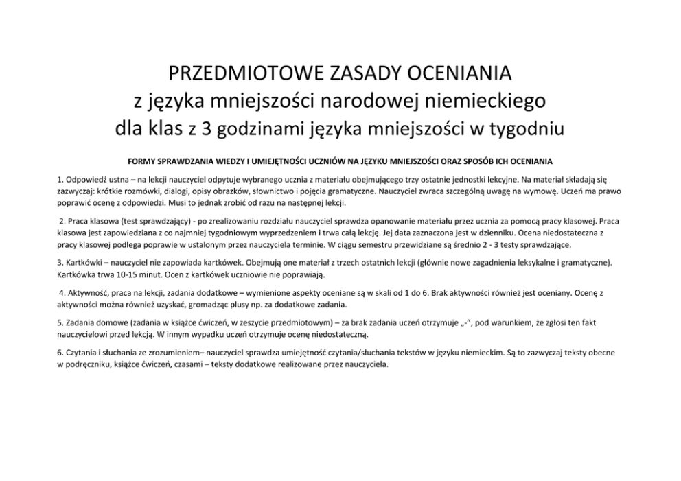 PRZEDMIOTOWE ZASADY OCENIANIA z języka mniejszości narodowej niemieckiego dla klas z 3 godzinami języka mniejszości w tygodniu FORMY SPRAWDZANIA WIEDZY I UMIEJĘTNOŚCI UCZNIÓW NA JĘZYKU MNIEJSZOŚCI ORAZ SPOSÓB ICH OCENIANIA 1. Odpowiedź ustna – na lekcji nauczyciel odpytuje wybranego ucznia z materiału obejmującego trzy ostatnie jednostki lekcyjne. Na materiał składają się zazwyczaj: krótkie rozmówki, dialogi, opisy obrazków, słownictwo i pojęcia gramatyczne. Nauczyciel zwraca szczególną uwagę na wymowę. Uczeń ma prawo poprawić ocenę z odpowiedzi. Musi to jednak zrobić od razu na następnej lekcji. 2. Praca klasowa (test sprawdzający) - po zrealizowaniu rozdziału nauczyciel sprawdza opanowanie materiału przez ucznia za pomocą pracy klasowej. Praca klasowa jest zapowiedziana z co najmniej tygodniowym wyprzedzeniem i trwa całą lekcję. Jej data zaznaczona jest w dzienniku. Ocena niedostateczna z pracy klasowej podlega poprawie w ustalonym przez nauczyciela terminie. W ciągu semestru przewidziane są średnio 2 - 3 testy sprawdzające. 3. Kartkówki – nauczyciel nie zapowiada kartkówek. Obejmują one materiał z trzech ostatnich lekcji (głównie nowe zagadnienia leksykalne i gramatyczne). Kartkówka trwa 10-15 minut. Ocen z kartkówek uczniowie nie poprawiają. 4. Aktywność, praca na lekcji, zadania dodatkowe – wymienione aspekty oceniane są w skali od 1 do 6. Brak aktywności również jest oceniany. Ocenę z aktywności można również uzyskać, gromadząc plusy np. za dodatkowe zadania. 5. Zadania domowe (zadania w książce ćwiczeń, w zeszycie przedmiotowym) – za brak zadania uczeń otrzymuje „-”, pod warunkiem, że zgłosi ten fakt nauczycielowi przed lekcją. W innym wypadku uczeń otrzymuje ocenę niedostateczną. 6. Czytania i słuchania ze zrozumieniem– nauczyciel sprawdza umiejętność czytania/słuchania tekstów w języku niemieckim. Są to zazwyczaj teksty obecne w podręczniku, książce ćwiczeń, czasami – teksty dodatkowe realizowane przez nauczyciela. PROCENTOWA SKALA OCEN PRAC PISEMNYCH (testów, sprawdzianów) % z maksymalnej liczby punktów Ocena Skrót więcej niż 100% Celujący 6 (cel.) 98 - 100% bardzo dobry+ +5 (+bdb.) 89 - 97% bardzo dobry 5 (bdb.) 85 - 88% dobry + +4 (+db.) 73 - 84% dobry 4 (db.) 67 - 72% dostateczny + +3 (+dst.) 50 - 66% dostateczny 3 (dst.) 44 - 49% dopuszczający+ +2 (+dop.) 31 - 43% dopuszczający 2 (dop.) mniej niż 30% niedostateczny 1 (ndst.) Cel kształcenia według podstawy programowej: I Świadomość własnego dziedzictwa narodowego lub etnicznego. Ocena niedostateczna Ocena dopuszczająca Ocena dostateczna Ocena dobra Ocena bardzo dobra Nie zna utworów Zna nieliczne utwory Zna liczne utwory Zna większość Zna i wypowiada się na literackich i innych literackie i inne teksty literackie i inne teksty utworów literackich i temat utworów tekstów kultury kultury kultury innych tekstów kultury literackich i innych tekstów kultury Ocena celująca Zna i wypowiada się na temat utworów literackich i innych tekstów kultury wykraczających poza podstawę programową Nie zna podstawy Zna nieliczne podstawy Opanował Zna podstawy kultury i Bardzo dobrze zna Posiada wiedzę kultury i historii kultury i historii najważniejsze historii narodowej lub podstawy kultury i wykraczającą poza narodowej lub narodowej lub podstawy kultury i etnicznej historii narodowej lub podstawy kultury i etnicznej etnicznej historii narodowej lub (bohaterowie, etnicznej historii narodowej lub (bohaterowie, (bohaterowie, etnicznej wydarzenia, symbole, (bohaterowie, etnicznej wydarzenia, symbole, wydarzenia, symbole, (bohaterowie, legendy). wydarzenia, symbole, (bohaterowie, legendy). legendy). wydarzenia, symbole, legendy). wydarzenia, symbole, legendy). legendy). Cel kształcenia według podstawy programowej: II Odbiór wypowiedzi i wykorzystanie zawartych w nich informacji Ocena niedostateczna Ocena dopuszczająca Ocena dostateczna Ocena dobra Ocena bardzo dobra Ocena celująca Nie rozumie czytanych Słabo rozumie czytany Częściowo potrafi Czyta teksty ze Czyta teksty ze Czyta teksty z tekstów, nie potrafi tekst, nie potrafi zrozumieć czytany zrozumieniem ich zrozumieniem ich zrozumieniem ich zidentyfikować zidentyfikować tekst, czasem potrafi treści oraz intencji treści oraz intencji treści oraz intencji nadawcy, nie nadawcy, nie zidentyfikować nadawcy; potrafi nadawcy; potrafi nadawcy; potrafi wypowiada własnego wypowiada własnego nadawcę, krótko wyrazić własne wyrazić własne zdanie wyrazić własne zdanie zdania na temat zdania na temat zaprezentować własne zdanie na temat tekstu na temat tekstu oraz na temat tekstu oraz przeczytanego tekstu, przeczytanego tekstu, zdanie na temat oraz określić temat określić temat tekstu. określić temat tekstu. nie określa tematu słabo określa temat przeczytanego tekstu, tekstu. Czyta teksty danego tekstu. danego tekstu. określa temat danego wykraczające poza tekstu. Nie rozpoznaje i nie rozumie form gatunkowych – instrukcji (w tym przepis), zaproszenie, życzenia i gratulacje, zawiadomienie i ogłoszenie; Nie korzysta z informacji zawartych w encyklopediach i słownikach; Słabo rozpoznaje i słabo rozumie formy gatunkowe – instrukcję (w tym przepis), zaproszenie, życzenia i gratulacje, zawiadomienie i ogłoszenie; Rzadko korzysta z informacji zawartych w encyklopediach i słownikach; Nieprawidłowo akcentuje wyrazy oraz intonuje zdania, popełniając bardzo liczne błędy; Nie rozpoznaje podstawowych części mowy. Akcentuje wyrazy oraz intonuje zdania popełniające liczne błędy; Ocena niedostateczna Nie tworzy samodzielnie tekstów, nie formuje pytań. Słabo rozpoznaje podstawowe części mowy i nie wskazuje różnic między nimi; Rozpoznaje ale słabo rozumie formy gatunkowe – instrukcję (w tym przepis), zaproszenie, życzenia i gratulacje, zawiadomienie i ogłoszenie; Rozumie i czasem wykorzystuje informacje zawar