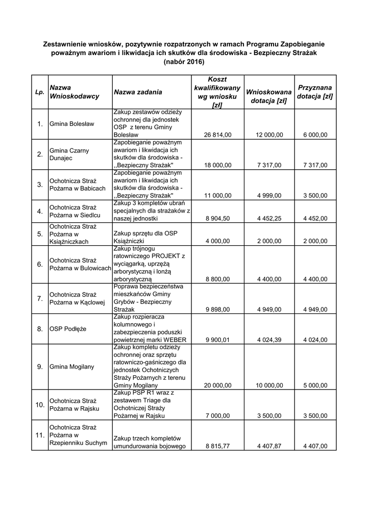 Zestawnienie wniosków, pozytywnie rozpatrzonych w ramach Programu Zapobieganie poważnym awariom i likwidacja ich skutków dla środowiska - Bezpieczny Strażak (nabór 2016) Lp. Nazwa Wnioskodawcy 1. Gmina Bolesław 2. 3. 4. Gmina Czarny Dunajec Ochotnicza Straż Pożarna w Babicach Ochotnicza Straż Pożarna w Siedlcu Nazwa zadania Zakup zestawów odzieży ochronnej dla jednostek OSP z terenu Gminy Bolesław Zapobieganie poważnym awariom i likwidacja ich skutków dla środowiska ,,Bezpieczny Strażak'' Zapobieganie poważnym awariom i likwidacja ich skutków dla środowiska ,,Bezpieczny Strażak'' Zakup 3 kompletów ubrań specjalnych dla strażaków z naszej jednostki Koszt Przyznana kwalifikowany Wnioskowana dotacja [zł] wg wniosku dotacja [zł] [zł] 26 814,00 12 000,00 6 000,00 18 000,00 7 317,00 7 317,00 11 000,00 4 999,00 3 500,00 8 904,50 4 452,25 4 452,00 4 000,00 2 000,00 2 000,00 8 800,00 4 400,00 4 400,00 9 898,00 4 949,00 4 949,00 9 900,01 4 024,39 4 024,00 20 000,00 10 000,00 5 000,00 7 000,00 3 500,00 3 500,00 8 815,77 4 407,87 4 407,00 Ochotnicza Straż Zakup sprzętu dla OSP Książniczki Zakup trójnogu ratowniczego PROJEKT z Ochotnicza Straż wyciągarką, uprzężą 6. Pożarna w Bulowicach arborystyczną i lonżą arborystyczną Poprawa bezpieczeństwa mieszkańców Gminy Ochotnicza Straż 7. Pożarna w Kąclowej Grybów - Bezpieczny Strażak Zakup rozpieracza kolumnowego i 8. OSP Podłęże zabezpieczenia poduszki powietrznej marki WEBER Zakup kompletu odzieży ochronnej oraz sprzętu ratowniczo-gaśniczego dla 9. Gmina Mogilany jednostek Ochotniczych Straży Pożarnych z terenu Gminy Mogilany Zakup PSP R1 wraz z zestawem Triage dla Ochotnicza Straż 10. Ochotniczej Straży Pożarna w Rajsku Pożarnej w Rajsku 5. Pożarna w Książniczkach Ochotnicza Straż 11. Pożarna w Rzepienniku Suchym Zakup trzech kompletów umundurowania bojowego 12. 13. 14. 15. 16. 17. 18. 19. 20. 21. 22. Doposażenie jednostki Ochotniczej Straży Ochotnicza Straż Pożarnej w Borkach w Pożarna w Borkach odzież ochronną do działań bojowych Doposażenie jednostki Ochotniczej Straży Ochotnicza Straż Pożarnej w Brzezówce w Pożarna w Brzezówce odzież ochronną do działań bojowych Sprzęt ratowniczo-gaśniczy szansą na bezpieczne i Ochotnicza Straż Pożarna w Wysokiej efektywne akcje ratowniczogaśnicze Ochotnicza Straż Doposażenie jednostki Pożarna w OSP w umundurowanie Bobrownikach bojowe strażaków Wielkich Doposażenie jednostki Ochotniczej Straży Ochotnicza Straż Pożarnej w Suchym Pożarna w Suchym Gruncie w odzież ochronną Gruncie do działań bojowych. Zakup odzieży ochronnej do działań bojowych dla Jednostki Ochotniczej Gmina Jordanów Straży Pożarnej w Naprawie Doposażenie jednostki Ochotniczej Straży Ochotnicza Straż Pożarnej w Lubaszu w Pożarna w Lubaszu odzież ochronną do działań bojowych Doposażenie jednostki Ochotniczej Straży Ochotnicza Straż Pożarnej w Zabrniu w Pożarna w Zabrniu odzież ochronną do działań bojowych Doposażenie jednostki Ochotniczej Straży Ochotnicza Straż Pożarnej w Laskówce Pożarna w Laskówce Delastowskiej w odzież Delastowskiej ochronną do działań bojowych Ochotnicza Straż Pożarna w Grabiu Gmina Kalwaria Zebrzydowska Doposażenie medyczne jednostki Ochotniczej Straży Pożarnej w Grabiu (gm. Wieliczka) w zestaw ratownictwa medycznego PSP R-1 z deską, zgodny z wytycznymi wyposażenia Zakup 15 zestawów odzieży ochronnej dla 5 jednostek Ochotniczych Straży Pożarnej w Gminie Kalwaria Zebrzydowska. 6 000,00 3 000,00 3 000,00 6 000,00 3 000,00 3 000,00 10 240,00 5 000,00 5 000,00 2 606,37 1 303,00 1 303,00 6 000,00 3 000,00 3 000,00 3 000,00 1 500,00 1 500,00 6 000,00 3 000,00 3 000,00 6 000,00 3 000,00 3 000,00 6 000,00 3 000,00 3 000,00 5 980,00 2 990,00 2 990,00 45 000,00 22 500,00 4 500,00 Zapobieganie poważnym awariom i likwidacja ich 23. Gmina Ropa skutków dla środowiska Bezpieczny Strażak Bezpieczny strażak- Zakup odzieży ochronnej dla OSP 24. Gmina Rabka-Zdrój z terenu Gminy RabkaZdrój Zakup zestawu ratownictwa medycznego PSP-R1 Ochotnicza Straż (torba medyczna z 25. Pożarna Siersza w wyposażeniem, deska Trzebini ortopedyczna i szyny Kramera) Zakup sprzętu i odzieży specjalnej dla jednostek Gmina Kłaj 26. OSP z Gminy Kłaj Zapobieganie poważnym awariom i likwidacja ich 27. Gmina Stary Sącz skutków dla środowiska Bezpieczny Strażak Zakup odzieży ochronnej 28. Gmina Lisia Góra do działań bojowych Zakup sprzętu ratowniczogaśniczego dla jednostki Ochotnicza Straż 29. Pożarna w Szymbarku Ochotniczej Straży Pożarnej w Szymbarku Zapobieganie poważnym awariom - i likwidacja ich Ochotnicza Straż 30. Pożarna w Jachówce skutków dla środowiska Bezpieczny Strażak Zapobieganie poważnym awariom i likwidacja ich Ochotnicza Straż 31. Pożarna w Baczynie skutków dla środowiska Bezpieczny Strażak Zakup odzieży ochronnej do działań bojowych dla Jednostek Ochotniczych 32. Gmina Łącko Straży Pożarnych w Gminie Łącko 33. Gmina Szerzyny 34. Powiat Chrzanowski Podniesienie jakości wykonywanej pracy jednostek straży pożarnych z terenu Gminy Szerzyny poprzez zakup 3 zestawów odziezy ochronnej dla 3 jednostek OSP Wyposażenie strażaków Ochotniczych Straży pożarnych włączonych do krajowego Systemu Ratownictwa Gaśniczego z terenu gmin Alwernia Babice Libiąż w odzież ochronną do zadań bojowych. 13 710,00 4 500,00 4 500,00 27 000,00 13 500,00 12 000,00 6 400,00 3 200,00 3 200,00 28 966,70 9 483,35 9 483,00 21 896,10 10 500,00 10 500,00 25 538,49 12 768,00 12 000,00 10 000,00 5 000,00 5 000,00 9 065,00 4 532,50 4 532,00 5 100,00 2 550,00 2 550,00 24 000,00 12 000,00 12 000,00 9 000,00 4 500,00 4 500,00 36 000,00 18 000,00 16 500,00 35. Gmina Łososina Dolna Poprawa bezpieczeństwa jednostki Ochotniczej Straży Pożarnej w Tabaszowej - Gmina Łososina Dolna poprzez zakup sprzętu ratowniczo gaśniczego Poprawa bezpieczeństwa Ochotnicza Straż mieszkańców Mi