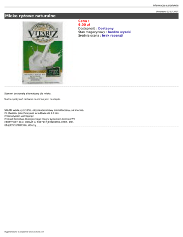 Informacje o produkcie Utworzono 03-03-2017 Mleko ryżowe naturalne Cena : 9.00 zł Dostępność : Dostępny Stan magazynowy : bardzo wysoki Średnia ocena : brak recenzji Stanowi doskonałą alternatywę dla mleka. Można spożywać zarówno na zimno jak i na ciepło. SKŁAD: woda, ryż (11%), olej słonecznikowy zimnotłoczony, sól morska. Po otwarciu przechowywać w lodówce do 3-4 dni. Przed użyciem wstrząsnąć. Produkt Rolnictwa Ekologicznego Objęty Systemem Kontroli WE CERTYFIKAT: D.M. MIRAAF nr 9697172 JEDNOSTKA CERT.: IMC. KRAJ POCHODZENIA: Włochy Wygenerowano w programie www.oscGold.com