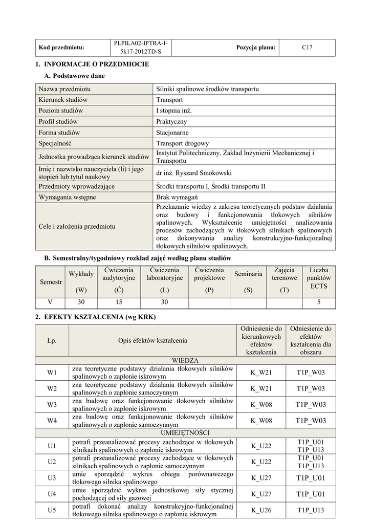 PLPILA02-IPTRA-I5k17-2012TD-S Kod przedmiotu: C17 Pozycja planu: 1. INFORMACJE O PRZEDMIOCIE A. Podstawowe dane Nazwa przedmiotu Silniki spalinowe środków transportu Kierunek studiów Transport Poziom studiów I stopnia inż. Profil studiów Praktyczny Forma studiów Stacjonarne Specjalność Transport drogowy Instytut Politechniczny, Zakład Inżynierii Mechanicznej i Transportu Jednostka prowadząca kierunek studiów Imię i nazwisko nauczyciela (li) i jego stopień lub tytuł naukowy Przedmioty wprowadzające dr inż. Ryszard Smokowski Środki transportu I, Środki transportu II Wymagania wstępne Brak wymagań Przekazanie wiedzy z zakresu teoretycznych podstaw działania oraz budowy i funkcjonowania tłokowych silników spalinowych. Wykształcenie umiejętności analizowania procesów zachodzących w tłokowych silnikach spalinowych oraz dokonywania analizy konstrukcyjno-funkcjonalnej tłokowych silników spalinowych. Cele i założenia przedmiotu B. Semestralny/tygodniowy rozkład zajęć według planu studiów Wykłady Ćwiczenia audytoryjne Ćwiczenia laboratoryjne Ćwiczenia projektowe Seminaria Zajęcia terenowe (W) (Ć) (L) (P) (S) (T) 30 15 30 Semestr V Liczba punktów ECTS 5 2. EFEKTY KSZTAŁCENIA (wg KRK) Lp. W1 W2 W3 W4 U1 U2 U3 U4 U5 Opis efektów kształcenia WIEDZA zna teoretyczne podstawy działania tłokowych silników spalinowych o zapłonie iskrowym zna teoretyczne podstawy działania tłokowych silników spalinowych o zapłonie samoczynnym zna budowę oraz funkcjonowanie tłokowych silników spalinowych o zapłonie iskrowym zna budowę oraz funkcjonowanie tłokowych silników spalinowych o zapłonie samoczynnym UMIEJĘTNOŚCI potrafi przeanalizować procesy zachodzące w tłokowych silnikach spalinowych o zapłonie iskrowym potrafi przeanalizować procesy zachodzące w tłokowych silnikach spalinowych o zapłonie samoczynnym umie sporządzić wykres obiegu porównawczego tłokowego silnika spalinowego umie sporządzić wykres jednostkowej siły stycznej pochodzącej od siły gazowej potrafi dokonać analizy konstrukcyjno-funkcjonalnej tłokowego silnika spalinowego o zapłonie iskrowym Odniesienie do kierunkowych efektów kształcenia Odniesienie do efektów kształcenia dla obszaru K_W21 T1P_W03 K_W21 T1P_W03 K_W08 T1P_W03 K_W08 T1P_W03 K_U22 K_U22 T1P_U01 T1P_U13 T1P_U01 T1P_U13 K_U27 T1P_U01 K_U27 T1P_U01 K_U26 T1P_U13 U6 U7 U8 K1 K2 potrafi dokonać analizy konstrukcyjno-funkcjonalnej tłokowego silnika spalinowego o zapłonie samoczynnym umie stosować zasady bezpieczeństwa i higieny pracy ma umiejętność samokształcenia się KOMPETENCJE SPOŁECZNE potrafi współpracować w zespole potrafi odpowiednio określić priorytety służące realizacji określonego przez siebie lub innych zadania K_U26 T1P_U13 K_U18 K_U06 T1P_U11 T1P_U05 K_K03 T1P_K03 K_K04 T1P_K04 3. METODY DYDAKTYCZNE Wykład z wykorzystaniem środków audiowizualnych, pokaz z omówieniem, zajęcia ćwiczeniowe, ćwiczenia laboratoryjne, opracowania własne w formie pisemnej lub elektronicznej, dyskusja. 4. FORMA I WARUNKI ZALICZENIA PRZEDMIOTU Zaliczenie ćwiczeń audytoryjnych na podstawie zrealizowanych zadań obliczeniowo-wykreślnych. Zaliczenie ćwiczeń laboratoryjnych na podstawie zaliczeń poszczególnych ćwiczeń laboratoryjnych (przygotowanie do zajęć, udział w zajęciach, sprawozdania). Egzamin z przedmiotu w formie ustnej. Warunkiem przystąpienia do egzaminu jest pozytywne zaliczenie ćwiczeń audytoryjnych i ćwiczeń laboratoryjnych. 5. TREŚCI KSZTAŁCENIA Wykłady Rodzaje silników spalinowych. Podział tłokowych silników spalinowych. Zasada działania tłokowego silnika dwusuwowego. Zasada działania tłokowego silnika czterosuwowego. Obiegi teoretyczne, porównawcze i rzeczywiste tłokowych silników spalinowych. Analiza parametrów procesów zachodzących w tłokowych silnikach spalinowych. Silniki o zapłonie iskrowym i samoczynnym zasada działania, tworzenie mieszaniny palnej, spalanie, komory spalania silników. Wskaźniki pracy silnika. Średnie ciśnienie indykowane i średnie ciśnienie użyteczne. Prędkość obrotowa silnika. Moc indykowana i moc użyteczna. Moment obrotowy silnika. Sprawności silnika. Godzinowe i jednostkowe zużycie paliwa. Bilans cieplny silnika. Toksyczne składniki spalin. Doładowanie silników. Charakterystyki tłokowych silników spalinowych. Charakterystyki prędkościowe. Charakterystyki obciążeniowe. Charakterystyki regulacyjne. Elastyczność silnika. Układ korbowy. Kadłuby i głowice. Układy dolotowe i wylotowe. Rozrząd silników. Układy zasilania silników o zapłonie iskrowym i samoczynnym. Układy chłodzenia. Układy olejenia. Podstawowe założenia projektu silnika. Tok projektowania. Projektowanie wykresu obiegu porównawczego tłokowego silnika spalinowego. Obliczanie głównych wymiarów tłokowego silnika spalinowego. Sporządzanie wykresu sił stycznych. Obliczanie tłoków. Analiza konstrukcyjno - funkcjonalna tłokowego silnika spalinowego. Regulacje tłokowych silników spalinowych. Układy ograniczające emisję toksycznych składników spalin. Wtryskowe układy zasilania silników o zapłonie iskrowym. Układy zasilania silników o zapłonie samoczynnym. Badania i regulacje aparatury wtryskowej silników o zapłonie samoczynnym. Pomiary wskaźników pracy silnika na hamowni silnikowej. Ćwiczenia audytoryjne Ćwiczenia laboratoryjne 6. METODY WERYFIKACJI EFEKTÓW KSZTAŁCENIA (dla każdego efektu kształcenia umieszczonego na liście efektów kształcenia powinny znaleźć się metody sprawdzenia, czy został on osiągnięty przez studenta) Efekt kształcenia Egzamin ustny W1 W2 x x Egzamin pisemny Forma oceny (podano przykładowe) Zadania Ćwiczenia Kolokwium obliczeniowolaboratoryjne wykreślne x x Strona 2 z 3 Sprawozdanie z ćwiczenia laboratoryjnego W3 W4 U1 U2 U3 U4 U5 U6 U7 U8 K1 K2 x x x x x x x x x x x x x x x x x x x 7. LITERATURA Literatura podstawowa 1. Wajand J. A., Wajand J. T.: Tłokowe siln