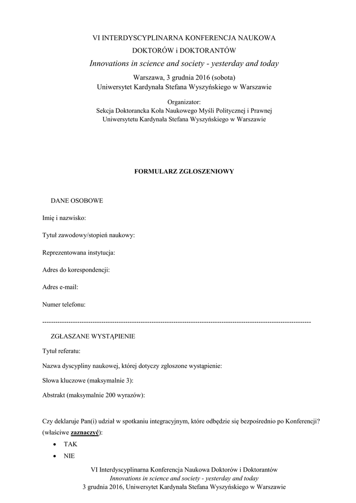 VI INTERDYSCYPLINARNA KONFERENCJA NAUKOWA DOKTORÓW i DOKTORANTÓW Innovations in science and society - yesterday and today Warszawa, 3 grudnia 2016 (sobota) Uniwersytet Kardynała Stefana Wyszyńskiego w Warszawie Organizator: Sekcja Doktorancka Koła Naukowego Myśli Politycznej i Prawnej Uniwersytetu Kardynała Stefana Wyszyńskiego w Warszawie FORMULARZ ZGŁOSZENIOWY DANE OSOBOWE Imię i nazwisko: Tytuł zawodowy/stopień naukowy: Reprezentowana instytucja: Adres do korespondencji: Adres e-mail: Numer telefonu: --------------------------------------------------------------------------------------------------------------------------ZGŁASZANE WYSTĄPIENIE Tytuł referatu: Nazwa dyscypliny naukowej, której dotyczy zgłoszone wystąpienie: Słowa kluczowe (maksymalnie 3): Abstrakt (maksymalnie 200 wyrazów): Czy deklaruje Pan(i) udział w spotkaniu integracyjnym, które odbędzie się bezpośrednio po Konferencji? (właściwe zaznaczyć): TAK NIE VI Interdyscyplinarna Konferencja Naukowa Doktorów i Doktorantów Innovations in science and society - yesterday and today 3 grudnia 2016, Uniwersytet Kardynała Stefana Wyszyńskiego w Warszawie INFORMACJE ORGANIZACYJNE Udział w VI Interdyscyplinarnej Konferencji Naukowej Doktorów i Doktorantów „Innovations in science and society - yesterday and today” jest bezpłatny. Zgłoszenie należy kierować na adres: [email protected] do dnia 14 listopada 2016 r. Organizatorzy zastrzegają sobie prawo wyboru referatów. Liczba wystąpień jest ograniczona (Organizatorzy uwzględniają również kolejność zgłoszeń). Terminarz 14 listopada 2016: ostateczny termin nadsyłania zgłoszeń 18 listopada 2016: informacja o przyjęciu referatu 26 listopada 2016: przesłanie programu Konferencji 3 grudnia 2016: VI Interdyscyplinarna Konferencja Naukowa Doktorów i Doktorantów „Innovations in science and society - yesterday and today” VI Interdyscyplinarna Konferencja Naukowa Doktorów i Doktorantów Innovations in science and society - yesterday and today 3 grudnia 2016, Uniwersytet Kardynała Stefana Wyszyńskiego w Warszawie