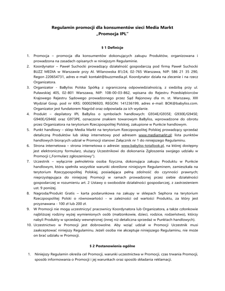 Regulamin promocji dla konsumentów sieci Media Markt „Promocja IPL” § 1 Definicje 1. Promocja – promocja dla konsumentów dokonujących zakupu Produktów, organizowana i prowadzona na zasadach opisanych w niniejszym Regulaminie. 2. Koordynator – Paweł Suchocki prowadzący działalność gospodarczą pod firmą Paweł Suchocki BUZZ MEDIA w Warszawie przy Al. Wilanowska 81/24, 02-765 Warszawa, NIP: 586 21 35 290, Regon 220654731, adres e-mail: [email protected]. Koordynator działa na zlecenie i na rzecz Organizatora. 3. Organizator - BaByliss Polska Spółką z ograniczoną odpowiedzialnością, z siedzibą przy ul. Puławskiej 405, 02-801 Warszawa, NIP: 108-00-03-862, wpisana do Rejestru Przedsiębiorców Krajowego Rejestru Sądowego prowadzonego przez Sąd Rejonowy dla m. st. Warszawy, XIII Wydział Gosp. pod nr KRS: 0000296920, REGON: 141236199, adres e-mail: [email protected]. Organizator jest fundatorem Nagród oraz odpowiada za ich wydanie. 4. Produkt – depilatory IPL BaByliss o symbolach handlowych: G934E/G935E; G930E/G945E; G940E/G946E oraz G973PE, oznaczone znakiem towarowym BaByliss, wprowadzone do obrotu przez Organizatora na terytorium Rzeczpospolitej Polskiej, zakupione w Punkcie handlowym. 5. Punkt handlowy – sklep Media Markt na terytorium Rzeczpospolitej Polskiej prowadzący sprzedaż detaliczną Produktów lub sklep internetowy pod adresem www.mediamarkt.pl; lista punktów handlowych biorących udział w Promocji stanowi Załącznik nr 1 do niniejszego Regulaminu. 6. Strona internetowa – strona internetowa o adresie: www.babyliss-totallook.pl, na której dostępny jest elektroniczny formularz, służący Uczestnikowi do dokonania Zgłoszenia swojego udziału w Promocji („Formularz zgłoszeniowy”). 7. Uczestnik – wyłącznie pełnoletnia osoba fizyczna, dokonująca zakupu Produktu w Punkcie handlowym, która spełniła wszystkie warunki określone niniejszym Regulaminem, zamieszkała na terytorium Rzeczypospolitej Polskiej, posiadająca pełną zdolność do czynności prawnych; nieprzystępująca do niniejszej Promocji w ramach prowadzonej przez siebie działalności gospodarczej w rozumieniu art. 2 Ustawy o swobodzie działalności gospodarczej, z zastrzeżeniem ust. 9 poniżej. 8. Nagroda/Produkt Gratis – karta podarunkowa na zakupy w sklepach Sephora na terytorium Rzeczpospolitej Polski o równowartości - w zależności od wartości Produktu, za który jest przyznawana - 100 zł lub 200 zł. 9. W Promocji nie mogą uczestniczyć pracownicy Koordynatora lub Organizatora, a także członkowie najbliższej rodziny wyżej wymienionych osób (małżonkowie, dzieci, rodzice, rodzeństwo), którzy nabyli Produkty w sprzedaży wewnętrznej (innej niż detaliczna sprzedaż w Punktach handlowych). 10. Uczestnictwo w Promocji jest dobrowolne. Aby wziąć udział w Promocji Uczestnik musi zaakceptować niniejszy Regulaminu. Jeżeli osoba nie akceptuje niniejszego Regulaminu, nie może on brać udziału w Promocji. § 2 Postanowienia ogólne 1. Niniejszy Regulamin określa cel Promocji, warunki uczestnictwa w Promocji, czas trwania Promocji, sposób informowania o Promocji i jej warunkach oraz sposób składania reklamacji. 2. Promocja prowadzona jest na terytorium Rzeczypospolitej Polskiej w Punktach handlowych w okresie od dnia 21 Listopada 2015 r. do dnia 21 grudnia 2015 r. lub do wyczerpania puli Nagród (okres trwania Promocji) i ma na celu zwiększenie sprzedaży Produktów Organizatora. § 3 Zasady uczestnictwa w Promocji 1. Warunkiem przystąpienia do Promocji jest zakup Produktu w jednym z Punktów handlowych. 2. Aby wziąć udział w Promocji, po stronie Uczestnika spełnione muszą zostać następujące minimalne wymagania techniczne: komputer lub inne podobne urządzenie z dostępem do Internetu, z zainstalowaną przeglądarką internetową, umożliwiające prawidłowe wypełnienie Formularza zgłoszeniowego, urządzenie umożliwiające wykonanie skanu oraz dołączenie go do Formularza zgłoszeniowego oraz aktywne konto poczty elektronicznej (e-mail); 3. Celem uzyskania Nagrody Uczestnik powinien: a) dokonać zakupu Produktu w okresie trwania Promocji, b) przesłać za pośrednictwem Strony internetowej, prawidłowo wypełniony Formularz zgłoszeniowy wraz z dołączonym skanem dowodu zakupu dokumentującego nabycie Produktu w Punkcie handlowym („Zgłoszenie”). Dowód zakupu powinien zawierać pełną nazwę Produktu (numer modelu) oraz datę zakupu, pod rygorem nieskuteczności Zgłoszenia. 4. Przez prawidłowo wypełniony Formularz zgłoszeniowy należy rozumieć w szczególności formularz wypełniony we wszystkich polach wskazanych jako obligatoryjne. 5. Data i godzina zakupu Produktu, widniejąca na skanie dołączonego dowodu zakupu Produktu nie może być późniejsza niż data rejestracji Formularza zgłoszeniowego za pośrednictwem Strony internetowej. 6. Za zakup Produktu w okresie trwania Promocji, Uczestnikowi przysługiwać będzie Nagroda, z zastrzeżeniem ust. 7 i 8 poniżej. 7. Liczba Nagród gwarantowanych jest ograniczona zgodnie z pkt a) - b) poniżej, z zastrzeżeniem ust. 8 zd. pierwsze. Za zakup Produktu w określonym przedziale cenowym przysługują następujące Nagrody: a) dla modeli Produktu, których cena nie przekracza 1000 zł – łącznie 170 Nagród o wartości 100 zł netto każda; b) dla modeli Produktu, których cena wynosi powyżej 1000 zł – łącznie 70 Nagród o wartości 200 zł netto każda. 8. Uczestnik przyjmuje do wiadomości, że w okresie trwania Promocji toczyć się będzie równocześnie analogiczna promocja w sklepach sieci Media Markt, zaś pula Nagród gwarantowanych, określona w ustępie powyższym (łącznie: 370) przeznaczona jest zarówno dla Uczestników Promocji określonej niniejszym Regulaminem, jak i dla osób biorących udział w promocji prowadzonej w sklepach Media Markt. 9. W przypadku, gdy liczba Zgłoszeń w Promocji przekroczy liczbę Nagród, o uzyskaniu Nagrody decydo