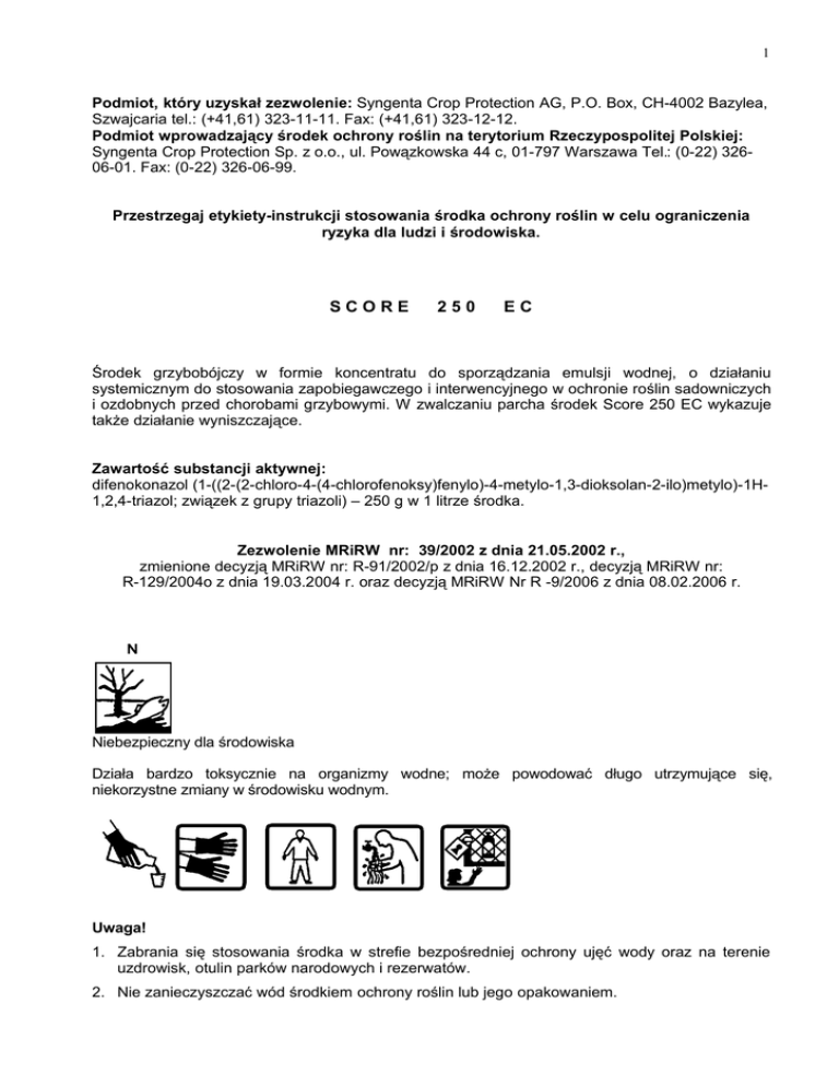 1 Podmiot, który uzyskał zezwolenie: Syngenta Crop Protection AG, P.O. Box, CH-4002 Bazylea, Szwajcaria tel.: (+41,61) 323-11-11. Fax: (+41,61) 323-12-12. Podmiot wprowadzający środek ochrony roślin na terytorium Rzeczypospolitej Polskiej: Syngenta Crop Protection Sp. z o.o., ul. Powązkowska 44 c, 01-797 Warszawa Tel.: (0-22) 32606-01. Fax: (0-22) 326-06-99. Przestrzegaj etykiety-instrukcji stosowania środka ochrony roślin w celu ograniczenia ryzyka dla ludzi i środowiska. SCORE 250 EC Środek grzybobójczy w formie koncentratu do sporządzania emulsji wodnej, o działaniu systemicznym do stosowania zapobiegawczego i interwencyjnego w ochronie roślin sadowniczych i ozdobnych przed chorobami grzybowymi. W zwalczaniu parcha środek Score 250 EC wykazuje także działanie wyniszczające. Zawartość substancji aktywnej: difenokonazol (1-((2-(2-chloro-4-(4-chlorofenoksy)fenylo)-4-metylo-1,3-dioksolan-2-ilo)metylo)-1H1,2,4-triazol; związek z grupy triazoli) – 250 g w 1 litrze środka. Zezwolenie MRiRW nr: 39/2002 z dnia 21.05.2002 r., zmienione decyzją MRiRW nr: R-91/2002/p z dnia 16.12.2002 r., decyzją MRiRW nr: R-129/2004o z dnia 19.03.2004 r. oraz decyzją MRiRW Nr R -9/2006 z dnia 08.02.2006 r. Niebezpieczny dla środowiska Działa bardzo toksycznie na organizmy wodne; może powodować długo utrzymujące się, niekorzystne zmiany w środowisku wodnym. Uwaga! 1. Zabrania się stosowania środka w strefie bezpośredniej ochrony ujęć wody oraz na terenie uzdrowisk, otulin parków narodowych i rezerwatów. 2. Nie zanieczyszczać wód środkiem ochrony roślin lub jego opakowaniem. 2 ZAKRES STOSOWANIA, TERMINY I DAWKI Rośliny sadownicze jabłoń, grusza. - parch jabłoni, parch gruszy. Zalecana dawka: 200 ml /ha. Środek stosować zapobiegawczo i interwencyjnie do 120 godzin po infekcji oraz wyniszczająco. Do wyniszczania plam parcha zaleca się dwukrotne stosowanie środka Score 250 EC w odstępach co 5 dni. Zabiegi wykonywać w okresie od fazy różowego pąka kwiatowego nie więcej, niż 2–3 razy w sezonie. jabłoń. - mączniak jabłoni. Zalecana dawka: 200 ml /ha. Środek stosować od fazy różowego pąka co 7–14 dni, nie więcej niż 2–3 razy w sezonie. wiśnia. - drobna plamistość liści drzew pestkowych. Zalecana dawka: 200 ml /ha. Środek stosować po kwitnieniu nie więcej, niż 2–3 razy w sezonie, co 10–14 dni. Zalecana ilość wody: 500–750 l/ha. - brunatna zgnilizna drzew pestkowych. Zalecana dawka: 200 ml /ha. Środek stosować na początku lub w pełni kwitnienia, zwykle co 5-7 dni. Zalecana ilość wody: 500–750 l/ha. czarna porzeczka, agrest. - amerykański mączniak agrestu, opadzina liści porzeczki, rdza wejmutkowo - porzeczkowa. Zalecana dawka: 200 ml /ha. Środek stosować po kwitnieniu nie więcej, niż 2–3 razy w sezonie, co 10–14 dni. W razie silnego wystąpienia chorób zabieg powtórzyć 1–2 razy po zbiorach owoców. Zalecana ilość wody: 500–900 l/ha. Rośliny ozdobne róża. - mączniak prawdziwy, czarna plamistość. Zalecane stężenie: 0,05% (50 ml środka w 100 l wody). 3 Środek stosować po wystąpieniu pierwszych objawów chorób, 2–3 razy w sezonie, co 7-14 dni. aster, floks, nagietek, gerbera, łyszczec, cyneraria, begonia (pod osłonami). - mączniak prawdziwy. Zalecana dawka: 0,05% (50 ml środka w 100 l wody). Środek stosować po wystąpieniu pierwszych objawów chorób, 2–3 razy w sezonie, co 7-10 dni. goździk, cynia, lewkonia, aster. - alternarioza. Zalecane stężenie: 0,025% (25 ml środka w 100 l wody). Środek stosować po wystąpieniu pierwszych objawów chorób, 2–3 razy w sezonie, co 7-10 dni. doniczkowe rośliny ozdobne oraz ligustr. - plamistość liści, antraknoza. Zalecane stężenie: 0,05% (50 ml środka w 100 l wody). Środek stosować po wystąpieniu pierwszych objawów chorób, 2–3 razy w sezonie, co 7-10 dni. Zalecana ilość cieczy użytkowej: 500-1000 l/ha. UWAGI: 1. Środek stosować w temperaturze powietrza powyżej 120C. 2. Środek stosować przemiennie z fungicydami należącymi do innych grup chemicznych. 3. Przed zastosowaniem środka na rośliny ozdobne wykonać na każdej uprawianej odmianie próbny zabieg w celu sprawdzenia, czy w ciągu 7 dni nie wystąpią objawy uszkodzenia roślin. 4. Nie dopuścić do przedostania się środka do zbiorników i cieków wodnych. OKRES KARENCJI (okres od dnia ostatniego zabiegu do dnia zbioru roślin przeznaczonych do konsumpcji): - jabłka, gruszki, wiśnia - 14 dni, - agrest, czarna porzeczka - 21 dni. OKRES PREWENCJI DLA LUDZI, PSZCZÓŁ I ZWIERZĄT (okres zapobiegający zatruciu): NIE DOTYCZY. SPORZĄDZANIE CIECZY UŻYTKOWEJ Przed przystąpieniem do sporządzania cieczy użytkowej dokładnie ustalić potrzebną jej ilość. Zawartością opakowania przed użyciem wstrząsnąć. Odmierzoną ilość środka wlać do zbiornika opryskiwacza napełnionego częściowo wodą (z włączonym mieszadłem) i uzupełnić wodą do potrzebnej ilości. Opryskiwać z włączonym mieszadłem. 4 Po wlaniu środka do zbiornika opryskiwacza niewyposażonego w mieszadło hydrauliczne, ciecz w zbiorniku mechanicznie wymieszać. Opróżnione opakowania przepłukać trzykrotnie wodą, a popłuczyny wlać do zbiornika opryskiwacza z cieczą użytkową. W przypadku przerw w opryskiwaniu, przed ponownym przystąpieniem do pracy należy dokładnie wymieszać ciecz użytkową w zbiorniku opryskiwacza. Podczas stosowania środka nie dopuścić do: ─ znoszenia cieczy użytkowej na sąsiednie rośliny uprawne, ─ nakładania się cieczy użytkowej na stykach pasów zabiegowych i uwrociach. Po pracy aparaturę dokładnie wymyć. PRZECHOWYWANIE Przechowywać wyłącznie w oryginalnym opakowaniu, w chłodnym, dobrze wentylowanym miejscu. Nie przechowywać razem z żywnością, napojami i paszami dla zwierząt. Przechowywać pojemnik szczelnie zamknięty, w temperaturze nieprzekraczającej zakresu od 0°C do 30°C. WARUNKI BEZPIECZNEGO STOSOWANIA ŚRODKA Chroni