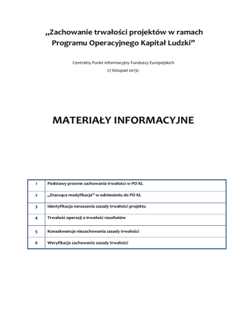 „Zachowanie trwałości projektów w ramach Programu Operacyjnego Kapitał Ludzki” Centralny Punkt Informacyjny Funduszy Europejskich 27 listopad 2013r. MATERIAŁY INFORMACYJNE 1 Podstawy prawne zachowania trwałości w PO KL 2 „Znacząca modyfikacja” w odniesieniu do PO KL 3 Identyfikacja naruszenia zasady trwałości projektu 4 Trwałość operacji a trwałość rezultatów 5 Konsekwencje niezachowania zasady trwałości 6 Weryfikacja zachowania zasady trwałości Centralny Punkt Informacyjny Funduszy Europejskich 27 listopad 2013 Podstawy prawne zachowania trwałości w PO KL Przepisy warunkujące przyznanie projektom dofinansowanie z funduszy strukturalnych nakładają na beneficjentów obowiązek utrzymania trwałości projektu przez co najmniej pięć lat od momentu zakończenia realizacji projektu (lub 3 lat dla Państw Członkowskich, które skorzystały z redukcji tego limitu czasowego dla utrzymania inwestycji i utworzenia miejsc pracy stworzonych przez MSP). Spełnienie warunku trwałości projektu powinno podlegać monitorowaniu/kontroli. Trwałość projektu mierzona jest przede wszystkim poprzez monitorowanie stopnia utrzymania osiągniętych rezultatów projektu zadeklarowanych we wniosku o dofinansowanie. Zgodnie z art. 57 Rozporządzenia WE nr 1083/2006 kontroli trwałości projektu podlegają beneficjenci projektu będący firmami lub organami publicznymi. Beneficjent (ostateczny odbiorca) zobowiązany jest do zwrotu środków, jeżeli na podstawie czynności kontrolnych uprawnionych organów zostanie stwierdzone, że w okresie 5 lat (lub 3 lat w przypadku projektów MSP, których celem jest utworzenie miejsc pracy) od daty faktycznego zakończenia projektu, projekt ulegnie znaczącej modyfikacji, tj.: a) wpływającej na charakter lub warunki wykonania projektu lub przyznającej beneficjentowi nienależne korzyści; b) wynikającej albo ze zmiany charakteru własności danej pozycji infrastruktury albo z zaprzestania działalności produkcyjnej. Uznaje się, ze działania wchodzące w zakres pomocy z Europejskiego Funduszu Społecznego nie zachowały tego wkładu wyłącznie wtedy, gdy są one zobowiązane do utrzymania inwestycji w ramach mających zastosowanie przepisów dotyczących pomocy publicznej w rozumieniu art. 107 Traktatu o funkcjonowaniu Unii Europejskiej i jeśli zostały one poddane zasadniczej modyfikacji spowodowanej zaprzestaniem działalności produkcyjnej w terminie określonym w tych przepisach. Trwałość projektu w Programie Kapitał Ludzki może być związana również z zasadą dodatkowości funduszy strukturalnych, zawartą w art. 15 ust. 1 rozporządzenia 1083/2006/WE. W myśl tej zasady wkłady funduszy strukturalnych nie zastępują publicznych lub równoważnych wydatków strukturalnych ponoszonych przez państwo członkowskie. Centralny Punkt Informacyjny Funduszy Europejskich 27 listopad 2013 Trwałość projektów w tym wymiarze oznacza, że środki pochodzące z funduszy strukturalnych nie powinny zastępować środków publicznych, a jedynie umożliwiać rozpoczęcie realizacji działań, których trwałość powinna zostać utrzymana ze środków krajowych. Fundusze strukturalne mogą być szczególnie pomocne w pierwszym okresie realizacji projektu, który z reguły jest związany z poniesieniem większych kosztów, przeznaczonych np. na zakup wyposażenia czy adaptację pomieszczeń. Kwestia trwałości związana z dodatkowością funduszy pochodzących z EFS może być brana pod uwagę na etapie oceny wniosków o dofinansowanie, wyboru projektów do dofinansowania, realizacji projektów oraz w okresie po ich realizacji (weryfikacja zachowania trwałości zrealizowanego projektu). Wymogi zawarte w Planie Działań oraz wnioskach o dofinansowanie/umowie o dofinansowanie mogą również wpływać na obowiązek zachowania określonej trwałości projektu. Instytucja Organizująca Konkurs może wprowadzić do Planów Działań zapisy zobowiązujące beneficjentów do zapewnienia trwałości wypracowanych rezultatów projektu (np. utrzymanie zatrudnienia przez określoną liczbę osób biorących udział w projekcie) lub zapisy mające na celu zagwarantowanie spełnienia zasady dodatkowości funduszy strukturalnych. Na etapie oceny wniosków o dofinansowanie kwestia trwałości może być uwzględniana: na etapie oceny formalnej – nie spełnienie kryterium dostępu związanego z zapewnieniem trwałości produktów i rezultatów oznacza odrzucenie wniosku etapie oceny merytorycznej – nie spełnienie strategicznego związanego z zapewnieniem trwałości produktów i rezultatów oznacza nie przyznanie premii punktowej Na etapie wyboru wniosku do dofinansowania kwestia trwałości może być zawarta w umowie o dofinansowanie projektu. Po zakończeniu realizacji projektu kwestia trwałości może być monitorowana poprzez działania kontrolne. Centralny Punkt Informacyjny Funduszy Europejskich 27 listopad 2013 „Znacząca modyfikacja” w odniesieniu do PO KL Znacząca modyfikacja w rozumieniu Rozporządzenia WE nr 1083/2006 art. 57 oznacza jednoczesne spełnienie co najmniej jednego z warunków: zmiana charakteru własności danej pozycji infrastruktury albo z zaprzestanie działalności produkcyjnej i co najmniej jednego z nich wynikających warunku: wpływ na charakter lub warunki wykonania projektu lub przyznanie beneficjentowi nienależnych korzyści. Ponadto pomiędzy tymi warunkami musi zachodzić związek przyczynowo-skutkowy. Zmiana w charakterze własności jednostki infrastruktury. Zmiana w charakterze własności jednostki infrastruktury zakupionej w ramach projektu dotyczy tylko tych projektów, które zostały sfinansowane zgodnie z zasadami dla Europejskiego Funduszu Rozwoju Regionalnego (EFRR) – wydatki ponoszone w ramach cross-financing’u. W związku z powyższym w odniesieniu do PO KL warunek ten ma zastosowanie w stosunku do projektów, w których dokonywany jest zakup sprzętu oraz wyposażenia. Zaprzes