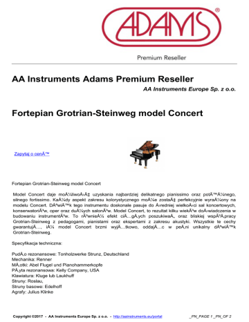 AA Instruments Adams Premium Reseller AA Instruments Europe Sp. z o.o. Fortepian Grotrian-Steinweg model Concert Zapytaj o cenÄ™ Fortepian Grotrian-Steinweg model Concert Model Concert daje możliwość uzyskania najbardziej delikatnego pianissimo oraz potężnego, silnego fortissimo. Każdy aspekt zakresu kolorystycznego może zostać perfekcyjnie wyrażony na modelu Concert. DźwiÄ™k tego instrumentu doskonale pasuje do Å›redniej wielkoÅ›ci sal koncertowych, konserwatoriów, oper oraz dużych salonów. Model Concert, to rezultat kilku wieków doÅ›wiadczenia w budowaniu instrumentów. To również efekt ciÄ…gÅ‚ych poszukiwaÅ„ oraz bliskiej współpracy Grotrian-Steinweg z pedagogami, pianistami oraz ekspertami z zakresu akustyki. Wszystkie te cechy gwarantujÄ…, iż model Concert brzmi wyjÄ…tkowo, oddajÄ…c w peÅ‚ni unikalny dźwiÄ™k Grotrian-Steinweg. Specyfikacja techniczna: PudÅ‚o rezonansowe: Tonholzwerke Strunz, Deutschland Mechanika: Renner MÅ‚otki: Abel Flugel und Pianohammerkopfe PÅ‚yta rezonansowa: Kelly Company, USA Klawiatura: Kluge lub Laukhuff Struny: Roslau, Struny basowe: Edelhoff Agrafy: Julius Klinke Copyright ©2017 - AA Instruments Europe Sp. z o.o. - http://aainstruments.eu/portal _PN_PAGE 1 _PN_OF 2 Wymiary: DÅ‚ugość - 225cm Szerokość - 153cm Wyskość - 100 cm Waga: 400 kg DostÄ™pne rodzaje wykoÅ„czenia : - czarny - mat - czarny - poÅ‚ysk Informacja o sprzedawcy Copyright ©2017 - AA Instruments Europe Sp. z o.o. - http://aainstruments.eu/portal _PN_PAGE 2 _PN_OF 2