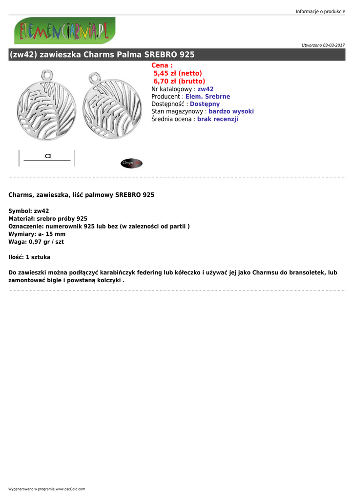 Informacje o produkcie Utworzono 03-03-2017 (zw42) zawieszka Charms Palma SREBRO 925 Cena : 5,45 zł (netto) 6,70 zł (brutto) Nr katalogowy : zw42 Producent : Elem. Srebrne Dostępność : Dostępny Stan magazynowy : bardzo wysoki Średnia ocena : brak recenzji Charms, zawieszka, liść palmowy SREBRO 925 Symbol: zw42 Materiał: srebro próby 925 Oznaczenie: numerownik 925 lub bez (w zalezności od partii ) Wymiary: a- 15 mm Waga: 0,97 gr / szt Ilość: 1 sztuka Do zawieszki można podłączyć karabińczyk federing lub kółeczko i używać jej jako Charmsu do bransoletek, lub zamontować bigle i powstaną kolczyki . Wygenerowano w programie www.oscGold.com