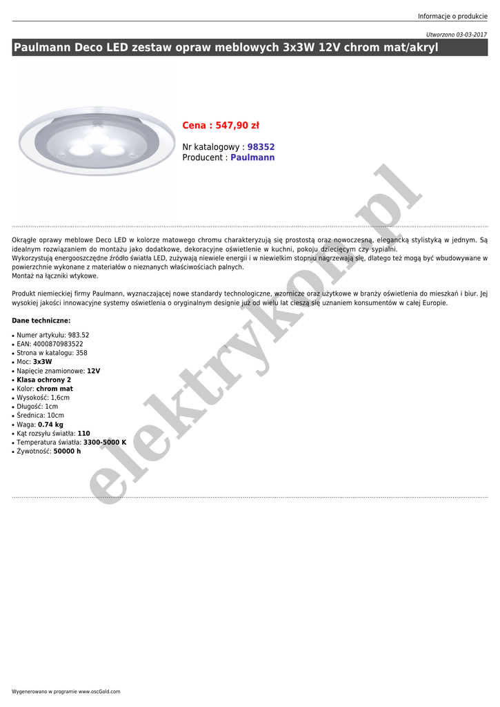 Informacje o produkcie Utworzono 03-03-2017 Paulmann Deco LED zestaw opraw meblowych 3x3W 12V chrom mat/akryl Cena : 547,90 zł pl Nr katalogowy : 98352 Producent : Paulmann on . Okrągłe oprawy meblowe Deco LED w kolorze matowego chromu charakteryzują się prostostą oraz nowoczesną, elegancką stylistyką w jednym. Są idealnym rozwiązaniem do montażu jako dodatkowe, dekoracyjne oświetlenie w kuchni, pokoju dziecięcym czy sypialni. Wykorzystują energooszczędne źródło światła LED, zużywają niewiele energii i w niewielkim stopniu nagrzewają się, dlatego też mogą być wbudowywane w powierzchnie wykonane z materiałów o nieznanych właściwościach palnych. Montaż na łączniki wtykowe. yk Produkt niemieckiej firmy Paulmann, wyznaczającej nowe standardy technologiczne, wzornicze oraz użytkowe w branży oświetlenia do mieszkań i biur. Jej wysokiej jakości innowacyjne systemy oświetlenia o oryginalnym designie już od wielu lat cieszą się uznaniem konsumentów w całej Europie. ● ● ● ● ● ● ● ● ● ● ● ● el ● Numer artykułu: 983.52 EAN: 4000870983522 Strona w katalogu: 358 Moc: 3x3W Napięcie znamionowe: 12V Klasa ochrony 2 Kolor: chrom mat Wysokość: 1,6cm Długość: 1cm Średnica: 10cm Waga: 0.74 kg Kąt rozsyłu światła: 110 Temperatura światła: 3300-5000 K Żywotność: 50000 h ek ● tr Dane techniczne: Wygenerowano w programie www.oscGold.com