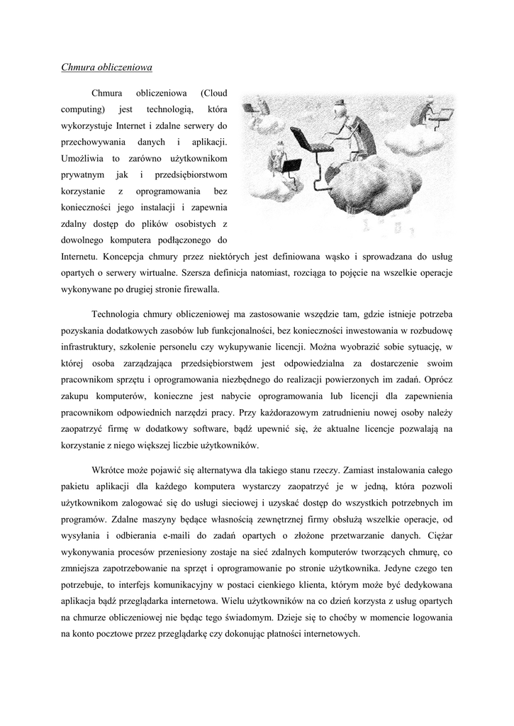 Chmura obliczeniowa Chmura computing) obliczeniowa jest (Cloud technologią, która wykorzystuje Internet i zdalne serwery do przechowywania danych i aplikacji. Umożliwia to zarówno użytkownikom prywatnym jak korzystanie z i przedsiębiorstwom oprogramowania bez konieczności jego instalacji i zapewnia zdalny dostęp do plików osobistych z dowolnego komputera podłączonego do Internetu. Koncepcja chmury przez niektórych jest definiowana wąsko i sprowadzana do usług opartych o serwery wirtualne. Szersza definicja natomiast, rozciąga to pojęcie na wszelkie operacje wykonywane po drugiej stronie firewalla. Technologia chmury obliczeniowej ma zastosowanie wszędzie tam, gdzie istnieje potrzeba pozyskania dodatkowych zasobów lub funkcjonalności, bez konieczności inwestowania w rozbudowę infrastruktury, szkolenie personelu czy wykupywanie licencji. Można wyobrazić sobie sytuację, w której osoba zarządzająca przedsiębiorstwem jest odpowiedzialna za dostarczenie swoim pracownikom sprzętu i oprogramowania niezbędnego do realizacji powierzonych im zadań. Oprócz zakupu komputerów, konieczne jest nabycie oprogramowania lub licencji dla zapewnienia pracownikom odpowiednich narzędzi pracy. Przy każdorazowym zatrudnieniu nowej osoby należy zaopatrzyć firmę w dodatkowy software, bądź upewnić się, że aktualne licencje pozwalają na korzystanie z niego większej liczbie użytkowników. Wkrótce może pojawić się alternatywa dla takiego stanu rzeczy. Zamiast instalowania całego pakietu aplikacji dla każdego komputera wystarczy zaopatrzyć je w jedną, która pozwoli użytkownikom zalogować się do usługi sieciowej i uzyskać dostęp do wszystkich potrzebnych im programów. Zdalne maszyny będące własnością zewnętrznej firmy obsłużą wszelkie operacje, od wysyłania i odbierania e-maili do zadań opartych o złożone przetwarzanie danych. Ciężar wykonywania procesów przeniesiony zostaje na sieć zdalnych komputerów tworzących chmurę, co zmniejsza zapotrzebowanie na sprzęt i oprogramowanie po stronie użytkownika. Jedyne czego ten potrzebuje, to interfejs komunikacyjny w postaci cienkiego klienta, którym może być dedykowana aplikacja bądź przeglądarka internetowa. Wielu użytkowników na co dzień korzysta z usług opartych na chmurze obliczeniowej nie będąc tego świadomym. Dzieje się to choćby w momencie logowania na konto pocztowe przez przeglądarkę czy dokonując płatności internetowych. Struktura Samą konstrukcję chmury obliczeniowej można podzielić na dwie części: część interfejsową (front end) i część funkcjonalną (back end). Obie połączone są siecią (najczęściej jest to Internet). Część interfejsowa jest częścią, z którą bezpośrednio styka się użytkownik, składa się na nią komputer i aplikacja pozwalająca na dostęp do chmury. Natomiast część funkcjonalna to część zewnętrzna modelu, niewidoczna dla użytkownika, w skład której wchodzą serwery i systemy przechowywania danych tworzące chmurę. Teoretycznie model ten, wyposażony w odpowiednie oprogramowanie pośredniczące (middleware) jest w stanie obsłużyć dowolny program wykonywalny na komputerze lokalnym. Modele Dostawcy usług opartych na chmurze najczęściej oferują swoim klientom jeden z trzech podstawowych modeli: Infrastructure as a Service (IaaS) – w tym modelu, czasem określanym też jako „Hardware as a Service”, usługodawca udostępnia klientowi infrastrukturę informatyczną, a więc komputery (fizycznie, lub częściej jako maszyny wirtualne), przestrzeń dyskową, zasób mocy obliczeniowej, komponenty sieciowe i zapewnia ich serwisowanie. Użytkownik natomiast może zainstalować system operacyjny wraz z potrzebnymi mu aplikacjami i jest odpowiedzialny za ich utrzymanie. Klient wykupuje infrastrukturę dostosowaną do swoich aktualnych potrzeb, zamiast inwestować w sprzęt, który może nie być w pełni wykorzystany. Ma także dostęp do konfiguracji, która instalowana lokalnie, mogłaby być bardzo kosztowna. Płatność odbywa się w systemie „pay as you go”, a więc usługobiorca płaci tylko za zasoby, które wykorzystał. Jedną z największych zalet „infrastruktury jako usługi”, jest jej elastyczność. Każdy program, który może zostać zwirtualizowany, może być także uruchomiony na urządzeniach zdalnych. Model ten reprezentują m.in. Amazon, Rackspace, Terremark czy Google. Platform as a Service (PaaS) – model przeznaczony dla programistów. Usługodawca dostarcza platformę, na którą składa się system operacyjny, środowisko wykonawcze określonego języka programowania, baza danych i serwer WWW, a więc zapewnia narzędzia niezbędne do rozwijania, testowania, instalacji i utrzymania aplikacji. Model ten pozwala zespołom deweloperów rozrzuconym po całym świecie, na wspólną pracę nad danym projektem, bez konieczności nabywania dużej ilości sprzętu, co redukuje koszty, a także zabezpiecza przed duplikowaniem zadań, czy problemów wynikłych z niekompatybilności poszczególnych konfiguracji. Przykładami takich platform są: Amazon Elastic Beanstalk, Heroku, EngineYard, Mendix, Google App Engine, Microsoft Azure czy OrangeScape. Software as a Service (SaaS) – klient otrzymuje dostęp do konkretnego oprogramowania bez potrzeby nabywania licencji na jego użytkowanie. Program jest zainstalowany na zewnętrznych serwerach, a użytkownik ma do niego dostęp poprzez sieć (Internet bądź intranet). Usługodawca przechowuje (hostuje) zarówno aplikacje jak i bazy danych, co pozwala na dostęp i wydajną pracę z dowolnego miejsca. SaaS daje możliwość efektywniejszego prowadzenia biznesu, a także redukcji kosztów, ponieważ często cena użytkowania aplikacji w chmurze jest niższa, niż miesięczna opłata za korzystanie z tej samej aplikacji lokalnie. Model ten, nazywany także „software on demand” jest obecnie najpopularniejszym wariantem chmury obliczeniowej