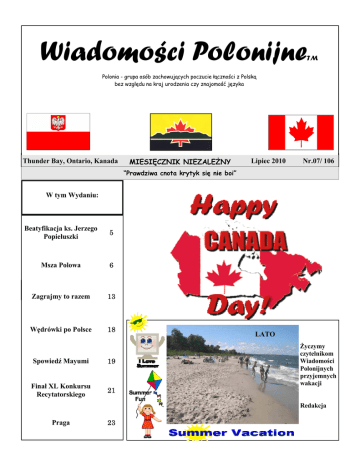 Wiadomosci Polonijne TM Polonia - grupa osób zachowujących poczucie łączności z Polską bez względu na kraj urodzenia czy znajomość języka Thunder Bay, Ontario, Kanada MIESIĘCZNIK NIEZALEŻNY Lipiec 2010 Nr.07/ 106 “Prawdziwa cnota krytyk się nie boi” W tym Wydaniu: Beatyfikacja ks. Jerzego Popiełuszki 5 Msza Polowa 6 Zagrajmy to razem 13 Wędrówki po Polsce 18 Spowiedź Mayumi 19 Finał XL Konkursu Recytatorskiego 21 LATO Życzymy czytelnikom Wiadomości Polonijnych przyjemnych wakacji Redakcja Praga 23 2 Wiadomości Polonijne Redaguje Zespół: Lucy Michalak Tadeusz Michalak Agnieszka Reszkowska-Kania Robert Kania Korespondenci: Joanna Adamik Agnieszka Buda - Rodriguez Kazimierz Niechwiadowicz Aleksander Siwiak Waldi Opracowanie: Lucy Michalak Wzory reklam zaprojektowanych przez “Wiadomości Polonijne” są własnością wydawnictwa. Kopiowanie i ich publikowanie bez zgody redakcji jest nielegalne. Redakcja “ Wiadomości Polonijnych” zaprasza wszystkich Czytelników do przysyłania własnej twórczości. Mogą to być zarówno wiersze jak i proza. Termin nadsyłania materiałów do gazety upływa 15-go każdego miesiąca. Redakcja zastrzega sobie prawo skracania i edycji nadesłanych tekstów. Wyrażone w tekstach opinie należą do Księga Imion - Agnieszka to osoba ruchliwa, nie mogąca usiedzieć w miejscu. Sprawia wrażenie osoby pewnej siebie jednak często są to tylko pozory. Agnieszka jest bardzo pobudliwa i trzeba dużo wysiłku by ją uspokoić kiedy się zdenerwuje. Agnieszka lubi grać na uczuciach aby manipulować otoczeniem. Lubi otaczać się przyjaciółmi ale często ich zmienia. Agnieszka posiada zmysł moralny lecz często wyznawane zasady nie znajdują potwierdzenia w działaniu. autorów i nie zawsze odzwierciedlają stanowisko redakcji. Za treść ogłoszeń i reklam redakcja nie ponosi odpowiedzialności. Wiadomości Polonijne są pismem całkowicie bezpłatnym. Wszelkie koszty związane z drukiem są pokrywane z dotacji. Każda pomoc finansowa jest mile widziana. Wszelkiego rodzaju ogłoszenia i życzenia do “Wiadomości Polonijych” przyjmuje Lucy Michalak tel. 767-4200 Wydawca: Wiadomości Polonijne 236 Masters Street. Thunder Bay, On. P7B 6L5 e-mail: [email protected] http://artspolonia.enginesource.org http://www.polishwinnipeg.com/ Downloads/IndexThunderBay.htm Potrzebujemy pomocy w redagowaniu gazetki, a szczególnie w opracowywaniu przy komputerze. Jeśli masz czas i chęć zgłoś się do redakcji. Przysłowie miesiąca Gdy po gorącym lipcu sierpień chłodzi, twarda zima i duży śnieg zaszkodzi Nie idź za mną bo nie umiem prowadzić. Nie idź przede mną bo mogę za Tobą nadążyć. Idź obok mnie i bądź moim przyjacielem. A.Camus PARAFIA MATKI BOŻEJ KRÓLOWEJ POLSKI 93 N. Algoma Str Thunder Bay, On Tel 344-1066 Proboszcz ks. Ireneusz Stadler Msze Św. wtorek-piątek 7:00 p.m., soboty 5:00 p.m. niedziele 9:00 (po angielsku) & 10:30 a.m. (po polsku) http://stmary50.blogspot.com Lipiec 2010 FLIRT I MIŁOŚĆ Flirtować może każdy z nas setki razy, gdy ma chęć. Lecz kochać można tylko raz! 2...3...4...5… Karol Szpalski LATO Rowy poziomkowe, ukwiecone rowy, zapach błotny, miodny, zapach malinowy, żuczki, muszki, puszki, słomki, olbrzymie ukryte poziomki. Warczą głośniej, głebiej, słabiej na dnie dźwięczne głosy żabie, Coś kwitnie biało, obficie, Trochę wyżej, dalej w życie, ozywa się coś, wabi, wabi, coś szeleści-jak w atłasie, mówi słowa-jakby ptasie, kroki stawia-jakieś inne, nie człowiecze, nie dziecinne…. Niby, Że się tam w zbożu nie może do snu ułoyżyć…. Niby, Że się tam nie mieści!.... Wabi, świergoce, szeleści….. A jesienią-wzięto zboże, nic nie było na ugorze. Kazimiera Iłłakowiczówna (1892—1983) PARAFIA ŚW. KAZIMIERZA 613 McKenzie Str Thunder Bay, On Tel 623-3916 Proboszcz o. Andrzej Deptuła Msze Św. wtorek-piątek 8:00 a.m. ( eng/pol.) soboty 5:00 p.m (english) niedziela 9:00a.m.(english) & 10:30 a.m.(polish) Wiadomości Polonijne Lipiec 2010 WIADOMOŚCI Z POLSKI -Tadeusz Michalak Beatyfikacja Księdza Jerzego Popieluszki (jeszcze w czerwcu) tzw. małe nowelizacje ustawy medialnej. Wtedy zostaną natychmiast rozwiązane rady nadzorcze mediów publicznych. Nowi członkowie zostaną wyłonieni w konkursach. Oraz wskazani przez ministrów kultury, skarbu i finansów. 3 mamy go podobno mieć wielkie złoża. Pierwszy odwiert robiony jest w Lebieniu (to na Pomorzu, niedaleko Słupska). Premier już coś wspomniał o możliwości rewizji umowy z Rosją, która miała już kilka razy być podpisywana, ale wciąż podpisana nie jest. Gwałtownie zareagował wicepremier Pawlak, który uważa, że umowę z Rosją trzeba jak najszybciej podpisać, bo inaczej za kilka miesięcy braknie nam gazu. Zmarła Elzbieta Czyżewska To było do przewidzenia Fiat przenosi produkcje nowego fiata pandy z Tych do Włoch. Dotychczas panda stanowiła połowe produkcji w Tychach. Ministerstwo Gospodarki `ma nadzieje’, że nie będzie zwolnień. Trybunał w Strasburgu Orzekł, że brak możliwości wyboru w polskich szkołach etyki zamiast religii narusza Europejską Konwencję Praw Człowieka. Premier Donald Tusk ogłoszona została, decyzja papieska, w czasie uroczystej mszy św. w niedziele 6 czerwca na placu Zwycięstwa/placu Pilsudskiego. We mszy wzięło udział około 140 tysięcy osób, 100 biskupów, 2000 księży. Motywem przewodnim uroczystości było zawołanie księdza `Nie daj się zwyciężyć złu, ale zło dobrem zwyciężaj'. Uczestniczyła też matka błogosławionego. Bardzo godna i roztropna. Przykład: na `dociekliwe' pytanie dziennikarki: `czy modli się Pani do syna?' Odpowiedziała `modle się to ja do Pana Boga. I Pani radzę.' Po mszy procesja paru tysięcy osób przeszła do Świątyni Opatrzności w Wilanowie. Gaz łupkowy w Polsce Wygląda na to, że jest go u nas dużo. Zaczyna się ruch zachodnich koncernów, które chciałyby wydobywać. Jak pow