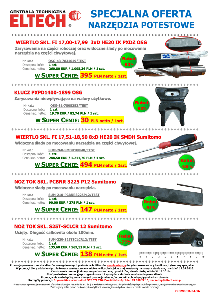 SPECJALNA OFERTA NARZĘDZIA POTESTOWE WIERTLO SKL. FI 17,00-17,99 3xD HE20 IK PXDZ OSG Zarysowania na części roboczej oraz widoczne ślady po mocowaniu narzędzia na części chwytowej. Nr kat.: Dostępna ilość: Cena kat. netto: OSG-43-7831019/TEST 1 szt. 260,80 EUR / 1.095,36 PLN / 1 szt. W SUPER CENIE: 395 Rabat -63% PLN netto / 1szt. KLUCZ PXPD1400-1899 OSG Zarysowania niewpływające na walory użytkowe. Nr kat.: Dostępna ilość: Cena kat. netto: Rabat -63% OSG-31-7808282/TEST 1 szt. 19,70 EUR / 82,74 PLN / 1 szt. W SUPER CENIE: 30 PLN netto / 1szt. WIERTLO SKL. FI 17,51-18,50 8xD HE20 IK SMDH Sumitomo Widoczne ślady po mocowaniu narzędzia na części chwytowej. Nr kat.: Dostępna ilość: Cena kat. netto: SUM-260-SMDH180M8/TEST 1 szt. 288,50 EUR / 1.211,70 PLN / 1 szt. W SUPER CENIE: 494 Rabat -59% PLN netto / 1szt. NOZ TOK SKL. PCBNR 3225 P12 Sumitomo Widoczne ślady po mocowaniu narzędzia. Nr kat.: Dostępna ilość: Cena kat. netto: SUM-210-PCBNR3225P12/TEST 1 szt. 90,00 EUR / 378 PLN / 1 szt. W SUPER CENIE: 147 PLN netto / 1szt. Rabat -61% NOZ TOK SKL. S25T-SCLCR 12 Sumitomo Ucięty. Długość całkowita około 100mm. Nr kat.: Dostępna ilość: Cena kat. netto: SUM-220-S25TSCLCR12/TEST 1 szt. 135,60 EUR / 569,52 PLN / 1 szt. W SUPER CENIE: 138 Rabat -75% PLN netto / 1szt. Promocja przeznaczona dla klientów o uregulowanych płatnościach. Klientów nie obowiązują dotychczasowe rabaty handlowe, tylko ceny specjalne. W promocji biorą udział wyłącznie towary zamieszczone w ulotce, w ilościach jakie znajdowały się na naszym stanie mag. na dzień 19.09.2016. Czas trwania promocji: do wyczerpania stanu mag. produktów, ale nie dłużej niż do 31.12.2016r. Ilość produktów promocyjnych ograniczona. Liczy się data złożenia zamówienia przez klienta. Promocja nie może być łączona z innymi promocjami na w/w produkty obowiązującymi w tym okresie. Szczegóły promocji: Szymon Niewiadomski tel. 502 672 720, Ewa Miśków-Zych tel. 74 858 27 10, [email protected] Prezentowana promocja nie stanowi oferty handlowej w rozumieniu art. 66 § 1 Kodeksu Cywilnego oraz innych właściwych przepisów prawnych, ma jedynie charakter informacyjny. Zastrzegamy sobie prawo do korekty i modyfikacji informacji zawartych w ulotce w czasie trwania promocji. PROMOCJA 34-16 SPECJALNA OFERTA NARZĘDZIA POTESTOWE NOZ TOK SKL. GNDLL 2020 K220 Sumitomo Rabat -60% Ucięty. Długość trzonka 80mm, widoczne ślady po mocowaniu narzędzia na części chwytowej. Nr kat.: Dostępna ilość: Cena kat. netto: SUM-231-GNDLL2020K220/TEST 1 szt. 118,90 EUR / 499,38 PLN / 1 szt. W SUPER CENIE: 197 PLN netto / 1szt. FREZ SKL. GLOWICA FI 100,0 K90° 16/63 Z6 d32 IK WAX Sumitomo Widoczne ślady po mocowaniu narzędzia. Nr kat.: Dostępna ilość: Cena kat. netto: Rabat -77% SUM-255-WAX3100RS3.2/TEST 1 szt. 552,50 EUR / 2.320,50 PLN / 1 szt. W SUPER CENIE: 531 PLN netto / 1szt. NOZ TOK SKL. DWLNR 2525 M08 Sumitomo Ucięty. Długość całkowita 120mm. Nr kat.: Dostępna ilość: Cena kat. netto: SUM-210-DWLNR2525M08/TEST 1 szt. 86,70 EUR / 364,14 PLN / 1 szt. W SUPER CENIE: 88 Rabat -76% PLN netto / 1szt. FREZ SKL. GLOWICA FI 63,0 KX° 12/50 Z5 d22 MSX Sumitomo Widoczne ślady po mocowaniu narzędzia. Zarysowania na części roboczej. Nr kat.: Dostępna ilość: Cena kat. netto: SUM-254-MSX12063RS/TEST 1 szt. 463,80 EUR / 1.947,96 PLN / 1 szt. W SUPER CENIE: 425 PLN netto / 1szt. Rabat -78% FREZ SKL. GLOWICA FI 63,0 K45° 13/63 Z4 d22 IK WGX Sumitomo Narzędzie rozpakowane do celów pokazowych. Brak śladów użytkowania. Nr kat.: Dostępna ilość: Cena kat. netto: SUM-254-WGX13063RS/TEST 1 szt. 330,30 EUR / 1.387,26 PLN / 1 szt. W SUPER CENIE: 627 PLN netto / 1szt. Rabat -55% Promocja przeznaczona dla klientów o uregulowanych płatnościach. Klientów nie obowiązują dotychczasowe rabaty handlowe, tylko ceny specjalne. W promocji biorą udział wyłącznie towary zamieszczone w ulotce, w ilościach jakie znajdowały się na naszym stanie mag. na dzień 19.09.2016. Czas trwania promocji: do wyczerpania stanu mag. produktów, ale nie dłużej niż do 31.12.2016r. Ilość produktów promocyjnych ograniczona. Liczy się data złożenia zamówienia przez klienta. Promocja nie może być łączona z innymi promocjami na w/w produkty obowiązującymi w tym okresie. Szczegóły promocji: Szymon Niewiadomski tel. 502 672 720, Ewa Miśków-Zych tel. 74 858 27 10, [email protected] Prezentowana promocja nie stanowi oferty handlowej w rozumieniu art. 66 § 1 Kodeksu Cywilnego oraz innych właściwych przepisów prawnych, ma jedynie charakter informacyjny. Zastrzegamy sobie prawo do korekty i modyfikacji informacji zawartych w ulotce w czasie trwania promocji. PROMOCJA 34-16 SPECJALNA OFERTA NARZĘDZIA POTESTOWE NOZ TOK SKL D12M-SCLCR 0602-14 Sumitomo Widoczne ślady po mocowaniu narzędzia. Nr kat.: Dostępna ilość: Cena kat. netto: Rabat -63% SUM-221-D12MSCLCR060214/TEST 1 szt. 184,70 EUR / 775,74 PLN / 1 szt. W SUPER CENIE: 283 PLN netto / 1szt. NOZ TOK SKL. GNDFR 2020 K318-140 OD FI 140 DO FI 200 Sumitomo Narzędzie rozpakowane do celów pokazowych. Brak śladów użytkowania. Nr kat.: Dostępna ilość: Cena kat. netto: SUM-231-GNDFR2020K318140 /TEST 1 szt. 140,80 EUR / 591,36 PLN / 1 szt. W SUPER CENIE: 241 Rabat -59% PLN netto / 1szt. NOZ TOK SKL.S10K-SCLCR 06 Sumitomo Rabat -58% Widoczne ślady po mocowaniu narzędzia. Nr kat.: Dostępna ilość: Cena kat. netto: SUM-220-S10KSCLCR06/TEST 1 szt. 95,90 EUR / 402,78 PLN / 1 szt. W SUPER CENIE: 166 PLN netto / 1szt. FREZ SKL. GLOWICA FI 63,0 K90° 17/40 Z6 d22 IK WEX Sumitomo Widoczne ślady po mocowaniu narzędzia. Nr kat.: Dostępna ilość: Cena kat. netto: SUM-254-WEX3063F/TEST 1 szt. 375,40 EUR / 1.600,33 PLN / 1 szt. W SUPER CENIE: 776 PLN netto / 1szt. Rabat -51% NOZ TOK SKL. POLY-V2525M-K4-C NTK Widoczne ślady po mocowaniu narzędzia na części chwytowej. Nr kat.: Dostępna ilość: Cena kat. netto: NTK-POLYV2525MK4C/TEST 1 szt. 1.128,32 PLN /