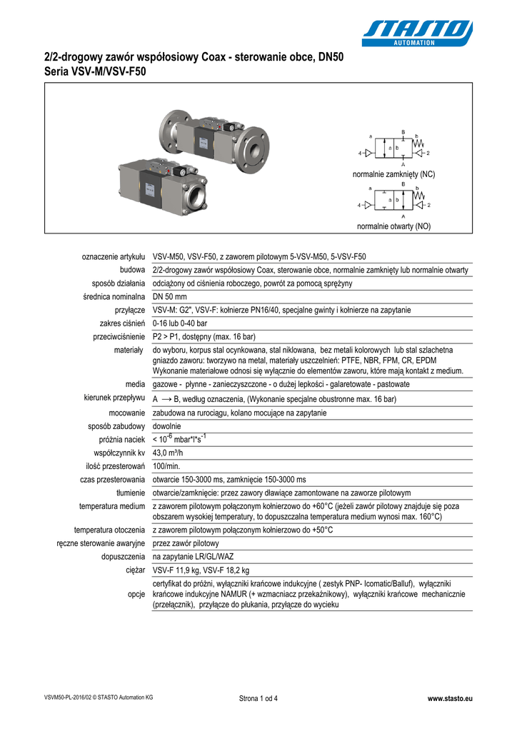 2/2-drogowy zawór współosiowy Coax - sterowanie obce, DN50 Seria VSV-M/VSV-F50 normalnie zamknięty (NC) normalnie otwarty (NO) oznaczenie artykułu VSV-M50, VSV-F50, z zaworem pilotowym 5-VSV-M50, 5-VSV-F50 budowa 2/2-drogowy zawór współosiowy Coax, sterowanie obce, normalnie zamknięty lub normalnie otwarty sposób działania odciążony od ciśnienia roboczego, powrót za pomocą sprężyny średnica nominalna DN 50 mm przyłącze VSV-M: G2", VSV-F: kołnierze PN16/40, specjalne gwinty i kołnierze na zapytanie zakres ciśnień 0-16 lub 0-40 bar przeciwciśnienie P2 > P1, dostępny (max. 16 bar) materiały do wyboru, korpus stal ocynkowana, stal niklowana, bez metali kolorowych lub stal szlachetna gniazdo zaworu: tworzywo na metal, materiały uszczelnień: PTFE, NBR, FPM, CR, EPDM Wykonanie materiałowe odnosi się wyłącznie do elementów zaworu, które mają kontakt z medium. media gazowe - płynne - zanieczyszczone - o dużej lepkości - galaretowate - pastowate kierunek przepływu A → B, według oznaczenia, (Wykonanie specjalne obustronne max. 16 bar) mocowanie zabudowa na rurociągu, kolano mocujące na zapytanie sposób zabudowy dowolnie próżnia naciek < 10-6 mbar*l*s-1 współczynnik kv 43,0 m³/h ilość przesterowań 100/min. czas przesterowania otwarcie 150-3000 ms, zamknięcie 150-3000 ms tłumienie otwarcie/zamknięcie: przez zawory dławiące zamontowane na zaworze pilotowym temperatura medium z zaworem pilotowym połączonym kołnierzowo do +60°C (jeżeli zawór pilotowy znajduje się poza obszarem wysokiej temperatury, to dopuszczalna temperatura medium wynosi max. 160°C) temperatura otoczenia z zaworem pilotowym połączonym kołnierzowo do +50°C ręczne sterowanie awaryjne przez zawór pilotowy dopuszczenia na zapytanie LR/GL/WAZ ciężar VSV-F 11,9 kg, VSV-F 18,2 kg certyfikat do próżni, wyłączniki krańcowe indukcyjne ( zestyk PNP- Icomatic/Balluf), wyłączniki opcje krańcowe indukcyjne NAMUR (+ wzmacniacz przekaźnikowy), wyłączniki krańcowe mechanicznie (przełącznik), przyłącze do płukania, przyłącze do wycieku VSVM50-PL-2016/02 © STASTO Automation KG Strona 1 od 4 www.stasto.eu rodzaj zasilania napięcie zmienne i stałe napięcie standardowe 230V/40-60Hz, 24VDC, dop. wahania napięcia ± 10% napięcia niestandardowe na zapytanie pobór mocy DC: 4,8 W (2,5 W na zapytanie), AC: moc przyciągania 11,0 VA, moc trzymania 8,5 VA czas pracy 100% (tryb pracy ciągły) rodzaj zabezpieczenia IP65 (IP54) zgodnie z DIN 40050 przy poprawnie zamontowanym gnieździe (ochrona przed pyłem i strumieniem wody) zakres dostawy wraz z wtyczką zgodnie z EN175301-803-Form B (wcześniej DIN43650) lub forma przemysłowa wejście kabla M16x1,5 opcjonalnie wtyczka zgodna z DESINA, wtyczka zgodna z VDMA wyposażenie dodatkowe wtyczka z LED i bezpiecznikiem ochrona przeciwwybuchowa Eex m II T5, pobór mocy 24VDC: 3,25W, 230VAC: 2,90W sterowanie pneumatyczne zakres ciśnienia sterującego 4-10 bar zapotrzebowanie na powietrze 55,0 cm³/skok szybkość przesterowania możliwość bezstopniowej regulacji za pomocą zaworów dławiących zamontowanych na zaworze pilotowym sterowanie zalecane za pomocą 5/2-drogowego zaworu pilotowego schemat połączeń co-ax/NAMUR, (ISO 1 na zapytanie) przyłącza sterujące 2/4: G1/8" (G1/4" na zapytanie) sterowanie hydrauliczne zakres ciśnienia sterującego 10-30 bar/30-60 bar sterowanie zalecane za pomocą 4/2-drogowego zaworu pilotowego przyłącza sterujące X/Y: G1/4" (NPT 1/4 na zapytanie) dane do zamówienia średnica nominalna, przyłącze, funkcja NC/NO, ciśnienie pracy, przepływ, medium, temperatura medium, temperatura otoczenia, napięcie nominalne, napięcie nominalne wyłączniki krańcowe, sterowanie zasady doboru Dobór wykonania materiałowego, materiału uszczelnień oraz innych parametrów zaworu odbywa się na podstawie rodzaju medium i warunków pracy. Istnieje możliwość odstępstw od parametrów ogólnych zawartych w dokumentacji technicznej.. W przypadku podania niedokładnych lub niepełnych danych do zamówienia, bądź parametrów aplikacji, istnieje niebezpieczeństwo niewłaściwego doboru wykonania materiałowego zaworu. W konsekwencji właściwości fizykochemiczne użytych materiałów lub uszczelnień mogą być niewystarczające dla założonej aplikacji. VSVM50-PL-2016/02 © STASTO Automation KG Strona 2 od 4 www.stasto.eu wymiary długość zabudowy L1 L2 L3 standard 304 310 404 z 1/2 indukcyjnymi wyłącznikami krańcowymi 330 336 430 VSV-M50 funkcja NC ze smarownicą 322 328 422 z mechanicznymi wyłącznikami krańcowymi 344 350 444 kołnierz PN DIN ØD Øk Ød 16 2633 165 125 18 40 2635 165 125 18 VSV-F50 funkcja NO mocowanie kątowe należy zamówić osobno zawory pilotowe zawór pilotowy ABS56 5/2-drogowy zawór NAMUR, elektropneumatyczne, G1/4, z zaworami dławiącymi na wylocie, p = 4 - 10 bar zawór pilotowy 5/2-drogowy zawór NAMUR, elektropneumatyczne, G1/8, z zaworami dławiącymi na wylocie, p = 4 - 10 bar zawór pilotowy 5/2-drogowy zawór ISO 1, elektropneumatyczne, G1/4, p = 4 - 10 bar zawór pilotowy 5/2-drogowy zawór co-ax, elektropneumatyczne, G1/4, p = 4 - 10 bar przyłącza elektryczne przyłącze elektryczne wtyczka Form B DIN EN 175301-803 lub forma przemysłowa przyłącze elektryczne cewka M 12x1 VSVM50-PL-2016/02 © STASTO Automation KG Strona 3 od 4 www.stasto.eu wyłączniki krańcowe Icomatic wykonanie z tworzywa sztucznego M12x1, DC 10 - 60 V AC 15 - 250 V -25°C bis +85°C Balluff wykonanie z metalu M12x1, DC 10 - 30 -25°C bis +70°C Honeywell przełącznik rysunki poglądowe Zmiany w konstrukcji, wymiarach i wykonaniu materiałowym zastrzeżone VSVM50-PL-2016/02 © STASTO Automation KG Strona 4 od 4 www.stasto.eu