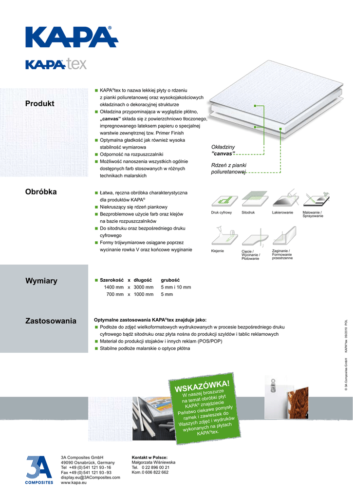 KAPA®tex to nazwa lekkiej płyty o rdzeniu z pianki poliuretanowej oraz wysokojakościowych okładzinach o dekoracyjnej strukturze Okładzina przypominająca w wyglądzie płótno, „canvas” składa się z powierzchniowo tłoczonego, impregnowanego lateksem papieru o specjalnej warstwie zewnętrznej tzw. Primer Finish Optymalna gładkość jak również wysoka stabilność wymiarowa Okładziny ”canvas” Odporność na rozpuszczalniki Możliwość nanoszenia wszystkich ogólnie Rdzeń z pianki dostępnych farb stosowanych w różnych poliuretanowej technikach malarskich Produkt Obróbka Łatwa, ręczna obróbka charakterystyczna dla produktów KAPA® Niekruszący się rdzeń piankowy Bezproblemowe użycie farb oraz klejów na bazie rozpuszczalników Do sitodruku oraz bezpośredniego druku cyfrowego Formy trójwymiarowe osiągane poprzez wycinanie rowka V oraz końcowe wyginanie Druk cyfrowy Sitodruk Lakierowanie Klejenie Cięcie / Wycinanie / Plotowanie Zaginanie / Formowanie przestrzenne Wymiary Szerokość x długość 1400 mm x 3000 mm 700 mm x 1000 mm Zastosowania Optymalne zastosowania KAPA®tex znajduje jako: Podłoże do zdjęć wielkoformatowych wydrukowanych w procesie bezpośredniego druku cyfrowego bądź sitodruku oraz płyta nośna do produkcji szyldów i tablic reklamowych Materiał do produkcji stojaków i innych reklam (POS/POP) Stabilne podłoże malarskie o optyce płótna Wn łyt obróbki p na tema®t e ci e zi ajd KAPA zn omysły p e w ka e ci o Państwo wieszek d ramek i za i wydruków ć ję zd ch Waszych h na płyta wykonanyc ® tex. KAPA Kontakt w Polsce: Małgorzata Wiśniewska Tel. 0 22 896 00 21 Kom.0 606 822 662 © 3A Composites GmbH KAPA®tex 09/2010 POL grubość 5 mm i 10 mm 5 mm A! ZÓWuK WSKaA e rz szej brosz 3A Composites GmbH 49090 Osnabrück, Germany Tel +49 (0) 541 121 93 - 16 Fax+49 (0) 541 121 93 - 93 [email protected] www.kapa.eu Malowanie / Sprayowanie