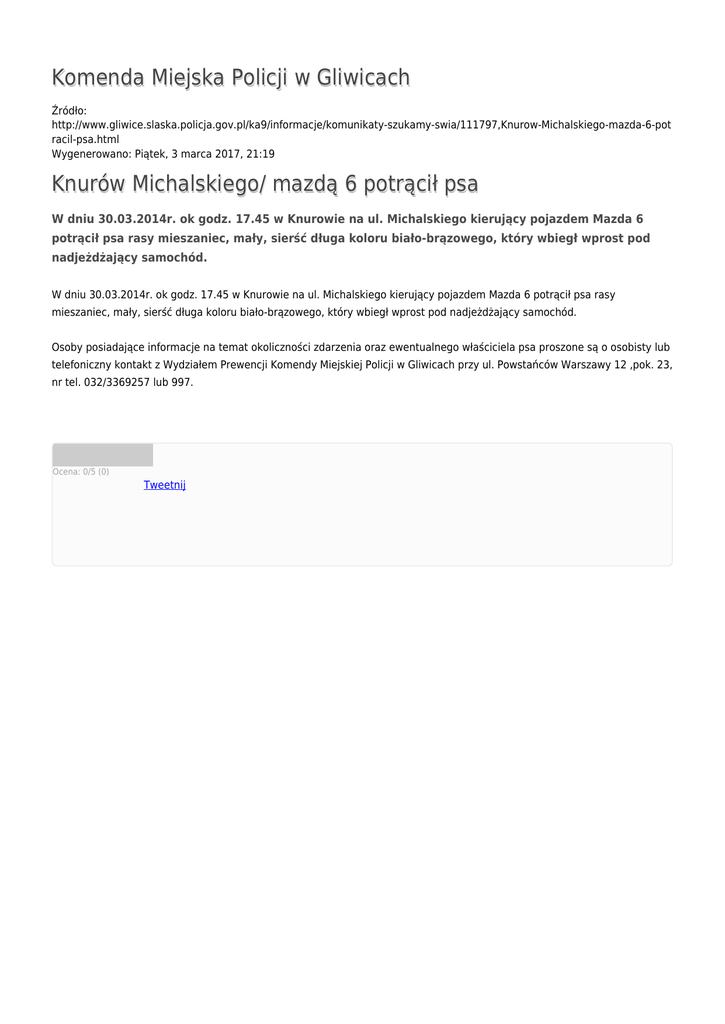 Komenda Miejska Policji w Gliwicach Źródło: http://www.gliwice.slaska.policja.gov.pl/ka9/informacje/komunikaty-szukamy-swia/111797,Knurow-Michalskiego-mazda-6-pot racil-psa.html Wygenerowano: Piątek, 3 marca 2017, 21:19 Knurów Michalskiego/ mazdą 6 potrącił psa W dniu 30.03.2014r. ok godz. 17.45 w Knurowie na ul. Michalskiego kierujący pojazdem Mazda 6 potrącił psa rasy mieszaniec, mały, sierść długa koloru biało-brązowego, który wbiegł wprost pod nadjeżdżający samochód. W dniu 30.03.2014r. ok godz. 17.45 w Knurowie na ul. Michalskiego kierujący pojazdem Mazda 6 potrącił psa rasy mieszaniec, mały, sierść długa koloru biało-brązowego, który wbiegł wprost pod nadjeżdżający samochód. Osoby posiadające informacje na temat okoliczności zdarzenia oraz ewentualnego właściciela psa proszone są o osobisty lub telefoniczny kontakt z Wydziałem Prewencji Komendy Miejskiej Policji w Gliwicach przy ul. Powstańców Warszawy 12 ,pok. 23, nr tel. 032/3369257 lub 997. Ocena: 0/5 (0) Tweetnij