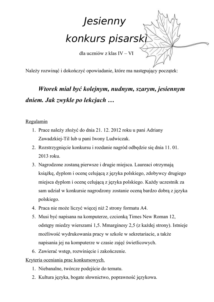 Jesienny konkurs pisarski dla uczniów z klas IV – VI Należy rozwinąć i dokończyć opowiadanie, które ma następujący początek: Wtorek miał być kolejnym, nudnym, szarym, jesiennym dniem. Jak zwykle po lekcjach … Regulamin 1. Prace należy złożyć do dnia 21. 12. 2012 roku u pani Adriany Zawadzkiej-Til lub u pani Iwony Ludwiczak. 2. Rozstrzygnięcie konkursu i rozdanie nagród odbędzie się dnia 11. 01. 2013 roku. 3. Nagrodzone zostaną pierwsze i drugie miejsca. Laureaci otrzymają książkę, dyplom i ocenę celującą z języka polskiego, zdobywcy drugiego miejsca dyplom i ocenę celującą z języka polskiego. Każdy uczestnik za sam udział w konkursie nagrodzony zostanie oceną bardzo dobrą z języka polskiego. 4. Praca nie może liczyć więcej niż 2 strony formatu A4. 5. Musi być napisana na komputerze, czcionką Times New Roman 12, odstępy miedzy wierszami 1,5. Mmarginesy 2,5 (z każdej strony). Istnieje możliwość wydrukowania pracy w szkole w sekretariacie, a także napisania jej na komputerze w czasie zajęć świetlicowych. 6. Zawierać wstęp, rozwinięcie i zakończenie. Kryteria oceniania prac konkursowych. 1. Niebanalne, twórcze podejście do tematu. 2. Kultura języka, bogate słownictwo, poprawność językowa.
