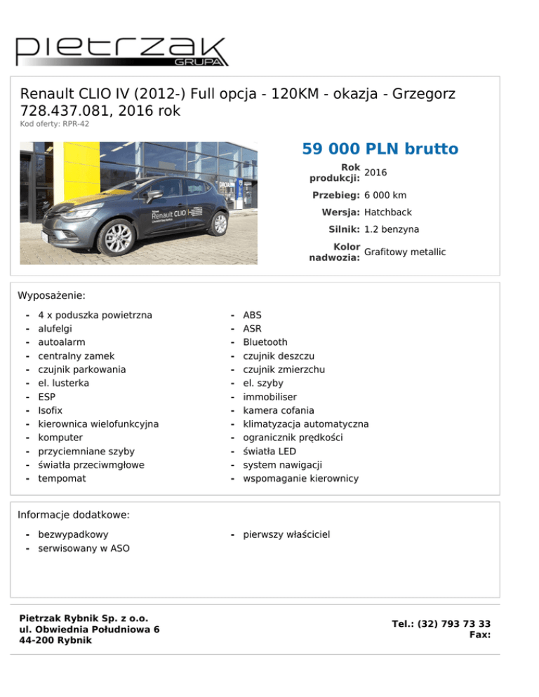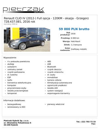 Renault CLIO IV (2012-) Full opcja - 120KM - okazja - Grzegorz 728.437.081, 2016 rok Kod oferty: RPR-42 59 000 PLN brutto Rok 2016 produkcji: Przebieg: 6 000 km Wersja: Hatchback Silnik: 1.2 benzyna Kolor Grafitowy metallic nadwozia: Wyposażenie: - 4 x poduszka powietrzna alufelgi autoalarm centralny zamek czujnik parkowania el. lusterka ESP Isofix kierownica wielofunkcyjna komputer przyciemniane szyby światła przeciwmgłowe tempomat - ABS ASR Bluetooth czujnik deszczu czujnik zmierzchu el. szyby immobiliser kamera cofania klimatyzacja automatyczna ogranicznik prędkości światła LED system nawigacji wspomaganie kierownicy Informacje dodatkowe: - bezwypadkowy - serwisowany w ASO Pietrzak Rybnik Sp. z o.o. ul. Obwiednia Południowa 6 44-200 Rybnik - pierwszy właściciel Tel.: (32) 793 73 33 Fax: