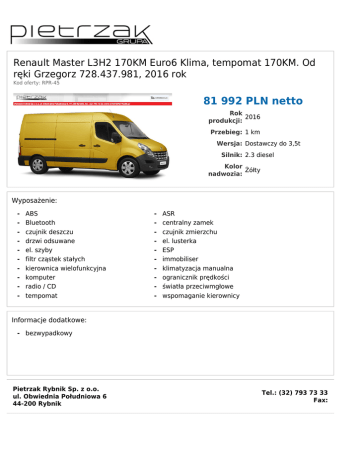 Renault Master L3H2 170KM Euro6 Klima, tempomat 170KM. Od ręki Grzegorz 728.437.981, 2016 rok Kod oferty: RPR-45 81 992 PLN netto Rok 2016 produkcji: Przebieg: 1 km Wersja: Dostawczy do 3,5t Silnik: 2.3 diesel Kolor Żółty nadwozia: Wyposażenie: - ABS Bluetooth czujnik deszczu drzwi odsuwane el. szyby filtr cząstek stałych kierownica wielofunkcyjna komputer radio / CD tempomat - ASR centralny zamek czujnik zmierzchu el. lusterka ESP immobiliser klimatyzacja manualna ogranicznik prędkości światła przeciwmgłowe wspomaganie kierownicy Informacje dodatkowe: - bezwypadkowy Pietrzak Rybnik Sp. z o.o. ul. Obwiednia Południowa 6 44-200 Rybnik Tel.: (32) 793 73 33 Fax: