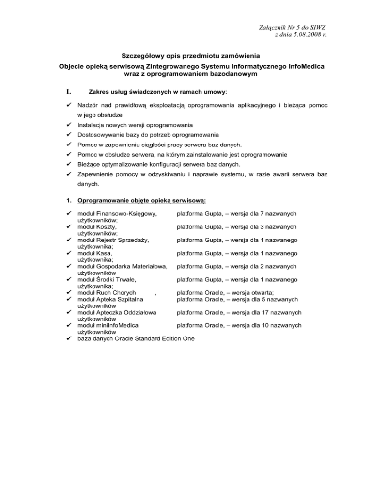 Załącznik Nr 5 do SIWZ z dnia 5.08.2008 r. Szczegółowy opis przedmiotu zamówienia Objecie opieką serwisową Zintegrowanego Systemu Informatycznego InfoMedica wraz z oprogramowaniem bazodanowym I. Zakres usług świadczonych w ramach umowy: Nadzór nad prawidłową eksploatacją oprogramowania aplikacyjnego i bieżąca pomoc w jego obsłudze Instalacja nowych wersji oprogramowania Dostosowywanie bazy do potrzeb oprogramowania Pomoc w zapewnieniu ciągłości pracy serwera baz danych. Pomoc w obsłudze serwera, na którym zainstalowanie jest oprogramowanie Bieżące optymalizowanie konfiguracji serwera baz danych. Zapewnienie pomocy w odzyskiwaniu i naprawie systemu, w razie awarii serwera baz danych. 1. Oprogramowanie objęte opieką serwisową: moduł Finansowo-Księgowy, platforma Gupta, – wersja dla 7 nazwanych użytkowników; moduł Koszty, platforma Gupta, – wersja dla 3 nazwanych użytkowników; moduł Rejestr Sprzedaży, platforma Gupta, – wersja dla 1 nazwanego użytkownika; moduł Kasa, platforma Gupta, – wersja dla 1 nazwanego użytkownika; moduł Gospodarka Materiałowa, platforma Gupta, – wersja dla 2 nazwanych użytkowników moduł Środki Trwałe, platforma Gupta, – wersja dla 1 nazwanego użytkownika; moduł Ruch Chorych , platforma Oracle, – wersja otwarta; moduł Apteka Szpitalna platforma Oracle, – wersja dla 5 nazwanych użytkowników moduł Apteczka Oddziałowa platforma Oracle, – wersja dla 17 nazwanych użytkowników moduł miniInfoMedica platforma Oracle, – wersja dla 10 nazwanych użytkowników baza danych Oracle Standard Edition One