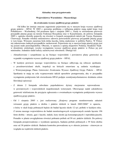 Aktualny stan przygotowania Województwa Warmińsko - Mazurskiego do zwalczania wysoce zjadliwej grypy ptaków Od kilku lat istnieje znaczne zagrożenie pojawienia się w naszym kraju wysoce zjadliwej grypy ptaków - HPAI. W 2005 r. poważne problemy z influenzą ptaków mają nadal kraje Azji Południowo - Wschodniej. Od przełomu lipca i sierpnia 2005 r., kiedy to stwierdzono pierwsze przypadki ptasiej grypy na terenie Federacji Rosyjskiej oraz w Kazachstanie, do połowy listopada 2005 r. ogniska choroby pojawiły się również w krajach europejskich takich jak Turcja, Rumunia, Chorwacja. Ponadto włoskie ministerstwo zdrowia potwierdziło pierwszy przypadek ptasiej grypy w tym kraju. Wirusem zarażona była dzika kaczka, którą znaleziono w pobliżu Padwy. W Polsce nie odnotowano żadnych przypadków zachorowań. Pojawienie się w naszym kraju ptasiej grypy jest tej jesieni mało prawdopodobne. Obecnie, w oparciu o opinię ekspertów Polskiej Akademii Nauk w dziedzinie ornitologii, ryzyko wystąpienia wysoce zjadliwej grypy ptaków w Polsce jej jest minimalne. Jednakże nadal należy zachowywać ostrożność. Dlatego też: – Aktualizowane i uzupełniane są na bieżąco wojewódzki i powiatowe plany gotowości na wypadek wystąpienia wysoce zjadliwej grypy ptaków – HPAI, – W każdym powiecie naszego województwa na bieżąco odbywają się robocze spotkania z przedstawicielami służb, inspekcji na których omawiane są zadania wynikające z Weterynaryjnego Planu Gotowości Zwalczania Wysoce Zjadliwej Grypy Ptaków - HPAI. Spotkania te mają na celu wypracowanie takich sposobów postępowania, aby w przypadku wystąpienia podejrzenia lub stwierdzenia HPAI podjęte zostałynatychmiastowe działania celem likwidacji epizoocji. – Z dniem 2 listopada odwołano popołudniowe dyżury stacjonarne wprowadzone w powiatowych i wojewódzkich inspektoratach weterynarii. Obowiązuje nadal całodobowa gotowość telefoniczna do przyjęcia zgłoszenia o ewentualnym wystąpieniu podejrzenia wysoce zjadliwej grypy ptaków. – Od 1 sierpnia 2005 r. jest realizowany „Krajowy program monitorowania zakażeń wirusami grypy ptaków u drobiu i ptaków dzikich w latach 2005/2006" w oparciu, o który w skali kraju pobranych będzie do badań łącznie około 12 tyś. próbek w każdym roku. Z terenu naszego województwa do badań monitoringowych wytypowanych zostało łącznie 196 ferm drobiu - strusie, gęsi i kaczki, indyki, kury nioski jaj konsumpcyjnych i reprodukcyjnych). Ponadto w planie uwzględniono również pobranie próbek od 50 szt. ptaków dzikich. Do połowy listopada przeprowadzono z wynikiem ujemnym, badania próbek pobranych z 59 ferm drobiu oraz od 30 ptaków dzikich. Badania kontrolne prowadzone są w okresie jesienno - zimowym ze względu na wędrówki dzikich ptaków. - W Dzienniku Ustaw z dnia 9 listopada 2005 r. opublikowano rozporządzenie Ministra Rolnictwa i Rozwoju Wsi z dnia 8 listopada 2005 r. zmieniające rozporządzenie z dnia 15 października 2005 r. w sprawie zarządzenia środków związanych z zagrożeniem wystąpienia wysoce zjadliwej grypy ptaków d. pomoru drobiu. Zmiany polegają na rozszerzeniu zakazu organizowania targów, pokazów i konkursów zwierząt na wszystkie gatunki ptaków oraz na zezwoleniu na utrzymywanie na otwartej przestrzeni kaczek, gęsi, indyków, przepiórek, perlić, strusi oraz innych bezgrzebieniowców, gołębi, bażantów i kuropatw na otwartej przestrzeni, jeżeli ich karmienie i pojenie odbywa się w zamkniętym pomieszczeniu lub w miejscu zabezpieczonym przed dostępem dzikich ptaków. - Nadal obowiązuje zakaz przywozu żywych ptaków, jaj, świeżego mięsa oraz innych produktów nie poddanych obróbce cieplnej z rejonów dotkniętych chorobą. Szczególnej kontroli podlega bagaż podręczny osób przyjeżdżających do Polski z Azji południowo -wschodniej, Federacji Rosyjskiej, Turcji, Rumunii oraz Chorwacji. - Wszystkie przejścia graniczne w województwie warmińsko - mazurskim zaopatrzone są w pojemniki na odpady żywnościowe zwierzęcego pochodzenia i egzekwowane są postanowienia rozporządzenia Komisji (WE ) nr 745/2004 z dnia 16 kwietnia 2004 r. ustanawiające środki w odniesieniu do przywozu produktów pochodzenia zwierzęcego przeznaczonego do indywidualnego spożycia. - W miesiącu listopadzie decyzją Ministra Finansów zwiększony został budżet w rozdziale 1022 o kwotę 500 tyś. złotych. Z czego 300 tysięcy zostało rozdysponowane na Powiatowe Inspektoraty Weterynarii, które jeszcze w 2005 r. nabędą brakujący sprzęt i materiały do pełnego zabezpieczenia Powiatowych Centrów Kryzysowych na wypadek wystąpienia HPAI. Natomiast 200 tysięcy zostało przeniesione na środki niewygasające i przeznaczone na wynagrodzenia dla lekarzy weterynarii wolno praktykujących oraz opłacenie badań laboratoryjnych, zakup środków dezynfekcyjnych i delegacje pracowników Inspekcji Weterynaryjnej.