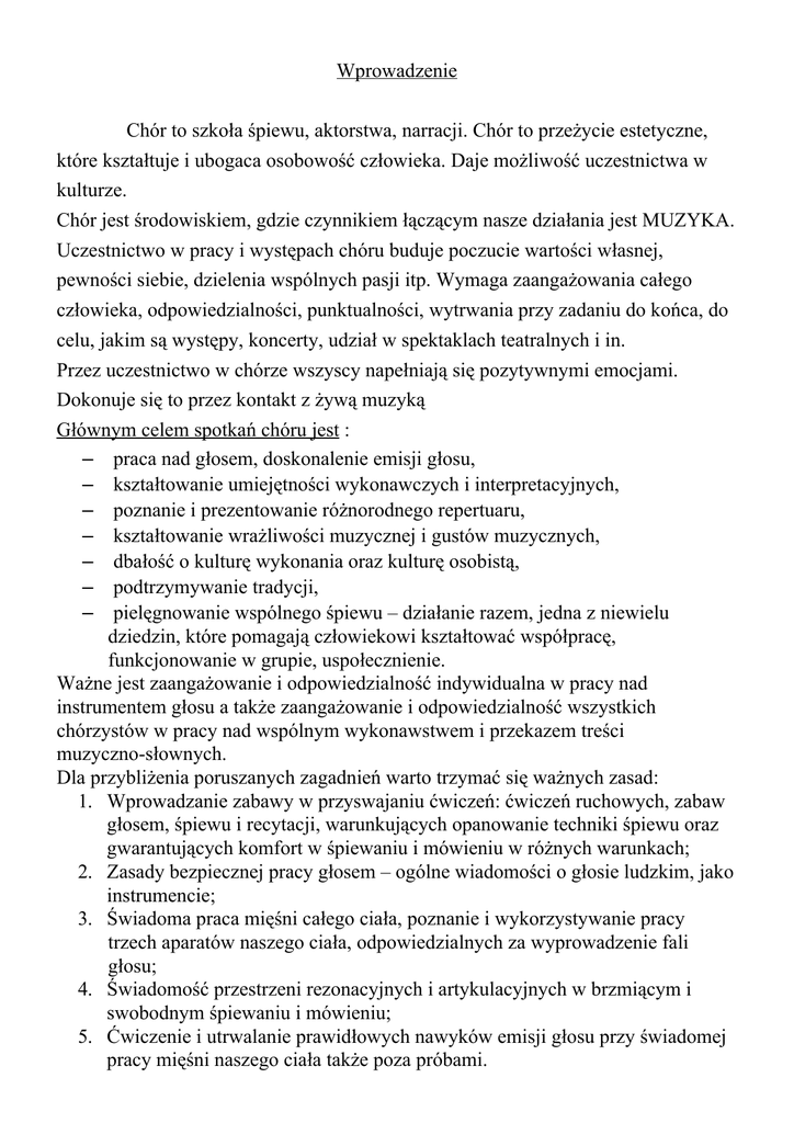 Wprowadzenie Chór to szkoła śpiewu, aktorstwa, narracji. Chór to przeżycie estetyczne, które kształtuje i ubogaca osobowość człowieka. Daje możliwość uczestnictwa w kulturze. Chór jest środowiskiem, gdzie czynnikiem łączącym nasze działania jest MUZYKA. Uczestnictwo w pracy i występach chóru buduje poczucie wartości własnej, pewności siebie, dzielenia wspólnych pasji itp. Wymaga zaangażowania całego człowieka, odpowiedzialności, punktualności, wytrwania przy zadaniu do końca, do celu, jakim są występy, koncerty, udział w spektaklach teatralnych i in. Przez uczestnictwo w chórze wszyscy napełniają się pozytywnymi emocjami. Dokonuje się to przez kontakt z żywą muzyką Głównym celem spotkań chóru jest : – praca nad głosem, doskonalenie emisji głosu, – kształtowanie umiejętności wykonawczych i interpretacyjnych, – poznanie i prezentowanie różnorodnego repertuaru, – kształtowanie wrażliwości muzycznej i gustów muzycznych, – dbałość o kulturę wykonania oraz kulturę osobistą, – podtrzymywanie tradycji, – pielęgnowanie wspólnego śpiewu – działanie razem, jedna z niewielu dziedzin, które pomagają człowiekowi kształtować współpracę, funkcjonowanie w grupie, uspołecznienie. Ważne jest zaangażowanie i odpowiedzialność indywidualna w pracy nad instrumentem głosu a także zaangażowanie i odpowiedzialność wszystkich chórzystów w pracy nad wspólnym wykonawstwem i przekazem treści muzycznosłownych. Dla przybliżenia poruszanych zagadnień warto trzymać się ważnych zasad: 1. Wprowadzanie zabawy w przyswajaniu ćwiczeń: ćwiczeń ruchowych, zabaw głosem, śpiewu i recytacji, warunkujących opanowanie techniki śpiewu oraz gwarantujących komfort w śpiewaniu i mówieniu w różnych warunkach; 2. Zasady bezpiecznej pracy głosem – ogólne wiadomości o głosie ludzkim, jako instrumencie; 3. Świadoma praca mięśni całego ciała, poznanie i wykorzystywanie pracy trzech aparatów naszego ciała, odpowiedzialnych za wyprowadzenie fali głosu; 4. Świadomość przestrzeni rezonacyjnych i artykulacyjnych w brzmiącym i swobodnym śpiewaniu i mówieniu; 5. Ćwiczenie i utrwalanie prawidłowych nawyków emisji głosu przy świadomej pracy mięśni naszego ciała także poza próbami. 1. 2. 3. 4. 5. 6. 7. Regulamin Chór jest zespołem amatorskim, działającym przy GCK Powozownia pod kierunkiem dyrygenta i specjalisty od emisji głosu. Nad sprawami organizacyjnymi chóru czuwa Gospodarz , wybrany spośród członków chóru. Próby chóru odbywają się dwa razy w tygodniu: jedna próba, 2x45 min – całość chóru; druga próba 45 min – emisja indywidualna. Osoby zgłaszające się do Chóru przyjmowane są na okres próbny, dla możliwości kształcenia emisji i poznania repertuaru. Dyrygent po rozeznaniu talentu, pracy kandydata i jego zaangażowania, decyduje o przyjęciu go do zespołu. Jeśli członkowie chóru z różnych powodów często opuszczają próby, nie ma postępu w śpiewie lub nie znają repertuaru, będą poinformowane o decyzji urlopowania lub rezygnacji z uczestnictwa w chórze. Wszelkie problematyczne sprawy, dotyczące lekceważenia regulaminu, braku odpowiedzialności za efekty pracy artystycznej chóru będą rozważane przez Zarząd, który o swej decyzji niezwłocznie poinformuje. 1. Zarząd chóru 2. Dyrygent odpowiada za wykonawstwo i poziom artystyczny zespołu; prowadzi warsztaty emisji głosu z całym zespołem, z podziałem na głosy i zajęcia indywidualne; pracuje nad repertuarem, prowadzi pracę chóru podczas prób i występów; planuje pracę artystyczną zespołu czyli planuje występy, udział w projektach artystycznych i imprezach na terenie naszego środowiska i regionu; 3. Gospodarz i Sekretarz koordynacja pracy z zespołem; czuwanie nad organizacją chóru, prowadzenie listy obecności oraz czuwanie nad innymi sprawami, wynikającymi ze specyfiki chóru. wspieranie pracy dyrygenta, czuwanie nad zdyscyplinowaniem zespołu, obecnościami, punktualnością; systematyczne prowadzenie Kroniki Chóru; konsultacje i ustalanie z zespołem i dyrygentem ważnych spraw organizacyjnych; rozważanie wraz z dyrygentem trudnych, spornych spraw, dotyczących pracy zespołu lub jego członków; 4. Zadania członków chóru: Zaangażowanie się w pracę chóru i troska o dobrą, miłą atmosferę. Dbałość o staranne wykonywanie ćwiczeń i poleceń dyrygenta. Ćwiczenie i utrwalanie w domu repertuaru oraz poznanej techniki śpiewu. Zaangażowanie i odpowiedzialność za wykonawstwo indywidualne i zbiorowe. Aktywne i staranne uczestniczenie w próbach i występach. Świadoma i odpowiedzialna obecność na próbach i występach. Obowiązkowa obecność wszystkich na próbach generalnych. Zgłaszanie do Zarządu chóru wszelkich przeszkód, uniemożliwiających udział w próbach lub realizowanych projektach, występach i imprezach. Troska i odpowiedzialność za kostiumy chóru. W razie rezygnacji należy zgłosić tę informację do Zarządu i do Dyrygenta oraz zwrócić kostium, materiały nutowe i teksty chóralne.