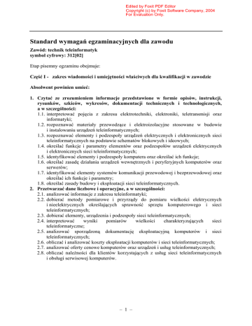 Edited by Foxit PDF Editor Copyright (c) by Foxit Software Company, 2004 For Evaluation Only. Standard wymagań egzaminacyjnych dla zawodu Zawód: technik teleinformatyk symbol cyfrowy: 312[02] Etap pisemny egzaminu obejmuje: Część I - zakres wiadomości i umiejętności właściwych dla kwalifikacji w zawodzie Absolwent powinien umieć: 1. Czytać ze zrozumieniem informacje przedstawione w formie opisów, instrukcji, rysunków, szkiców, wykresów, dokumentacji technicznych i technologicznych, a w szczególności: 1.1. interpretować pojęcia z zakresu elektrotechniki, elektroniki, teletransmisji oraz informatyki; 1.2. rozpoznawać materiały przewodzące i elektroizolacyjne stosowane w budowie i instalowaniu urządzeń teleinformatycznych; 1.3. rozpoznawać elementy i podzespoły urządzeń elektrycznych i elektronicznych sieci teleinformatycznych na podstawie schematów blokowych i ideowych; 1.4. określać funkcje i parametry elementów oraz podzespołów urządzeń elektrycznych i elektronicznych sieci teleinformatycznych; 1.5. identyfikować elementy i podzespoły komputera oraz określać ich funkcje; 1.6. określać zasadę działania urządzeń wewnętrznych i peryferyjnych komputerów oraz serwerów; 1.7. identyfikować elementy systemów komunikacji przewodowej i bezprzewodowej oraz określać ich funkcje i parametry; 1.8. określać zasady budowy i eksploatacji sieci teleinformatycznych. 2. Przetwarzać dane liczbowe i operacyjne, a w szczególności: 2.1. analizować informacje z zakresu teleinformatyki; 2.2. dobierać metody pomiarowe i przyrządy do pomiaru wielkości elektrycznych i nieelektrycznych określających sprawność sprzętu komputerowego i sieci teleinformatycznych; 2.3. dobierać elementy, urządzenia i podzespoły sieci teleinformatycznych; 2.4. interpretować wyniki pomiarów wielkości charakteryzujących sieci teleinformatyczne; 2.5. analizować sporządzoną dokumentację eksploatacyjną komputerów i sieci teleinformatycznych; 2.6. obliczać i analizować koszty eksploatacji komputerów i sieci teleinformatycznych; 2.7. analizować oferty cenowe komputerów oraz urządzeń i usług teleinformatycznych; 2.8. obliczać należności dla klientów korzystających z usług sieci teleinformatycznych i obsługi serwisowej komputerów. – 1 – Edited by Foxit PDF Editor Copyright (c) by Foxit Software Company, 2004 For Evaluation Only. 3. Bezpiecznie wykonywać zadania zawodowe zgodnie z przepisami bezpieczeństwa i higieny pracy, ochrony przeciwpożarowej oraz ochrony środowiska, a w szczególności: 3.1. stosować procedury w stanach awaryjnych, zagrożenia i w przypadku naprawy urządzeń teleinformatycznych; 3.2. stosować przepisy bezpieczeństwa i higieny pracy, ze szczególnym uwzględnieniem pracy przy urządzeniach elektrycznych, komputerowych i emitujących pola elektromagnetyczne oraz ochrony środowiska; 3.3. określać czynności związane z udzielaniem pierwszej pomocy w wypadkach porażenia prądem elektrycznym. Część II - zakres wiadomości i umiejętności związanych z zatrudnieniem i działalnością gospodarczą Absolwent powinien umieć: 1. Czytać ze zrozumieniem informacje przedstawione w formie opisów, instrukcji, tabel, wykresów, a w szczególności: 1.1. rozróżniać podstawowe pojęcia i terminy z zakresu funkcjonowania gospodarki oraz prawa pracy, prawa podatkowego i przepisów regulujących podejmowanie i wykonywanie działalności gospodarczej; 1.2. rozróżniać dokumenty związane z zatrudnieniem oraz podejmowaniem i wykonywaniem działalności gospodarczej; 1.3. identyfikować i analizować informacje dotyczące wymagań i uprawnień pracownika, pracodawcy, bezrobotnego oraz klienta. 2. Przetwarzać dane liczbowe i operacyjne, a w szczególności: 2.1. analizować informacje związane z podnoszeniem kwalifikacji, poszukiwaniem pracy i zatrudnieniem oraz podejmowaniem i wykonywaniem działalności gospodarczej; 2.2. sporządzać dokumenty związane z poszukiwaniem pracy i zatrudnieniem oraz podejmowaniem i wykonywaniem działalności gospodarczej; 2.3. rozróżniać skutki wynikające z nawiązania i rozwiązania stosunku pracy. Etap praktyczny egzaminu obejmuje wykonanie określonego zadania egzaminacyjnego wynikającego z zadania o treści ogólnej: Opracowanie projektu realizacji i wykonanie prac z zakresu montażu, uruchamiania i konfiguracji komputerów oraz instalowania, uruchamiania, konfiguracji i administrowania sieci komputerowych na podstawie dokumentacji technicznej. Absolwent powinien umieć: 1. Analizować dokumentację techniczną, instrukcje obsługi, normy, katalogi: sieci informatycznych, elementów, urządzeń i podzespołów dla potrzeb opracowywania projektu realizacji prac. 2. Dobierać technologie, metody i techniki montażu, uruchamiania i eksploatacji sieci informatycznych, ich elementów, podzespołów i urządzeń z uwzględnieniem ich właściwości na podstawie dokumentacji technicznej, norm, katalogów i poradników. 3. Dobierać narzędzia, maszyny i urządzenia w odniesieniu do określonej technologii, metod i technik montażu, eksploatacji i napraw komputerów i sieci informatycznych na podstawie dokumentacji technicznej. – 2 – Edited by Foxit PDF Editor Copyright (c) by Foxit Software Company, 2004 For Evaluation Only. 4. Dobierać metody, techniki i urządzenia do kontroli wielkości parametrów sieci teleinformatycznych. 5. Określać warunki eksploatacji i napraw sieci informatycznych. 6. Opracowywać projekt przebiegu procesu montażu, uruchamiania, konfigurowania i eksploatacji sieci informatycznych. 7. Opracowywać harmonogramy prac realizowanych w procesie montażu, uruchamiania, konfigurowania i eksploatacji sieci informatycznych, z uwzględnieniem norm technicznych, przepisów bezpieczeństwa i higieny pracy, ergonomii, ochrony środowiska oraz systemów zapewnienia jakości. 8. Wykonywać prace związane z montażem, uruchamianiem, konfigurowaniem i eksploatacją sieci i