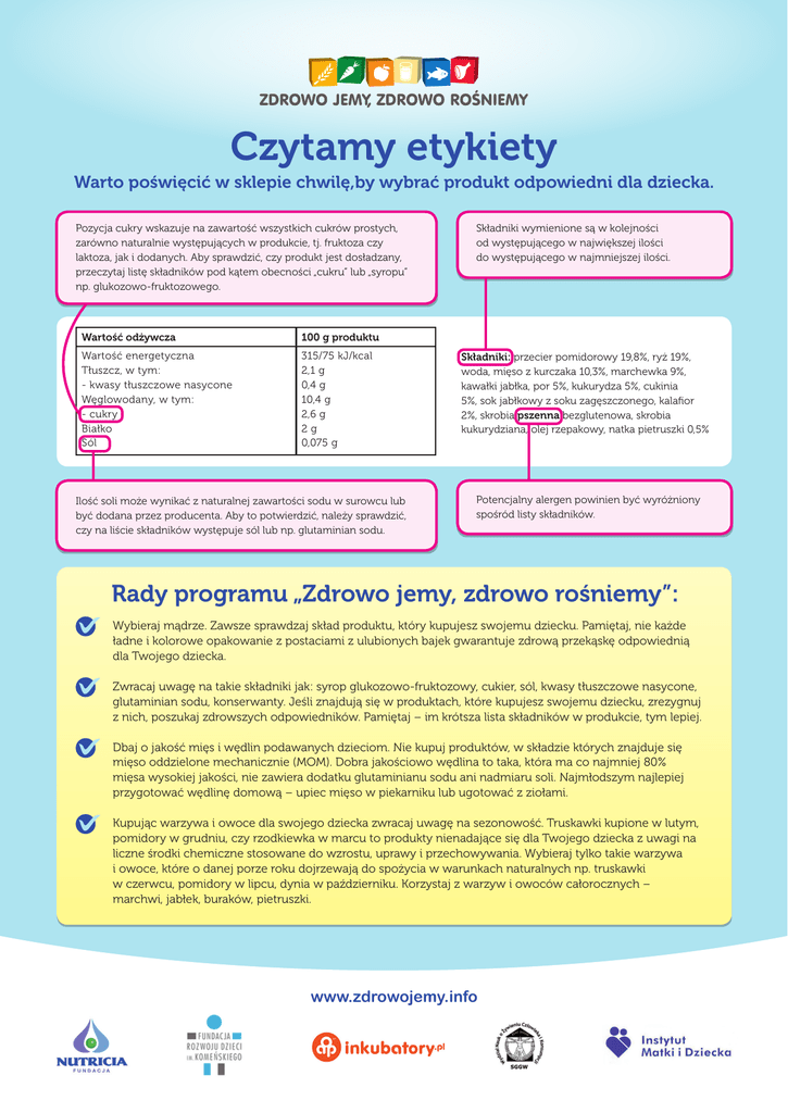 Czytamy etykiety Warto poświęcić w sklepie chwilę,by wybrać produkt odpowiedni dla dziecka. Pozycja cukry wskazuje na zawartość wszystkich cukrów prostych, zarówno naturalnie występujących w produkcie, tj. fruktoza czy laktoza, jak i dodanych. Aby sprawdzić, czy produkt jest dosładzany, przeczytaj listę składników pod kątem obecności „cukru” lub „syropu” np. glukozowo-fruktozowego. Wartość odżywcza 100 g produktu Wartość energetyczna Tłuszcz, w tym: - kwasy tłuszczowe nasycone Węglowodany, w tym: - cukry Białko Sól 315/75 kJ/kcal 2,1 g 0,4 g 10,4 g 2,6 g 2g 0,075 g Ilość soli może wynikać z naturalnej zawartości sodu w surowcu lub być dodana przez producenta. Aby to potwierdzić, należy sprawdzić, czy na liście składników występuje sól lub np. glutaminian sodu. Składniki wymienione są w kolejności od występującego w największej ilości do występującego w najmniejszej ilości. Składniki: przecier pomidorowy 19,8%, ryż 19%, woda, mięso z kurczaka 10,3%, marchewka 9%, kawałki jabłka, por 5%, kukurydza 5%, cukinia 5%, sok jabłkowy z soku zagęszczonego, kalafior 2%, skrobia pszenna bezglutenowa, skrobia kukurydziana, olej rzepakowy, natka pietruszki 0,5% Potencjalny alergen powinien być wyróżniony spośród listy składników. Rady programu „Zdrowo jemy, zdrowo rośniemy”: Wybieraj mądrze. Zawsze sprawdzaj skład produktu, który kupujesz swojemu dziecku. Pamiętaj, nie każde ładne i kolorowe opakowanie z postaciami z ulubionych bajek gwarantuje zdrową przekąskę odpowiednią dla Twojego dziecka. Zwracaj uwagę na takie składniki jak: syrop glukozowo-fruktozowy, cukier, sól, kwasy tłuszczowe nasycone, glutaminian sodu, konserwanty. Jeśli znajdują się w produktach, które kupujesz swojemu dziecku, zrezygnuj z nich, poszukaj zdrowszych odpowiedników. Pamiętaj – im krótsza lista składników w produkcie, tym lepiej. Dbaj o jakość mięs i wędlin podawanych dzieciom. Nie kupuj produktów, w składzie których znajduje się mięso oddzielone mechanicznie (MOM). Dobra jakościowo wędlina to taka, która ma co najmniej 80% mięsa wysokiej jakości, nie zawiera dodatku glutaminianu sodu ani nadmiaru soli. Najmłodszym najlepiej przygotować wędlinę domową – upiec mięso w piekarniku lub ugotować z ziołami. Kupując warzywa i owoce dla swojego dziecka zwracaj uwagę na sezonowość. Truskawki kupione w lutym, pomidory w grudniu, czy rzodkiewka w marcu to produkty nienadające się dla Twojego dziecka z uwagi na liczne środki chemiczne stosowane do wzrostu, uprawy i przechowywania. Wybieraj tylko takie warzywa i owoce, które o danej porze roku dojrzewają do spożycia w warunkach naturalnych np. truskawki w czerwcu, pomidory w lipcu, dynia w październiku. Korzystaj z warzyw i owoców całorocznych – marchwi, jabłek, buraków, pietruszki. www.zdrowojemy.info