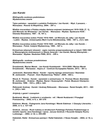 Jan Karski Bibliografia osobowa podmiotowa Wydawnictwa zwarte Tajne państwo : opowieść o polskim Podziemiu / Jan Karski. - Wyd. 2 poszerz. Warszawa : Rosner & Wspólnicy, 2004. - 297 s. Wielkie mocarstwa a Polska między dwiema wojnami światowymi 1919-1939. [T. 1], (Od Wersalu do Września) / Jan Karski. - Warszawa : Wydaw. Społeczne KOS : Oświata Niezależna, 1987. - III, 191 s. Wielkie mocarstwa wobec Polski 1919-1945 : od Wersalu do Jałty / Jan Karski - Lublin : Wydaw. Uniwersytetu Marii Curie-Skłodowskiej, 1998. - 507 s., [1] k. tabl. Wielkie mocarstwa wobec Polski 1919-1945 : od Wersalu do Jałty / Jan Karski. Warszawa : Państ. Instytut Wydawniczy, 1992. - 547 s. Emisariusz własnymi słowami : zapis rozmów przeprowadzonych w latach 1995-1997 w Waszyngtonie emitowanych w Głosie Ameryki / Jan Karski, Maciej Wierzyński. Warszawa : Wydaw. Naukowe PWN, 2012. - 255 s. Bibliografia osobowa przedmiotowa Wydawnictwa zwarte Drozdowski, Marian Marek : Jan Karski Kozielewski : 1914-2000 / Marian Marek Drozdowski. - Warszawa : Aspra-Jr : Centrum Europejskie Natolin, 2013. - 361 s. Jankowski, Stanisław Maria : Karski : raporty tajnego emisariusza / Stanisław M. Jankowski. - Poznań : Dom Wydawniczy "Rebis", 2009. - 604 s. Wood, E. Thomas : Karski : opowieść o emisariuszu / E. Thomas Wood, Stanisław M. Jankowski. - Kraków : Wydaw. Baran i Suszczyński : Państ. Muzeum OświęcimBrzezinka, 1996. - 334 s., [48] s. tabl. Żbikowski Andrzej : Karski / Andrzej Żbikowski. - Warszawa : Świat Książki, 2011. - 503 s., [24] s. tabl. Artykuły z gazet i czasopism Budziarek, Marek : Łodzianin z urodzenia : ref. / Marek Nudziarek // Przegląd Powszechny. - 2002, nr 6, s. 361-370 Edelman, Marek : Pożegnanie Jana Karskiego / Marek Edelman // Zeszyty Literackie. 2000, nr 4, s. 127-128 Gmitruk, Janusz : Ruch ludowy w strukturach Polskiego Państwa Podziemnego w świetle raportu Jana Karskiego / oprac. Janusz Gmitruk // Roczniki Dziejów Ruchu Ludowego. – 2002, nr 32, s. 255-298 Habielski, Rafał : Emisariusz pamięci / Rafał Habielski. // Nowe Książki. - 2004, nr 10, s. 11 Jankowski, Stanisław Maria : Filmowe plany emisariusza Karskiego / Stanisław M. Jankowski // Realia i co Dalej... . - 2008, nr 2, s. 147-156 Kaliski, Bartosz : Ambasador Państwa Podziemnego / Bartosz Kaliski // Nowe Książki. - 2011, nr 8, s. 59-60 Kaliski, Bartosz : Człowiek, który próbował zatrzymać Zagładę / Bartosz Kaliski // Nowe Książki. - 2010, nr 2, s. 61-62 Markiewicz, Tomasz : [Karski - recenzja] / Tomasz Markiewicz // Nowe Książki. - 1996, nr 11, s. 18 Mościcki, Paweł : Karski : paradoks o świadku / Paweł Mościcki // Teksty Drugie. 2012, nr 4, s. 15-33 Nawrocki, Witold : [Karski - recenzja] / Witold Nawrocki. // Dziś. - 1997, nr 1, s. 120-124 Piasecki, Waldemar : Lekcja Karskiego / Waldemar Piasecki // Dziś. – 2005, R. 16, nr 9, s. 39-45