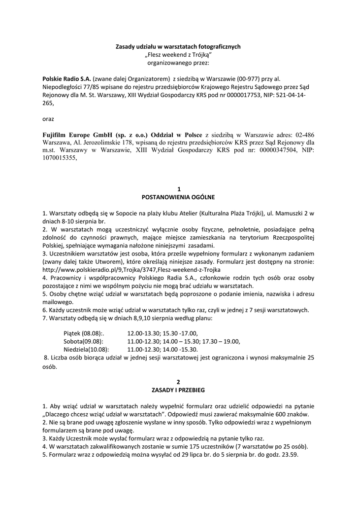 Zasady udziału w warsztatach fotograficznych „Flesz weekend z Trójką” organizowanego przez: Polskie Radio S.A. (zwane dalej Organizatorem) z siedzibą w Warszawie (00-977) przy al. Niepodległości 77/85 wpisane do rejestru przedsiębiorców Krajowego Rejestru Sądowego przez Sąd Rejonowy dla M. St. Warszawy, XIII Wydział Gospodarczy KRS pod nr 0000017753, NIP: 521-04-14265, oraz Fujifilm Europe GmbH (sp. z o.o.) Oddział w Polsce z siedzibą w Warszawie adres: 02-486 Warszawa, Al. Jerozolimskie 178, wpisaną do rejestru przedsiębiorców KRS przez Sąd Rejonowy dla m.st. Warszawy w Warszawie, XIII Wydział Gospodarczy KRS pod nr: 00000347504, NIP: 1070015355, 1 POSTANOWIENIA OGÓLNE 1. Warsztaty odbędą się w Sopocie na plaży klubu Atelier (Kulturalna Plaża Trójki), ul. Mamuszki 2 w dniach 8-10 sierpnia br. 2. W warsztatach mogą uczestniczyć wyłącznie osoby fizyczne, pełnoletnie, posiadające pełną zdolność do czynności prawnych, mające miejsce zamieszkania na terytorium Rzeczpospolitej Polskiej, spełniające wymagania nałożone niniejszymi zasadami. 3. Uczestnikiem warsztatów jest osoba, która prześle wypełniony formularz z wykonanym zadaniem (zwany dalej także Utworem), które określają niniejsze zasady. Formularz jest dostępny na stronie: http://www.polskieradio.pl/9,Trojka/3747,Flesz-weekend-z-Trojka 4. Pracownicy i współpracownicy Polskiego Radia S.A., członkowie rodzin tych osób oraz osoby pozostające z nimi we wspólnym pożyciu nie mogą brać udziału w warsztatach. 5. Osoby chętne wziąć udział w warsztatach będą poproszone o podanie imienia, nazwiska i adresu mailowego. 6. Każdy uczestnik może wziąć udział w warsztatach tylko raz, czyli w jednej z 7 sesji warsztatowych. 7. Warsztaty odbędą się w dniach 8,9,10 sierpnia według planu: Piątek (08.08):. 12.00-13.30; 15.30 -17.00, Sobota(09.08): 11.00-12.30; 14.00 – 15.30; 17.30 – 19.00, Niedziela(10.08): 11.00-12.30; 14.00 -15.30. 8. Liczba osób biorąca udział w jednej sesji warsztatowej jest ograniczona i wynosi maksymalnie 25 osób. 2 ZASADY I PRZEBIEG 1. Aby wziąć udział w warsztatach należy wypełnić formularz oraz udzielić odpowiedzi na pytanie „Dlaczego chcesz wziąć udział w warsztatach”. Odpowiedź musi zawierać maksymalnie 600 znaków. 2. Nie są brane pod uwagę zgłoszenie wysłane w inny sposób. Tylko odpowiedzi wraz z wypełnionym formularzem są brane pod uwagę. 3. Każdy Uczestnik może wysłać formularz wraz z odpowiedzią na pytanie tylko raz. 4. W warsztatach zakwalifikowanych zostanie w sumie 175 uczestników (7 warsztatów po 25 osób). 5. Formularz wraz z odpowiedzią można wysyłać od 29 lipca br. do 5 sierpnia br. do godz. 23.59. 6. W nadesłanym formularzu można wskazać, który warsztat, którego dnia i o której godzinie interesuje uczestnika najbardziej. Jednak Organizator ze względu na ograniczoną liczbę miejsc może wskazać Uczestnikowi inny termin, który zostanie przez niego zaakceptowany. Jeśli żaden z zaproponowanych terminów nie będzie odpowiadał Uczestnikowi Organizator nie ma obowiązku zapewnienia udziału Uczestnika w warsztatach. 7. Nadesłany Utwór: a) musi być wynikiem osobistej twórczości Uczestnika; b) nie może zawierać treści obraźliwych lub sprzecznych z prawem; c) nie może naruszać praw osób trzecich, w tym w szczególności dóbr osobistych, praw autorskich lub praw własności przemysłowej. 8. Uczestnikami warsztatów są osoby, których odpowiedź na pytanie (wykonanie zadania) zostanie najwyżej oceniona przez Jury, powołane przez Organizatora. Dokonując oceny Jury weźmie pod uwagę oryginalność, pomysłowość, wartość artystyczną tekstu. 9. Uczestnicy udostępnią Organizatorowi swoje dane, które posłużą do kontaktowanie się z nim w celu poinformowania o terminie i godzinie warsztatów. 3 DANE OSOBOWE 1. Administratorem danych osobowych przetwarzanych w związku z realizacją warsztatów jest Organizator. 2. Dane osobowe przekazane Organizatorowi przez Uczestników będą przetwarzane przez Organizatora wyłącznie w celu skontaktowania się w sprawie udziału w warsztatach. Podanie danych osobowych jest dobrowolne, jednak ich niepodanie uniemożliwia udział w warsztatach. Każdy Uczestnik warsztatów posiada prawo wglądu do swoich danych osobowych, do ich poprawiania oraz żądania ich usunięcia. Dane osobowe będą przetwarzane zgodnie z przepisami ustawy z dnia 29 sierpnia 1997 r. o ochronie danych osobowych (t.j.: Dz.U. z 2002r. Nr 101, poz. 926 z późn. zm.) na co każdy Uczestnik Konkursu wyraża zgodę. 4 PRAWA AUTORSKIE 1. Uczestnik warsztatów oświadcza, że zgłoszony Utwór został stworzony samodzielnie przez Uczestnika i jest wolny od praw i roszczeń osób trzecich, w tym dotyczących praw autorskich i pokrewnych oraz że ponosi wobec Organizatora odpowiedzialność z tego tytułu, zwalniając go z wszelkich roszczeń osób trzecich. 2. Z chwilą wysłania Utworu Uczestnik udziela nieodpłatnej, nieograniczonej czasowo i terytorialnie niewyłącznej licencji do korzystania z Utworu (licencja w zakresie autorskich praw majątkowych i praw pokrewnych) na następujących polach eksploatacji: a) utrwalanie i zwielokrotnianie (w tym wprowadzenie do pamięci komputera) Utworu dowolną techniką, b) publiczne udostępnienie Utworu w taki sposób, aby każdy mógł mieć do niego dostęp w miejscu i czasie przez siebie wybranym, c) nadawanie Utworu za pomocą fonii przewodowej lub bezprzewodowej przez stacje naziemne, za pośrednictwem satelity, w sieciach kablowych, telekomunikacyjnych lub multimedialnych lub innych systemach przekazu. 3. Uczestnik upoważnia Organizatora do udostępnienia Utworu anonimowo. 5 REKLAMACJE 1. Wszelkie reklamacje mogą być kierowane do powołanej przez Organizatora Komisji Reklamacyjnej, na adres: "Trójka" Polskie Radio S.A. 00-977 Warszawa, ul. Myśliwiecka 3/5/7. 2. Złożone przez Uczestników reklamacje będą rozpatryw