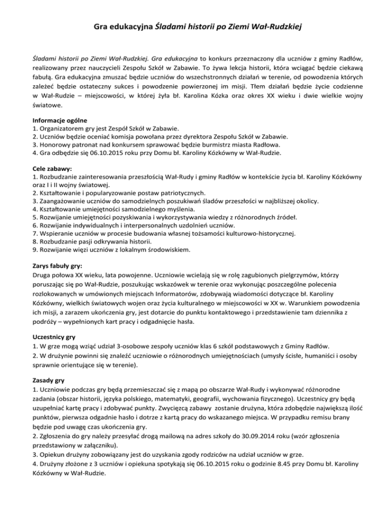 Gra edukacyjna Śladami historii po Ziemi Wał-Rudzkiej Śladami historii po Ziemi Wał-Rudzkiej. Gra edukacyjna to konkurs przeznaczony dla uczniów z gminy Radłów, realizowany przez nauczycieli Zespołu Szkół w Zabawie. To żywa lekcja historii, która wciągać będzie ciekawą fabułą. Gra edukacyjna zmuszać będzie uczniów do wszechstronnych działań w terenie, od powodzenia których zależeć będzie ostateczny sukces i powodzenie powierzonej im misji. Tłem działań będzie życie codzienne w Wał-Rudzie – miejscowości, w której żyła bł. Karolina Kózka oraz okres XX wieku i dwie wielkie wojny światowe. Informacje ogólne 1. Organizatorem gry jest Zespół Szkół w Zabawie. 2. Uczniów będzie oceniać komisja powołana przez dyrektora Zespołu Szkół w Zabawie. 3. Honorowy patronat nad konkursem sprawować będzie burmistrz miasta Radłowa. 4. Gra odbędzie się 06.10.2015 roku przy Domu bł. Karoliny Kózkówny w Wał-Rudzie. Cele zabawy: 1. Rozbudzanie zainteresowania przeszłością Wał-Rudy i gminy Radłów w kontekście życia bł. Karoliny Kózkówny oraz I i II wojny światowej. 2. Kształtowanie i popularyzowanie postaw patriotycznych. 3. Zaangażowanie uczniów do samodzielnych poszukiwań śladów przeszłości w najbliższej okolicy. 4. Kształtowanie umiejętności samodzielnego myślenia. 5. Rozwijanie umiejętności pozyskiwania i wykorzystywania wiedzy z różnorodnych źródeł. 6. Rozwijanie indywidualnych i interpersonalnych uzdolnień uczniów. 7. Wspieranie uczniów w procesie budowania własnej tożsamości kulturowo-historycznej. 8. Rozbudzanie pasji odkrywania historii. 9. Rozwijanie więzi uczniów z lokalnym środowiskiem. Zarys fabuły gry: Druga połowa XX wieku, lata powojenne. Uczniowie wcielają się w rolę zagubionych pielgrzymów, którzy poruszając się po Wał-Rudzie, poszukując wskazówek w terenie oraz wykonując poszczególne polecenia rozlokowanych w umówionych miejscach Informatorów, zdobywają wiadomości dotyczące bł. Karoliny Kózkówny, wielkich światowych wojen oraz życia kulturalnego w miejscowości w XX w. Warunkiem powodzenia ich misji, a zarazem ukończenia gry, jest dotarcie do punktu kontaktowego i przedstawienie tam dziennika z podróży – wypełnionych kart pracy i odgadnięcie hasła. Uczestnicy gry 1. W grze mogą wziąć udział 3-osobowe zespoły uczniów klas 6 szkół podstawowych z Gminy Radłów. 2. W drużynie powinni się znaleźć uczniowie o różnorodnych umiejętnościach (umysły ścisłe, humaniści i osoby sprawnie orientujące się w terenie). Zasady gry 1. Uczniowie podczas gry będą przemieszczać się z mapą po obszarze Wał-Rudy i wykonywać różnorodne zadania (obszar historii, języka polskiego, matematyki, geografii, wychowania fizycznego). Uczestnicy gry będą uzupełniać kartę pracy i zdobywać punkty. Zwycięzcą zabawy zostanie drużyna, która zdobędzie największą ilość punktów, pierwsza odgadnie hasło i dotrze z kartą pracy do wskazanego miejsca. W przypadku remisu brany będzie pod uwagę czas ukończenia gry. 2. Zgłoszenia do gry należy przesyłać drogą mailową na adres szkoły do 30.09.2014 roku (wzór zgłoszenia przedstawiony w załączniku). 3. Opiekun drużyny zobowiązany jest do uzyskania zgody rodziców na udział uczniów w grze. 4. Drużyny złożone z 3 uczniów i opiekuna spotykają się 06.10.2015 roku o godzinie 8.45 przy Domu bł. Karoliny Kózkówny w Wał-Rudzie. 5. Na miejscu spotkania każda z grup otrzyma: kartę zadań, mapę oraz instrukcję z zasadami gry. 6. Gra właściwa rozpoczyna się o godzinie 9.00. 7. Gra trwa ok. 180 minut, grupy wraz z nauczycielem - obserwatorem zobowiązane są dotrzeć we wskazane miejsce przed upływem tego czasu. 8. Rola nauczyciela - obserwatora sprowadzać ma się jedynie do dbania o bezpieczeństwo grających uczniów. 9. Organizatorzy, którzy odgrywać będą role rozmieszczonych w terenie Informatorów, ubrani będą w wyróżniający się, rozpoznawalny strój. 10. Dla zwycięzców przygotowano nagrody. Przykładowa bibliografia: - Dziedzictwo regionalne północnych terenów gminy Radłów, Zabawa 2012, s. 40-46, 101-105, 114-117,154-160. - Ziemia błogosławionej Karoliny. Przewodnik turystyczny, Zabawa 2015. - http://www.pz.lap.pl/?id=news&pokaz=newsy&kat_id=21 Karta zgłoszenia do udziału w konkursie Zgłaszam drużynę do udziału w grze edukacyjnej Śladami historii po Ziemi Wał-Rudzkiej. Nazwa i adres szkoły: ………………………………………………………………………………………………………… ………………………………………………………………………………………………………… ………………………………………………………………………………………………………… Uczniowie (imiona i nazwiska dzieci): 1. ……………………………………………….…………………................................. 2. ……………………………………………….…………………................................. 3. ……………………………………………….…………………................................. Nauczyciel – opiekun (imię i nazwisko): ………………………………………………………………………………………………………… ................………………………………………… (data i podpis nauczyciela-opiekuna) Załącznik nr 1 Oświadczenie 1. Wyrażam zgodę na uczestnictwo mojego dziecka ……………………………………………….…………………......................................................... (imię i nazwisko dziecka) w Konkursie Śladami historii po Ziemi Wał-Rudzkiej. Gra edukacyjna. Konkurs organizowany jest przez Zespół Szkół w Zabawie. 2. Oświadczam, że zapoznałem się z regulaminem konkursu i w pełni akceptuję jego warunki. ................……