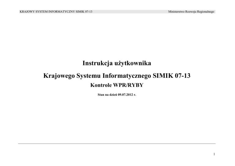 KRAJOWY SYSTEM INFORMATYCZNY SIMIK 07-13 Ministerstwo Rozwoju Regionalnego Instrukcja uŜytkownika Krajowego Systemu Informatycznego SIMIK 07-13 Kontrole WPR/RYBY Stan na dzień 09.07.2012 r. 1 KRAJOWY SYSTEM INFORMATYCZNY SIMIK 07-13 Ministerstwo Rozwoju Regionalnego SPIS TREŚĆI: Kontrole WPR/RYBY.................................................................................................................................................................................................. 3 1. Wyszukiwanie umów .............................................................................................................................................................................................. 4 2. Wyszukiwanie wniosków o płatność ...................................................................................................................................................................... 8 3. Raport numerów umów zarejestrowanych w KSI SIMIK 07-13 ........................................................................................................................... 11 4. Raport numerów umów nie zarejestrowanych w KSI SIMIK 07-13 ..................................................................................................................... 13 2 KRAJOWY SYSTEM INFORMATYCZNY SIMIK 07-13 Ministerstwo Rozwoju Regionalnego Kontrole WPR/RYBY W module Kontrole WPR/RYBY wyszukiwane są dane potrzebne do prowadzenia kontroli krzyŜowych przez uŜytkowników zgłoszonych przez ARiMR. Dane są wyszukiwane w dwóch zakładkach: „Wyszukaj umowę o dofinansowanie” oraz „Wyszukaj wnioski o płatność”. 3 KRAJOWY SYSTEM INFORMATYCZNY SIMIK 07-13 Ministerstwo Rozwoju Regionalnego 1. Wyszukiwanie umów W celu wyboru zakładki Wyszukaj umowę o dofinansowanie naleŜy rozwinąć pozycję menu Kontrole WPR/RYBY. Po wybraniu zakładki Wyszukaj umowę o dofinansowanie system prezentuje kartę z jednym polem <NIP kontrolowanego beneficjenta>. NaleŜy wprowadzić nr NIP wyszukiwanego beneficjenta, a następnie wybrać przycisk „Wyszukaj”. Po wpisaniu wyszukiwanego nr NIP i wyborze przycisku „Wyszukaj” system prezentuje raport zawierający nr NIP kontrolowanego beneficjenta oraz powiązane z tym beneficjentem (nr NIP): nr umowy/aneksu, nazwę instytucji zawierającej umowę o dofinansowanie, tytuł projektu, datę 4 KRAJOWY SYSTEM INFORMATYCZNY SIMIK 07-13 Ministerstwo Rozwoju Regionalnego rozpoczęcia realizacji projektu, datę zakończenia realizacji projektu. W przypadku kiedy wyszukiwany nr NIP kontrowanego beneficjenta nie występuje w KSI, system generuje komunikat: . „WYSZUKIWANO DNIA: …/…./…. (dzień/miesiąc/rok) O GODZ. ….:….:….. (godzina: minuta: sekunda). BENEFICJENT O NUMERZE NIP ……… NIE WYSTĘPUJE W BAZIE KSI (SIMIK 07-13)” ► Uwaga: jest moŜliwość wyboru nr NIP beneficjenta pochodzącego z zagranicy. Po wyszukaniu nr NIP zostaje wyświetlony formularz „Raport numerów NIP zdefiniowanych w KSI SIMIK 07-13”. 5 KRAJOWY SYSTEM INFORMATYCZNY SIMIK 07-13 Ministerstwo Rozwoju Regionalnego 6 KRAJOWY SYSTEM INFORMATYCZNY SIMIK 07-13 ► Uwaga: Wygenerowane raporty poprzez uŜycie ikony Ministerstwo Rozwoju Regionalnego moŜna wydrukować lub po przez uŜycie ikony wyeksportować do Excela. Na formularzu zostają wyświetlone następujące pola: Pole <Data wygenerowania/aktualizacji raportu> – data generowana automatycznie w formacie RRRR-MM-DD, zgodna z datą systemową dnia, w którym został wygenerowany Raport numerów NIP… Pole <NIP kontrolowanego beneficjenta > – wartość zgodna z tym co zostało wprowadzone w polu <NIP kontrolowanego beneficjenta> na Karcie ‘Kontrole WPR/RYBY – wyszukaj umowę o dofinansowanie’ Pole <Numer umowy/aneksu> – wyświetlenie numerów umów/decyzji/aneksów/zmian, jakie zostały zarejestrowane dla podanego numeru NIP. Jeśli w systemie zostało zarejestrowane kilka wersji dokumentów na poziomie modułu umowy/decyzje o dofinansowanie, lista dokumentów jest pogrupowana dla danego numeru NIP. Jeśli dla danego numeru NIP jest zarejestrowanych kilka projektów, numer NIP jest w kolumnie powtarzany przy kaŜdym numerze następnej umowy o dofinansowanie. Na liście wyświetlonych umów istnieje moŜliwość podglądu formularza karty umowy/decyzji (ikona ), bez edycji danych na karcie, z moŜliwością wydruku. Pole < Nazwa Instytucji zawierającej umowę o dofinansowanie> – pole w raporcie jest uzupełniane automatycznie wartością zgodną z tym jak zostało to pole wypełnione na karcie umowy/decyzji. Pole < Tytuł projektu > – pole w raporcie jest uzupełniane automatycznie wartością zgodną z tym jak zostało to pole wypełnione na karcie umowy/decyzji. Pole < Data rozpoczęcia realizacji projektu > jest polem wypełnianym automatycznie przez system wartością z odpowiadającego mu pola karty umowy/ decyzji. Pole < Data zakończenia realizacji projektu > jest polem wypełnianym automatycznie przez system wartością z odpowiadającego mu pola karty umowy/ decyzji. 7 KRAJOWY SYSTEM INFORMATYCZNY SIMIK 07-13 Ministerstwo Rozwoju Regionalnego NIEPOPRAWNE DANE W sytuacji, gdy wprowadzony do systemu nr NIP jest niepełny lub niezgodny z wymaganym formatem, system sygnalizuje wykrycie braków lub błędów poprzez komunikaty wyświetlane na czerwono obok miejsca gdzie nie zostało wypełnione obowiązkowe pole lub popełniono błąd. JeŜeli nie ma beneficjenta o danym NIP system generuje komunikat: „WYSZUKIWANO DNIA: …/…./…. (dzień/miesiąc/rok) O GODZ. ….:….:….. (godzina: minuta: sekunda). O NUMERZE NIP ……… NIE WYSTĘPUJE W BAZIE KSI (SIMIK 07-13)” BENEFICJENT PODGLĄD I WYDRUK FORMULARZA W celu dokonania podglądu lub wydruku Raportu numerów NIP naleŜy wybrać ikonę . Zostanie wyświetlona karta wydruku „Raport numerów NIP zdefiniowanych w KSI SIMIK 07-13” w trybie tylko do odczytu. W celu wydrukowania karty naleŜy nacisnąć OK w wyświetlonym au