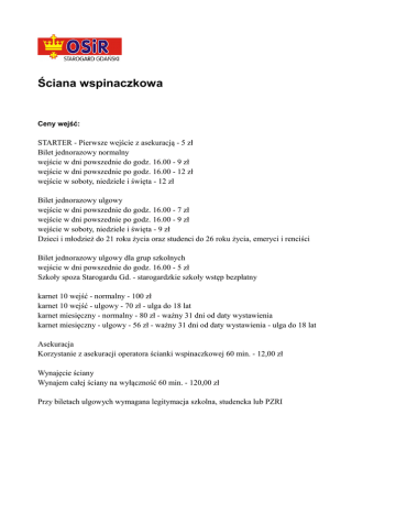 Ściana wspinaczkowa Ceny wejść: STARTER - Pierwsze wejście z asekuracją - 5 zł Bilet jednorazowy normalny wejście w dni powszednie do godz. 16.00 - 9 zł wejście w dni powszednie po godz. 16.00 - 12 zł wejście w soboty, niedziele i święta - 12 zł Bilet jednorazowy ulgowy wejście w dni powszednie do godz. 16.00 - 7 zł wejście w dni powszednie po godz. 16.00 - 9 zł wejście w soboty, niedziele i święta - 9 zł Dzieci i młodzież do 21 roku życia oraz studenci do 26 roku życia, emeryci i renciści Bilet jednorazowy ulgowy dla grup szkolnych wejście w dni powszednie do godz. 16.00 - 5 zł Szkoły spoza Starogardu Gd. - starogardzkie szkoły wstęp bezpłatny karnet 10 wejść - normalny - 100 zł karnet 10 wejść - ulgowy - 70 zł - ulga do 18 lat karnet miesięczny - normalny - 80 zł - ważny 31 dni od daty wystawienia karnet miesięczny - ulgowy - 56 zł - ważny 31 dni od daty wystawienia - ulga do 18 lat Asekuracja Korzystanie z asekuracji operatora ścianki wspinaczkowej 60 min. - 12,00 zł Wynajęcie ściany Wynajem całej ściany na wyłączność 60 min. - 120,00 zł Przy biletach ulgowych wymagana legitymacja szkolna, studencka lub PZRI