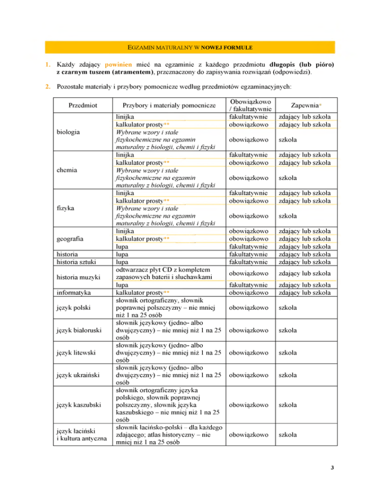 E g z a m in m a t u r a l n y w n o w e j f o r m u l e 1. Każdy zdający powinien mieć na egzaminie z każdego przedmiotu długopis (lub pióro) z czarnym tuszem (atramentem), przeznaczony do zapisywania rozwiązań (odpowiedzi). 2. Pozostałe materiały i przybory pomocnicze według przedmiotów egzaminacyjnych: Przedmiot biologia chemia fizyka geografia historia historia sztuki historia muzyki informatyka język polski język białoruski język litewski język ukraiński język kaszubski język łaciński i kultura antyczna Przybory i materiały pomocnicze linijka kalkulator prosty** Wybrane wzory i stałe fizykochemiczne na egzamin maturalny z biologii, chemii i fizyki linijka kalkulator prosty** Wybrane wzory i stałe fizykochemiczne na egzamin maturalny z biologii, chemii i fizyki linijka kalkulator prosty** Wybrane wzory i stałe fizykochemiczne na egzamin maturalny z biologii, chemii i fizyki linijka kalkulator prosty** lupa lupa lupa odtwarzacz płyt CD z kompletem zapasowych baterii i słuchawkami lupa kalkulator prosty** słownik ortograficzny, słownik poprawnej polszczyzny - nie mniej niż 1 na 25 osób słownik językowy (jedno- albo dwujęzyczny) - nie mniej niż 1 na 25 osób słownik językowy (jedno- albo dwujęzyczny) - nie mniej niż 1 na 25 osób słownik językowy (jedno- albo dwujęzyczny) - nie mniej niż 1 na 25 osób słownik ortograficzny języka polskiego, słownik poprawnej polszczyzny, słownik języka kaszubskiego - nie mniej niż 1 na 25 osób słownik łacińsko-polski - dla każdego zdającego; atlas historyczny - nie mniej niż 1 na 25 osób Obowiązkowo / fakultatywnie fakultatywnie obowiązkowo zdający lub szkoła zdający lub szkoła obowiązkowo szkoła fakultatywnie obowiązkowo zdający lub szkoła zdający lub szkoła obowiązkowo szkoła fakultatywnie obowiązkowo zdający lub szkoła zdający lub szkoła obowiązkowo szkoła obowiązkowo obowiązkowo fakultatywnie fakultatywnie fakultatywnie zdający lub zdający lub zdający lub zdający lub zdający lub obowiązkowo zdający lub szkoła fakultatywnie obowiązkowo zdający lub szkoła zdający lub szkoła obowiązkowo szkoła obowiązkowo szkoła obowiązkowo szkoła obowiązkowo szkoła obowiązkowo szkoła obowiązkowo szkoła Zapewnia* szkoła szkoła szkoła szkoła szkoła 3 matematyka wiedza o społeczeństwie linijka cyrkiel kalkulator prosty** Wybrane wzory matematyczne kalkulator prosty** obowiązkowo obowiązkowo obowiązkowo obowiązkowo zdający lub szkoła zdający lub szkoła zdający lub szkoła szkoła fakultatywnie zdający lub szkoła * Przewodniczący zespołu egzaminacyjnego (dyrektor szkoły) informuje zdających, czy dane przybory i materiały pomocnicze zapewnia szkoła, czy każdy zdający przynosi własne. ** Kalkulator prosty - jest to kalkulator, który umożliwia wykonywanie tylko dodawania, odejmowania, mnożenia, dzielenia, ewentualnie obliczanie procentów lub pierwiastków kwadratowych z liczb. 3. Z dodatkowych materiałów oraz przyborów pomocniczych mogą korzystać zdający, którym dostosowano warunki przeprowadzania egzaminu maturalnego. Zdający korzystają ze sprzętu, którego używali w procesie dydaktycznym. Uprawnieni do dostosowania osoby niesłyszące osoby słabosłyszące osoby niewidome i słabowidzące osoby słabowidzące osoby, o których mowa w art. 94a ust. 1a ustawy (cudzoziemcy) wszyscy uprawnieni do dostosowania Przybory i materiały pomocnicze słownik języka polskiego, słownik wyrazów obcych, słownik wyrazów bliskoznacznych nie mniej niż 1 na 25 osób odtwarzacz płyt CD ze słuchawkami w przypadku egzaminu z języka obcego nowożytnego (jeżeli dostosowanie takie zostało przyznane) sprzęt i oprogramowanie specjalistyczne (odpowiednie do ustalonego dla danego zdającego dostosowania warunków przeprowadzania egzaminu) przybory optyczne, z których zdający korzysta na co dzień słownik dwujęzyczny (polsko-obcojęzyczny i obcojęzyczno-polski) w wersji papierowej lub elektronicznej (z wyjątkiem egzaminu z języka polskiego, języków mniejszości i języków obcych nowożytnych) komputer lub komputer ze specjalistycznym oprogramowaniem, jeżeli takie dostosowanie zostało przyznane Obowiązkowo / fakultatywnie Zapewnia* obowiązkowo szkoła obowiązkowo zdający lub szkoła obowiązkowo szkoła fakultatywnie zdający fakultatywnie zdający lub szkoła obowiązkowo szkoła * Przewodniczący zespołu egzaminacyjnego (dyrektor szkoły) informuje zdających, czy dane przybory i materiały pomocnicze zapewnia szkoła, czy każdy zdający przynosi własne. 4. Osoby z chorobami przewlekłymi, chore lub niesprawne czasowo mogą korzystać z zaleconego przez lekarza sprzętu medycznego i leków koniecznych ze względu na chorobę. 4 E g z a m in m a t u r a l n y w s t a r e j f o r m u l e 1. Każdy zdający powinien mieć na egzaminie z każdego przedmiotu długopis (lub pióro) z czarnym tuszem (atramentem), przeznaczony do zapisywania rozwiązań (odpowiedzi). 2. Pozostałe materiały i przybory pomocnicze według przedmiotów egzaminacyjnych: Przedmiot biologia chemia fizyka i astronomia geografia historia historia sztuki historia muzyki informatyka język polski język białoruski język litewski język ukraiński język kaszubski język łaciński i kultura antyczna matematyka Przybory i materiały pomocnicze linijka linijka kalkulator prosty** Karta wybranych tablic chemicznych linijka kalkulator prosty** Karta wybranych wzorów i stałych fizycznych linijka kalkulator prosty** lupa lupa lupa odtwarzacz płyt CD z kompletem zapasowych baterii i słuchawkami lupa kalkulator prosty** słownik ortograficzny, słownik poprawnej polszczyzny - nie mniej niż 1 na 25 osób słownik językowy (jedno- albo dwujęzyczny) - nie mniej niż 1 na 25 osób słownik językowy (jedno- albo dwujęzyczny) - nie mniej niż 1 na 25 osób słownik językowy (jedno- albo dwujęzyczny) - nie mniej niż 1 na 25 osób słownik ortograficzny języka