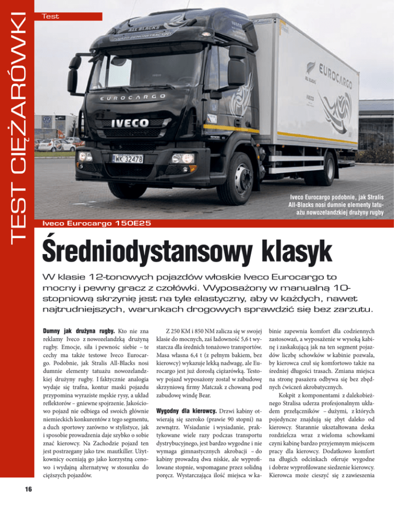 TEST CIĘŻARÓWKI Test Iveco Eurocargo podobnie, jak Stralis All-Blacks nosi dumnie elementy tatuażu nowozelandzkiej drużyny rugby Iveco Eurocargo 150E25 Średniodystansowy klasyk W klasie 12-tonowych pojazdów włoskie Iveco Eurocargo to mocny i pewny gracz z czołówki. Wyposażony w manualną 10stopniową skrzynię jest na tyle elastyczny, aby w każdych, nawet najtrudniejszych, warunkach drogowych sprawdzić się bez zarzutu. Dumny jak drużyna rugby. Kto nie zna reklamy Iveco z nowozelandzką drużyną rugby. Emocje, siła i pewnośc siebie – te cechy ma także testowe Iveco Eurocargo. Podobnie, jak Stralis All-Blacks nosi dumnie elementy tatuażu nowozelandzkiej drużyny rugby. I faktycznie analogia wydaje się trafna, kontur maski pojazdu przypomina wyraziste męskie rysy, a układ reflektorów – gniewne spojrzenie. Jakościowo pojazd nie odbiega od swoich głównie niemieckich konkurentów z tego segmentu, a duch sportowy zarówno w stylistyce, jak i sposobie prowadzenia daje szybko o sobie znać kierowcy. Na Zachodzie pojazd ten jest postrzegany jako tzw. mautkiller. Użytkownicy oceniają go jako korzystną cenowo i wydajną alternatywę w stosunku do cięższych pojazdów. 16 Z 250 KM i 850 NM zalicza się w swojej klasie do mocnych, zaś ładowność 5,6 t wystarcza dla średnich tonażowo transportów. Masa własna 6,4 t (z pełnym bakiem, bez kierowcy) wykazuje lekką nadwagę, ale Eurocargo jest już dorosłą ciężarówką. Testowy pojazd wyposażony został w zabudowę skrzyniową firmy Matczak z chowaną pod zabudowę windę Bear. Wygodny dla kierowcy. Drzwi kabiny otwierają się szeroko (prawie 90 stopni) na zewnątrz. Wsiadanie i wysiadanie, praktykowane wiele razy podczas transportu dystrybucyjnego, jest bardzo wygodne i nie wymaga gimnastycznych akrobacji – do kabiny prowadzą dwa niskie, ale wyprofilowane stopnie, wspomagane przez solidną poręcz. Wystarczająca ilość miejsca w ka- binie zapewnia komfort dla codziennych zastosowań, a wyposażenie w wysoką kabinę i zaskakującą jak na ten segment pojazdów liczbę schowków w kabinie pozwala, by kierowca czuł się komfortowo także na średniej długości trasach. Zmiana miejsca na stronę pasażera odbywa się bez zbędnych ćwiczeń akrobatycznych. Kokpit z komponentami z dalekobieżnego Stralisa uderza profesjonalnym układem przełączników – dużymi, z których pojedyncze znajdują się zbyt daleko od kierowcy. Starannie ukształtowana deska rozdzielcza wraz z wieloma schowkami czyni kabinę bardzo przyjemnym miejscem pracy dla kierowcy. Dodatkowo komfort na długich odcinkach oferuje wygodne i dobrze wyprofilowane siedzenie kierowcy. Kierowca może cieszyć się z zawieszenia pneumatycznego konstrukcji siedzenia i zintegrowanych pasów bezpieczeństwa. Punkty na plus Eurocargo zbiera za dobrą widoczność. Z masą testową zaledwie 11,9 t harmonijny sześciocylindrowy Euro 5 nie ma problemów. Z 5,9 l pojemnością i 850 Nm od 1250 obrotów Common Rail-Diesel nie jest żadnym osiłkiem, jednak wykazuje dobre zdolności obrotowe. Od 0 do 80 km/h przyspiesza w pełni załadowany w ciągu 28 sekund, w jego klasie to pierwszorzędna wartość. Bez dziury turbinowej dodaje on gazu i robi użytek ze swoich rezerw mocy, które do dyspozycji oddają 2000 obrotów. Długo nie pozostaje on głośny, chociaż do najcichszych nie należy. Około 1600 obrotów wystarczy do tempa 85 km/h na autostradzie. W trasie nie przeszkadza manualna skrzynia w układzie podwójnego H, której przełączenie z niższej na wyższą odbywa się za pomo- cą obrotowego pierścienia. Niewprawiony kierowca szybko jednak przyzwyczaja się do tego wariantu przełożenia. Ten całkiem niemały Eurocargo zakręca lekko na krętych ulicach i wąskich zakrętach, przez nierówne drogi przejeżdża przez większego wysiłku. Iveco jedzie prosto i z precyzją jest posłuszny dokładnemu układowi kierowniczemu. Podsumowanie. Wysoką dojrzałość produktu wykazuje także komfort jazdy: z długimi parabolicznymi resorami z przodu i zawieszeniem pneumatycznym z dwoma miechami powietrza z tyłu bez wysiłku pokonuje także bardzo nierówne powierzchnie, bez zataczania kabiną. Pneumatycznie sterowane hamulce tarczowe pracują dyskretnie. W przyszłości jeszcze dokładniej regulujący układ hamulcowy EBS ma dopilnować tej sprawy. Kokpit z komponentami z dalekobieżnego Stralisa uderza profesjonalnym układem przełączników Dane techniczne Iveco Eurocargo 150E25 SILNIK tector F4A E3681D*S: Diesel, 6 cylindrów, rzędowy, 4 zawory na cylinder. Wtrysk paliwa pod wysokim ciśnieniem (1600 bar) COMMON RAIL, sterowany elektronicznie. Turbodoładowanie, z zaworem upustowym oraz intercooler’em. Termiczny układ rozruchowy. Chłodzony cieczą. Zgodny z normą EURO V (w opcji EEV) – technologia SCR (selektywna redukcja katalityczna poprzez wtrysk mocznika w układzie wydechowym poza silnikiem). TYLNY MOST: Nośny z pojedynczą redukcją. Piasty montowane na łożyskach z samoregulacją. Smarowane olejem. Przełożenie tylnego mostu 4,30:1 (4,56 dla skrzyni 9-biegowej, 4,30 dla S3000), opcja: dostępne przełożenia od 6,43:1 do 3,21:1 (w zależności od skrzyni biegów i rozmiaru opon). OPONY: Przednie pojedyncze, tylne bliźniacze. Rozmiar standardowy – 285/70R19.5, jako opcja: 305/70R19,5; 11 R 22,5. Koło zapasowe z wciągarką jako standard. ZAWIESZENIE: mechaniczne – resory piórowe paraboliczne, wzmacniane dla tylnego mostu. Drążek stabilizatora i teleskopowe amortyzatory hydrauliczne. Jako opcja dostępne resory półeliptyczne przednie i tylne. UKŁAD HAMULCOWY: hamulec zasadniczy i awaryjny – system pneumatyczny z dwoma niezależnymi obwodami – ABS jako standard. Hamulce wentylowane tarczowe dla osi przedniej i tylnej z pływającymi zaciskami. Wyposażenie standardowe: pneumatyczny fotel kierowcy, regulowany w trzech płaszczyznach, pokryty tkaniną, z pasami bezpieczeństwa i zagłówkiem. Elektrycznie podgrzew