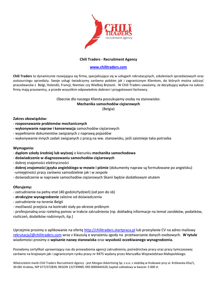 Chili Traders - Recruitment Agency www.chilitraders.com Chili Traders to dynamicznie rozwijająca się firma, specjalizująca się w usługach rekrutacyjnych, szkoleniach sprzedażowych oraz outsourcingu sprzedaży. Swoje usługi świadczymy zarówno polskim jak i zagranicznym Klientom, do których można zaliczyć pracodawców z Belgi, Holandii, Francji, Niemiec czy Wielkiej Brytanii. W Chili Traders uważamy, że decydujący wpływ na sukces firmy mają pracownicy, a przede wszystkim odpowiednio dobrani i przygotowani fachowcy. Obecnie dla naszego Klienta poszukujemy osoby na stanowisko: Mechanika samochodów ciężarowych (Belgia) Zakres obowiązków: - rozpoznawanie problemów mechanicznych - wykonywanie napraw i konserwacja samochodów ciężarowych - wypełnianie dokumentów związanych z naprawą pojazdów - wykonywanie innych zadań związanych z pracą na ww. stanowisku, jeśli zaistnieje taka potrzeba Wymagania: - dyplom szkoły średniej lub wyższej o kierunku mechanika samochodowa - doświadczenie w diagnozowaniu samochodów ciężarowych - dobrej znajomości elektryczności - dobrej znajomości języka angielskiego w mowie i piśmie (dokumenty napraw są formułowane po angielsku) -umiejętności pracy zarówno samodzielnie jak i w zespole - doświadczenie w naprawie samochodów ciężarowych Skanii będzie dodatkowym atutem Oferujemy: - zatrudnienie na pełny etat (40 godzin/tydzień) (od pon do sb) - atrakcyjne wynagrodzenie zależne od doświadczenia - zatrudnienie na terenie Belgii - możliwość przejścia na kontrakt stały po okresie próbnym - profesjonalną oraz rzetelną pomoc w trakcie zatrudnienia (np. dokładną informacje na temat zarobków, podatków, rozliczeń, dodatków rodzinnych, itp.) Uprzejmie prosimy o aplikowanie na ofertę http://chilitraders.startpraca.pl lub przesyłanie CV na adres mailowy [email protected] wraz z klauzulą o wyrażeniu zgody na przetwarzanie danych osobowych. W tytule wiadomości prosimy o wpisanie nazwy stanowiska oraz wysokość oczekiwanego wynagrodzenia. Posiadamy certyfikat uprawniający nas do prowadzenia agencji zatrudnienia, pośrednictwa pracy oraz pracy tymczasowej zarówno na krajowym jak i zagranicznym rynku pracy nr 9475 wydany przez Marszałka Województwa Małopolskiego. Właścicielem marki Chili Traders Recruitment Agency - jest Morgan Advertising Sp. z o.o. z siedzibą w Krakowie przy ul. Królewska 65a/1, 30-081 Kraków, NIP 6772372839, REGON 122739989, KRS 0000444320; kapitał zakładowy w kwocie: 5 000 zł.