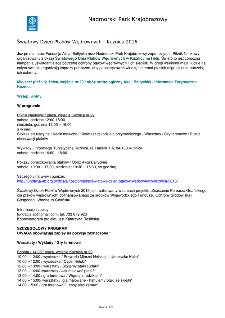 Nadmorski Park Krajobrazowy Światowy Dzień Ptaków Wędrownych – Kuźnica 2016 Już po raz trzeci Fundacja Akcja Bałtycka oraz Nadmorski Park Krajobrazowy zapraszają na Piknik Naukowy organizowany z okazji Światowego Dnia Ptaków Wędrownych w Kuźnicy na Helu. Święto to jest coroczną kampanią uświadamiającą potrzebę ochrony ptaków wędrownych i ich siedlisk. W drugi weekend maja, ludzie na całym świecie organizują imprezy publiczne, aby popularyzować wiedzę na temat ptasich migracji oraz potrzebę ich ochrony. Miejsce: plaża Kuźnica, wejście nr 29 / obóz ornitologiczny Akcji Bałtyckiej / Informacja Turystyczna Kuźnica Wstęp: wolny W programie: Piknik Naukowy / plaża, wejście Kuźnica nr 29 sobota, godzina 12:00-18:00 niedziela, godzina 12:00 – 16:00 a w nim: Stoiska edukacyjne / Kącik malucha / Kiermasz rękodzieła przyrodniczego / Warsztaty / Gry terenowe / Punkt obserwacji ptaków Wykłady / Informacja Turystyczna Kuźnica, ul. Hallera 1 A, 84-130 Kuźnica sobota, godzina 16:00 - 18:00 Pokazy obrączkowania ptaków / Obóz Akcji Bałtyckiej sobota: 10:30 – 17:30, niedziela: 10:30 – 15:30, co godzinę. Szczegóły na www i poniżej: http://fundacja-ab.org.pl/dzialalnosc/projekty/swiatowy-dzien-ptakow-wedrownych-kuznica-2016/ Światowy Dzień Ptaków Wędrownych 2016 jest realizowany w ramach projektu „Znaczenie Pomorza Gdańskiego dla ptaków wędrownych” dofinansowanego ze środków Wojewódzkiego Funduszu Ochrony Środowiska i Gospodarki Wodnej w Gdańsku Informacje i zapisy: [email protected], tel. 733 872 920 Koordynatorem projektu jest Katarzyna Rosińska. SZCZEGÓŁOWY PROGRAM UWAGA obowiązują zapisy na pozycje zaznaczone * Warsztaty / Wykłady / Gry terenowe Sobota / 14.05 / plaża, wejście Kuźnica nr 29 10:00 – 12:00 / wycieczka / Przyroda Mierzei Helskiej – Uroczysko Każa* 10:00 – 12:00 / wycieczka / Cypel Helski* 12:00 – 13:00 / warsztaty / Szyjemy ptaki cudaki* 13:00 – 14:00 /warsztaty / Jak malować ptaki?* 13:00 – 14:00 / gra terenowa / Wędruj z rudzikiem* 14:00 – 15:00/ warsztaty / Igłą malowane - haftujemy ptaki ze sklejki* 14:00 -15:00 / gra terenowa / Leśny plac zabaw* strona 1/2 15:00 - 16:00 / warsztaty / Obserwacje astronomiczne - pokaz Słońca* 15:00 – 16:00 / warsztaty / Igłą malowane - haftujemy ptaki ze sklejki* 16:00 -17:00/ warsztaty / Budki lęgowe* 17:00 – 18:00 / warsztaty/ Co kryją sowie wypluwki?* 22:00 - 23:00 /warsztaty/ Obserwacje astronomiczne* Sobota / 14.05 / Informacja Turystyczna Kuźnica 16:00 – 16:30 / prelekcja / Historia obrączkowania ptaków na Półwyspie Helskim 16:40 - 16:50 / film / Przyroda Nadmorskiego Parku Krajobrazowego 17:00 – 18:00 / slajdowisko / Jakie ptaki lecą nad naszymi głowami? Niedziela / 15.05 / plaża, wejście Kuźnica nr 29 10:00 – 12:00 / wycieczka / Co w lesie piszczy? – Kuźnica* 10:00 – 12:00 / wycieczka / Port w Jastarni i Torfowe Kłyle* 12:00 – 13:00 / warsztaty / Oznaczanie piór* 12:00 - 13:00 / warsztaty / Krwawe łowy sowy* 13:00 – 14:00 / warsztaty/ Szyjemy ptaki cudaki 13:00 – 14:00 / gra terenowa / Leśny plac zabaw* 14:00 -15:00 / gra terenowa / Wędruj z rudzikiem * 14:00 – 15:00 / warsztaty / Jak malować ptaki?* 15:00 -16:00/ warsztaty / Budki lęgowe* strona 2/2 Powered by TCPDF (www.tcpdf.org)