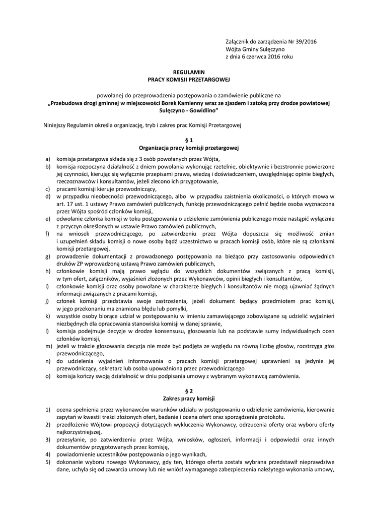 Załącznik do zarządzenia Nr 39/2016 Wójta Gminy Sulęczyno z dnia 6 czerwca 2016 roku REGULAMIN PRACY KOMISJI PRZETARGOWEJ powołanej do przeprowadzenia postępowania o zamówienie publiczne na „Przebudowa drogi gminnej w miejscowości Borek Kamienny wraz ze zjazdem i zatoką przy drodze powiatowej Sulęczyno - Gowidlino” Niniejszy Regulamin określa organizację, tryb i zakres prac Komisji Przetargowej §1 Organizacja pracy komisji przetargowej a) komisja przetargowa składa się z 3 osób powołanych przez Wójta, b) komisja rozpoczyna działalność z dniem powołania wykonując rzetelnie, obiektywnie i bezstronnie powierzone jej czynności, kierując się wyłącznie przepisami prawa, wiedzą i doświadczeniem, uwzględniając opinie biegłych, rzeczoznawców i konsultantów, jeżeli zlecono ich przygotowanie, c) pracami komisji kieruje przewodniczący, d) w przypadku nieobecności przewodniczącego, albo w przypadku zaistnienia okoliczności, o których mowa w art. 17 ust. 1 ustawy Prawo zamówień publicznych, funkcję przewodniczącego pełnić będzie osoba wyznaczona przez Wójta spośród członków komisji, e) odwołanie członka komisji w toku postępowania o udzielenie zamówienia publicznego może nastąpić wyłącznie z przyczyn określonych w ustawie Prawo zamówień publicznych, f) na wniosek przewodniczącego, po zatwierdzeniu przez Wójta dopuszcza się możliwość zmian i uzupełnień składu komisji o nowe osoby bądź uczestnictwo w pracach komisji osób, które nie są członkami komisji przetargowej, g) prowadzenie dokumentacji z prowadzonego postępowania na bieżąco przy zastosowaniu odpowiednich druków ZP wprowadzoną ustawą Prawo zamówień publicznych, h) członkowie komisji mają prawo wglądu do wszystkich dokumentów związanych z pracą komisji, w tym ofert, załączników, wyjaśnień złożonych przez Wykonawców, opinii biegłych i konsultantów, i) członkowie komisji oraz osoby powołane w charakterze biegłych i konsultantów nie mogą ujawniać żądnych informacji związanych z pracami komisji, j) członek komisji przedstawia swoje zastrzeżenia, jeżeli dokument będący przedmiotem prac komisji, w jego przekonaniu ma znamiona błędu lub pomyłki, k) wszystkie osoby biorące udział w postępowaniu w imieniu zamawiającego zobowiązane są udzielić wyjaśnień niezbędnych dla opracowania stanowiska komisji w danej sprawie, l) komisja podejmuje decyzje w drodze konsensusu, głosowania lub na podstawie sumy indywidualnych ocen członków komisji, m) jeżeli w trakcie głosowania decyzja nie może być podjęta ze względu na równą liczbę głosów, rozstrzyga głos przewodniczącego, n) do udzielenia wyjaśnień informowania o pracach komisji przetargowej uprawnieni są jedynie jej przewodniczący, sekretarz lub osoba upoważniona przez przewodniczącego o) komisja kończy swoją działalność w dniu podpisania umowy z wybranym wykonawcą zamówienia. §2 Zakres pracy komisji 1) ocena spełnienia przez wykonawców warunków udziału w postępowaniu o udzielenie zamówienia, kierowanie zapytań w kwestii treści złożonych ofert, badanie i ocena ofert oraz sporządzenie protokołu. 2) przedłożenie Wójtowi propozycji dotyczących wykluczenia Wykonawcy, odrzucenia oferty oraz wyboru oferty najkorzystniejszej, 3) przesyłanie, po zatwierdzeniu przez Wójta, wniosków, ogłoszeń, informacji i odpowiedzi oraz innych dokumentów przygotowanych przez komisję, 4) powiadomienie uczestników postępowania o jego wynikach, 5) dokonanie wyboru nowego Wykonawcy, gdy ten, którego oferta została wybrana przedstawił nieprawdziwe dane, uchyla się od zawarcia umowy lub nie wniósł wymaganego zabezpieczenia należytego wykonania umowy, 6) w przypadku zaistnienia okoliczności o unieważnienie postępowania komisja występuje z wnioskiem do Wójta zawierającym pisemne uzasadnienie z wskazaniem na podstawy prawne oraz faktyczne okoliczności, które spowodowały konieczność unieważnienia postępowania. §3 Zadania przewodniczącego komisji 1) ustalenie uprawnień i kompetencji do działania komisji, szczególnie w zakresie: podpisywania korespondencji i wniosków związanych z prowadzonym postępowaniem, a będących w zakresie prac komisji, 2) przewodniczenie obradom, 3) wyznaczenie sekretarza komisji spośród członków biorących udział w pierwszym posiedzeniu, 4) wyznaczenie terminów i miejsca posiedzeń komisji oraz ich prowadzenie, 5) udzielenie wymaganych ustawowo informacji na sesji otwarcia tj.: - podanie kwoty jaką zamawiający zamierza przeznaczyć na sfinansowanie zamówienia, - podanie nazwy (firmy), adresu wykonawców, a także ceny oferty, terminu wykonania zamówienia, okresu gwarancji i warunków płatności zawartych w ofercie. 6) odebranie oświadczeń od członków komisji oraz osób powołanych w charakterze biegłych i konsultantów o zaistnieniu lub braku istnienia ustawowych okoliczności uniemożliwiających im wykonywanie czynności związanych z postępowaniem o zamówienie publiczne, 7) podział pomiędzy członków komisji prac podejmowanych w trybie roboczym, 8) w razie wystąpienia wątpliwości merytorycznych związanych z oceną badanych ofert występuje z wnioskiem do Wójta o zasilenie składu Komisji o właściwych dla przedmiotu zamówienia/ sprawy specjalistów, rzeczoznawców lub konsultantów, 9) przewodniczący wnioskuje do Wójta o odwołanie członka komisji w przypadku: - wyłączenia się członka komisji z jej prac wskutek zaistnienia okoliczności, o których mowa w art. 17 ust. 1 Prawo zamówień publicznych, - nieusprawiedliwionej nieobecności na dwóch kolejnych posiedzeniach komisji, - naruszenia przez członka obowiązków, - zaistnienia innej przeszkody uniemożliwiającej jego udział w pracach komisji, - wygaśnięcia stosunku o pracę pomiędzy pracownikiem, a Urzędem Gminy Sulęczyno. 10) Występowanie do Wójta o dokonanie zmian i uzupełnień składu komisji o nowe osoby, 