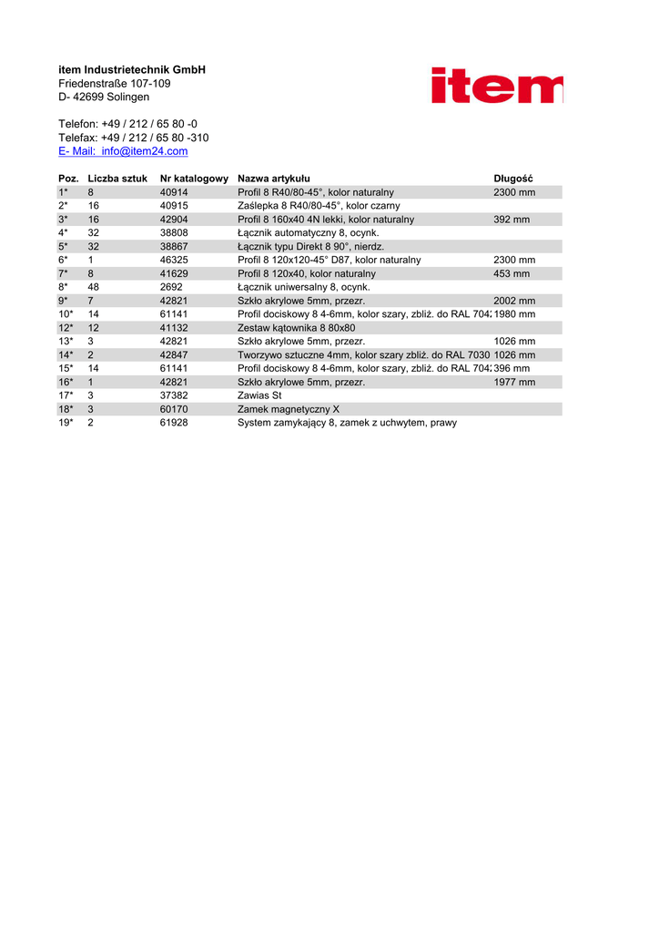 item Industrietechnik GmbH Friedenstraße 107-109 D- 42699 Solingen Telefon: +49 / 212 / 65 80 -0 Telefax: +49 / 212 / 65 80 -310 E- Mail: [email protected] Poz. 1* 2* 3* 4* 5* 6* 7* 8* 9* 10* 12* 13* 14* 15* 16* 17* 18* 19* Liczba sztuk 8 16 16 32 32 1 8 48 7 14 12 3 2 14 1 3 3 2 Nr katalogowy 40914 40915 42904 38808 38867 46325 41629 2692 42821 61141 41132 42821 42847 61141 42821 37382 60170 61928 Nazwa artykułu Długość Profil 8 R40/80-45°, kolor naturalny 2300 mm Zaślepka 8 R40/80-45°, kolor czarny Profil 8 160x40 4N lekki, kolor naturalny 392 mm Łącznik automatyczny 8, ocynk. Łącznik typu Direkt 8 90°, nierdz. Profil 8 120x120-45° D87, kolor naturalny 2300 mm Profil 8 120x40, kolor naturalny 453 mm Łącznik uniwersalny 8, ocynk. Szkło akrylowe 5mm, przezr. 2002 mm Profil dociskowy 8 4-6mm, kolor szary, zbliż. do RAL 70421980 mm Zestaw kątownika 8 80x80 Szkło akrylowe 5mm, przezr. 1026 mm Tworzywo sztuczne 4mm, kolor szary zbliż. do RAL 7030 1026 mm Profil dociskowy 8 4-6mm, kolor szary, zbliż. do RAL 7042396 mm Szkło akrylowe 5mm, przezr. 1977 mm Zawias St Zamek magnetyczny X System zamykający 8, zamek z uchwytem, prawy Szerokość 418 mm 1026 mm 1026 mm 381 mm