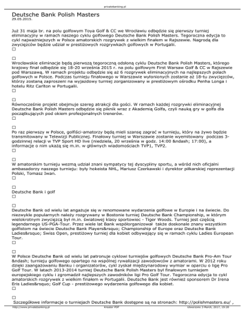 privatebanking.pl Deutsche Bank Polish Masters 29.05.2015. Już 31 maja br. na polu golfowym Toya Golf & CC we Wrocławiu odbędzie się pierwszy turniej eliminacyjny w ramach naszego cyklu golfowego Deutsche Bank Polish Masters. Tegoroczna edycja to cykl najważniejszych w Polsce amatorskich rozgrywek z wielkim finałem w Rajszewie. Nagrodą dla zwycięzców będzie udział w prestiżowych rozgrywkach golfowych w Portugalii. Wrocławskie eliminacje będą pierwszą tegoroczną odsłoną cyklu Deutsche Bank Polish Masters, którego krajowy finał odbędzie się 18-20 września 2015 r. na polu golfowym First Warsaw Golf & CC w Rajszewie pod Warszawą. W ramach projektu odbędzie się aż 6 rozgrywek eliminacyjnych na najlepszych polach golfowych w Polsce. Podczas turnieju finałowego w Warszawie wyłonionych zostanie aż 18-tu zwycięzców, którzy zostaną zaproszeni na wyjazdowy turniej zorganizowany w prestiżowym ośrodku Penha Longa i hotelu Ritz Carlton w Portugalii. Równocześnie projekt obejmuje szereg atrakcji dla gości. W ramach każdej rozgrywki eliminacyjnej Deutsche Bank Polish Masters odbędzie się piknik wraz z Akademią Golfa, czyli nauką gry w golfa dla początkujących pod okiem profesjonalnych trenerów. Po raz pierwszy w Polsce, golfiści-amatorzy będą mieli szansę zagrać w turnieju, który na żywo będzie transmitowany w Telewizji Publicznej. Finałowy turniej w Warszawie zostanie wyemitowany podczas 3godzinnej relacji w TVP Sport HD live (niedziela, 20 września w godz. 14:00 – 17:00), a informacje o nim ukażą się m.in. w głównych wiadomościach TVP1, TVP2. W amatorskim turnieju wezmą udział znani sympatycy tej dyscypliny sportu, a wśród nich oficjalni ambasadorzy naszego turnieju: były hokeista NHL, Mariusz Czerkawski i dyrektor piłkarskiej reprezentacji Polski, Tomasz Iwan. Deutsche Bank i golf Deutsche Bank od wielu lat angażuje się w renomowane wydarzenia golfowe w Europie i na świecie. Do niezwykle popularnych należy rozgrywany w Bostonie turniej Deutsche Bank Championship, w którym wielokrotnym zwycięzcą był m.in. światowej klasy sportowiec - Tiger Woods. Turniej jest częścią legendarnego US-PGA-Tour. Przez wiele lat Bank współorganizował także doskonale znany wszystkim golfistom na świecie Deutsche Bank Players’ Championship of Europe oraz Deutsche Bank Ladies’ Swiss Open, prestiżowy turniej dla kobiet odbywający się w ramach cyklu Ladies European Tour. W Polsce Deutsche Bank od wielu lat patronuje cyklowi turniejów golfowych Deutsche Bank Pro-Am Tour – turnieju golfowego opartego na wspólnej rywalizacji zawodowców z amatorami. W 2012 roku dzięki zaangażowaniu Banku i organizatorów, cykl zyskał międzynarodowy wymiar w oparciu o ligę Pro Golf Tour. W latach 2013-2014 turniej Deutsche Bank Polish Masters był finałowym turniejem europejskiego cyklu i zgromadził najlepszych zawodników ligi Pro Golf Tour. Tegoroczna edycja to cykl amatorskich rozgrywek z wielkim finałem w Portugalii. Deutsche Bank jest również sponsorem Dr Irena Eris Ladies’ Golf Cup - prestiżowego wydarzenia golfowego dla kobiet. Szczegółowe informacje o turniejach Deutsche Bank dostępne są na stronach: http://polishmasters.eu/ , http://www.privatebanking.pl Kreator PDF Utworzono 3 March, 2017, 19:28 privatebanking.pl www.deutschebankchampionship.com . źródło: Rzecznik Prasowy Grupy Deutsche Bank w Polsce http://www.privatebanking.pl Kreator PDF Utworzono 3 March, 2017, 19:28