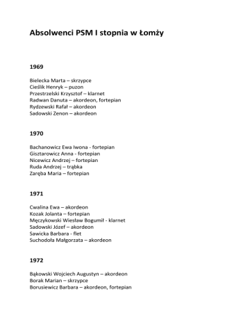 Absolwenci PSM I stopnia w Łomży 1969 Bielecka Marta – skrzypce Cieślik Henryk – puzon Przestrzelski Krzysztof – klarnet Radwan Danuta – akordeon, fortepian Rydzewski Rafał – akordeon Sadowski Zenon – akordeon 1970 Bachanowicz Ewa Iwona - fortepian Gisztarowicz Anna - fortepian Nicewicz Andrzej – fortepian Ruda Andrzej – trąbka Zaręba Maria – fortepian 1971 Cwalina Ewa – akordeon Kozak Jolanta – fortepian Męczykowski Wiesław Bogumił - klarnet Sadowski Józef – akordeon Sawicka Barbara - flet Suchodoła Małgorzata – akordeon 1972 Bąkowski Wojciech Augustyn – akordeon Borak Marian – skrzypce Borusiewicz Barbara – akordeon, fortepian Fogtman Michał - skrzypce Kukiełka Bogumiła – wiolonczela, fortepian Michalska Sławomira – fortepian Nicewicz Krzysztof – fortepian Rusiłowicz Danuta – skrzypce Sędziak Ewa – fortepian Sobieski Jan – puzon Suchodoła Jan – akordeon Sztykiel Ireneusz – akordeon Wiszniewska Ewa Anna - fortepian 1973 Andrychowski Marek – gitara Cwalina Adam – akordeon Domurat Zofia – akordeon Fabiański Andrzej – fortepian Godlewska Małgorzata – fortepian Kuczyński Lech – gitara Malanowska Elżbieta – fortepian Najda Sławomira – fortepian Siekierska Irena – flet Suchnicki Tadeusz – klarnet Święcki Seweryn – klarnet Wawrzyniak Elżbieta – akordeon Zwoleńska Joanna – fortepian 1974 Gałęcka Ewa – fortepian Godlewska Maria – fortepian Grabska Barbara - fortepian Jabłońska Ewa – fortepian Kończyk Maciej – fortepian Kumińska Dorota – fortepian, flet Mikulska Ewa – gitara Najda Henryk – skrzypce Najda Sławomira – akordeon Ostrowski Ryszard – saksofon Perkowska Joanna – fortepian Piotrowska Iwona – fortepian Podolak Ewa – fortepian 1975 Bohdan Ewa – fortepian Borusiewicz Elżbieta – fortepian Fall Krystyna – fortepian Grabska Barbara – wiolonczela Krajewska Jolanta – gitara Kumińska Beata – fortepian Michalska Hanna – fortepian Nowacka Gabriela – gitara Pełny Waldemar – fortepian Popiołek Małgorzata – fortepian Ścibek Grażyna – fortepian Urbanowska Wanda – fortepian Zalewski Waldemar – puzon, kontrabas Zienkiewicz Stanisław – klarnet 1976 Antoniuk Małgorzata – fortepian Dubaniewicz Małgorzata – gitara Dudzińska Ewa – skrzypce Kalicka – Zofia – gitara Krajewska Bogumiła – fortepian Kumiński Robert – gitara Małachwiej Danuta – skrzypce Mioduszewska Katarzyna – fortepian Modzelewska Elżbieta – fortepian Roszkowski Andrzej – skrzypce Sarnowska Ewa – fortepian Topczewska Alicja – skrzypce Wiśniewski Jerzy – gitara Zygmunt Iwona – fortepian 1977 Baranowicz Małgorzata – fortepian Bohdan Wojciech – akordeon Chomicz Ewa – fortepian Chorosiński Bogdan – trąbka Jankowska Ewa – gitara Krupa Jacek – flet Malinowska Mariola – skrzypce Moczydłowska Marta – fortepian Myszka Urszula – skrzypce Nalewajko Grażyna – gitara Narolewska Barbara – fortepian Nowicka Ewa – gitara Rowińska Marzena Maria – akordeon Rowiński Piotr – skrzypce Sadowski Bogdan – gitara Sęk Jerzy Edward – akordeon Suchodoła Andrzej – skrzypce 1978 Boguska Jolanta – fortepian Chrzanowski Dariusz – akordeon Dąbrowska Ewa Julita – fortepian Gołębiewska Ewa – skrzypce Hutnik Paweł – skrzypce Iwaniuk Marzena – skrzypce Jaśkowiec Jacek – fortepian Karpiuk Wioletta – fortepian Serdyński Mirosław – fortepian Witkowski Janusz – trąbka Witkowski Krzysztof – klarnet Zembrowska Beata – fortepian 1979 Bałdyga Ewa – fortepian Borowska Grażyna – fortepian Bylica Barbara – skrzypce Brzózko Sylwia – fortepian Graba Anna – fortepian Grygo Agata – skrzypce Krzysztof Najda – skrzypce Pogroszewska Jolanta – fortepian Krzysztof Rudnicki – fortepian Wojciech Rudnicki – skrzypce Serdyński Arkadiusz – fortepian Sidor Wojciech – Fortepian Załęska Beata – fortepian Załęska Małgorzata – fortepian Zielińska Małgorzata – fortepian 1980 Brulińska Zofia – gitara Ciborowska Anna – fortepian Cieślik Agata – fortepian Grądzki Robert – skrzypce Gromadzka Grażyna – fortepian Karasińska Elżbieta – flet Karpiuk Katarzyna – skrzypce Korytkowska Joanna – skrzypce Krajewski Piotr – akordeon Krawczyk Marzena – fortepian Mocarska Anna – fortepian Ostaszewska Marzena – skrzypce Podlaska Jolanta – skrzypce Sroczyńska Aneta – fortepian Suchodoła Piotr – fortepian Tchórzewski Bogdan – puzon Waśko Jolanta – flet Zając Zbigniew – gitara, fortepian Zdanowicz Sławomir – gitara 1981 Aliński Jacek – klarnet Borawska Cecylia – gitara Borawski Zenon – trąbka Bronowicz Anna – fortepian Ciborowska Agnieszka – fortepian Dudzińska Małgorzata – wiolonczela Górtatowska Małgorzata – skrzypce Łoniewska Ewa – fortepian Sasinowska Małgorzata – fortepian Sidor Agnieszka – fortepian Tchórzewski Bogusław – puzon Zieliński Andrzej – akordeon 1982 Chomicz Urszula – fortepian Lenard Joanna – fortepian Orłowska Izabela – fortepian Tomaszewicz Andrzej – skrzypce Walejewski Roman – trąbka Waśko Marta – akordeon 1983 Chojecka Agnieszka – wiolonczela Bogusławska Jolanta - skrzypce Dąbrowska Izabela – akordeon Górtatowska Agnieszka – skrzypce Jakubowski Dariusz – akordeon Krasowska Anna – fortepian Laskowska Elżbieta – skrzypce Lipińska Marta – fortepian Obrycki Mariusz – akordeon Siwek Agata – fortepian Skawski Ireneusz – akordeon Syczewska Agnieszka – fortepian Zdanowicz Mirosław – akordeon 1984 Borawska Cecylia – gitara Borowska Anna – fortepian Ciborowska Anna – fortepian Ciborowska Iwona – wiolonczela Długozima Sławomir – gitara Gąsiewski Michał – trąbka Graba Katarzyna – skrzypce Grzeszczyk Marek – trąbka Iwaniuk Katarzyna – fortepian Jaźwińska Małgorzata – skrzypce Karwowska Alicja – fortepian Kierejsza Bogdan – skrzypce Korytkowska Mar