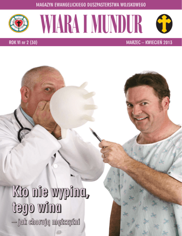 MAGAZYN EWANGELICKIEGO DUSZPASTERSTWA WOJSKOWEGO Rok VI nr 2 (30) marzec-kwiecień 2013 ROK VI nr 2 (30) MARZEC – KWIECIEŃ 2013 Kto nie wypina, tego wina – jak chorują mężczyźni 1 2. Życie liturgiczne Kościoła 3. Słowo od redakcji ŻYCIE LITURGICZNE KOŚCIOŁA Marzec – ks. Marcin Orawski Nasi kapelani – ks. mjr Tomasz Wigłasz Hasło miesiąca: „On nie jest Bogiem umarłych, ale żywych. Dla niego bowiem wszyscy żyją.” (Łk 20,38) 3 marca: 3. Niedziela Pasyjna – Oculi („Oczy moje patrzą na Pana.” Ps 25,15). 10 marca: 4. Niedziela Pasyjna – Laetare („Radujcie się z Jeruzalemem.” Iz 66,10). 17 marca: 5. Niedziela Pasyjna – Judica („Bądź sędzią moim, Boże.” Ps 43,1). 24 marca: 6. Niedziela Pasyjna – Niedziela Palmowa. Rozpoczyna Wielki Tydzień. Przypomina triumfalny wjazd Jezusa do Jerozolimy. 25 marca: Dzień Zwiastowania Marii Pannie – upamiętnia objawienie się Marii archanioła Gabriela, który zapowiedział przyjście na świat Jezusa Chrystusa. 28 marca: Wielki Czwartek – pamiątka Ostatniej Wieczerzy Jezusa z uczniami. Dzień ustanowienia Komunii Świętej (Sakramentu Ołtarza). 29 marca: Wielki Piątek – pamiątka śmierci Jezusa Chrystusa na krzyżu. Dla ewangelików najważniejsze święto w roku liturgicznym. Nabożeństwa mają charakter żałobny. Dzwony kościelne milczą, Krzyż Pański spowija czarny woal, a w niektórych kościołach nie grają organy. 30 marca: Wielka Sobota. Dzień wyciszenia. Przypomina zstąpienie Jezusa do krainy umarłych i zwiastowanie tam Ewangelii. 31 marca 1. Święto Zmartwychwstania Pańskiego – Wielkanoc. Dzień zmartwychwstania Chrystusa i zwycięstwa życia nad śmiercią. Tego dnia od rana (tzw. jutrzni) znów rozbrzmiewają kościelne dzwony. Kwiecień 5 5. 8. 10. 8 Relacje z pracy kapelanów ewangelickich i działalności EDW Kto nie wypina tego wina. Rozmowa o profilaktyce nowotworowej – Anna Hopfer-Wola Wydarzenia z Kościoła Ewangelicko-Augsburskiego w RP – ks. Adam Malina Żołnierz na misji Pod niebieską flagą UE – mł. chor. w st. spocz. Andrzej Korus 13. Żołnierski punkt widzenia „Powrócić do życia”, rozmowa z mjr. Leszkiem Stępniem – mł. chor. w st. spocz. Andrzej Korus 14. 15. 13 Rozważanie Słowa Bożego – ks. ppor. rez. Dawid Banach 12. Hasło miesiąca: „Jak więc przyjęliście Chrystusa Jezusa, tak w nim chodźcie (…), składając nieustannie dziękczynienie.” (Kol 2,6-7) 1 kwietnia: 2. Święto Zmartwychwstania Pańskiego – Poniedziałek Wielkanocny. 7 kwietnia: 1. Niedziela po Wielkanocy – Quasimodogeniti („Jak nowo narodzone niemowlęta.” 1 P 2,2). Kolejne niedziele po Wielkanocy wyrażają radość chrześcijan ze zmartwychwstania Chrystusa i reflektują konsekwencje płynące z tego wydarzenia. Niedziele posiadają łacińskie nazwy ukazujące wiodący motyw teologiczny. Pierwsza po Wielkanocy podkreśla znaczenie nowonarodzenia. 14 kwietnia: 2. Niedziela po Wielkanocy – Misericordias Domini („Pełna jest ziemia łaski Pana.” Ps 33,5). Niedziela poświęcona miłosierdziu Bożemu. 21 kwietnia: 3. Niedziela po Wielkanocy – Jubilate („Radośnie wysławiajcie Boga.” Ps 66,1). Niedziela wyraża radość ze zmartwychwstania Jezusa Chrystusa, który pokonał śmierć. 25 kwietnia: Dzień Ewangelisty Marka – apostoła, towarzysza misyjnych wędrówek św. Pawła. Według tradycji był on autorem najstarszej Ewangelii – św. Marka. Zginął śmiercią męczeńską ok. 70 roku. 28 kwietnia: 4. Niedziela po Wielkanocy – Cantate („Śpiewajcie Panu pieśń nową.” Ps 98,1). Tego dnia w Kościele ewangelickim odbywają się zjazdy chórów oraz obchody dni pieśni ewangelickiej. 4. Jedynie Słowo Dorosły chrześcijanin – Piotr Lorek Okiem Cywila Formacje militarne Watykanu – Rafał Ćwikowski Kryzys wieku średniego – Marek Hause 16. Psycholog Działalność psychologiczna w misji poza granicami państwa – mjr Anna Glibowska Dorosłe bycie pomiędzy – Alina Knapik 18. Falerystyka Medal PRO MEMORIA – mł. chor. w st. spocz. Andrzej Korus Konflikty na świecie W sercu Afryki – Karina Hübsch 19. 8 TEMAT NUMERU Kto nie wypina, tego wina – jak chorują mężczyźni Redaktor naczelny: ks. Marcin Orawski Zastępca redaktora naczelnego: mł. chor. w st. spocz. Andrzej Korus Kolegium redakcyjne i stali współpracownicy: Grzegorz Mieczkowski, Anna Hopfer-Wola, Piotr Lorek, Karina Hübsch, Rafał Ćwikowski, ks. Adam Malina, Marek Hause, mjr Anna Glibowska, Czesław Dutkowski, Alina Knapik, ks. Andrzej Komraus. Na okładce: © PhotoXpress.com Adres redakcji: 00-909 Warszawa, ul. Nowowiejska 26, tel.: 22 684 09 60, faks: 22 684 09 40, e-mail: [email protected] Redakcja nie zwraca tekstów niezamówionych oraz zastrzega sobie prawo do ich redagowania, zmiany śródtytułów i tytułów oraz skracania tekstów. Skład, łamanie, opracowanie graficzne, druk oraz kolportaż: Drukarnia „TONO Bis”, Laski, ul. Brzozowa 75, 05-080 Izabelin. ISSN1898-598X więcej na stronie: www.edw.wp.mil.pl Fot. PhotoXpress Daty Historyczne – ks. Andrzej Komraus Polecamy – Marek Hause Rok VI nr 2 (30) marzec-kwiecień 2013 Słowo od redakcji ks. Marcin Orawski Badania lekarskie? Znowu? Przecież nic mnie nie boli. Ilu z nas, szczególnie panów, dostaje białej gorączki na samą myśl o skierowaniu na obowiązkowe badania z zakresu medycyny pracy. I nie chodzi o to, że wizytę u lekarza uważamy za niepotrzebną. Nie sądzę też, że już teraz podzielamy eschatologiczny entuzjazm apostoła Pawła wyrażony w zdaniu: – Albowiem (…) pragnę rozstać się z życiem i być z Chrystusem, bo to daleko lepiej. (Flp 1,23) Powody bywają bardziej prozaiczne. Mężczyźni lubią „kozaczyć”. – Złego diabli nie biorą. Od czasu do czasu zdarza się tylko stoczyć heroiczną walkę o życie, gdy gorączka przekroczy 37°C i „łeb mi zaraz pęknie”. Pomijając takie drobiazgi, niejeden z nas, panowie, wolałby spotka