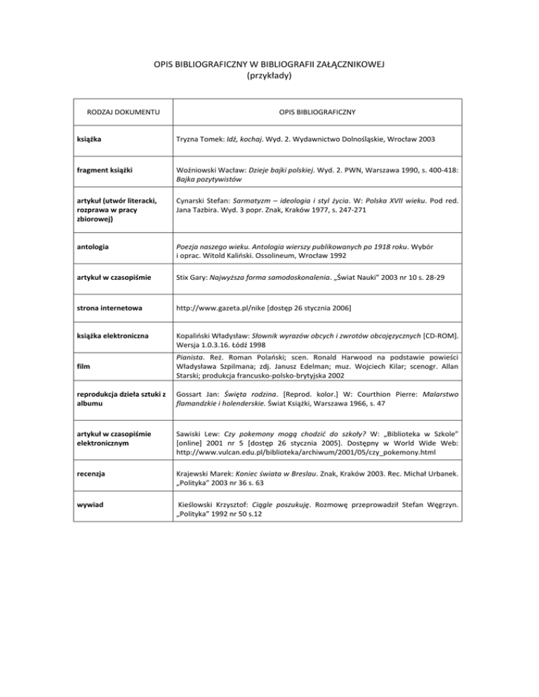 OPIS BIBLIOGRAFICZNY W BIBLIOGRAFII ZAŁĄCZNIKOWEJ (przykłady) RODZAJ DOKUMENTU OPIS BIBLIOGRAFICZNY książka Tryzna Tomek: Idź, kochaj. Wyd. 2. Wydawnictwo Dolnośląskie, Wrocław 2003 fragment książki Woźniowski Wacław: Dzieje bajki polskiej. Wyd. 2. PWN, Warszawa 1990, s. 400-418: Bajka pozytywistów artykuł (utwór literacki, rozprawa w pracy zbiorowej) Cynarski Stefan: Sarmatyzm – ideologia i styl życia. W: Polska XVII wieku. Pod red. Jana Tazbira. Wyd. 3 popr. Znak, Kraków 1977, s. 247-271 antologia Poezja naszego wieku. Antologia wierszy publikowanych po 1918 roku. Wybór i oprac. Witold Kaliński. Ossolineum, Wrocław 1992 artykuł w czasopiśmie Stix Gary: Najwyższa forma samodoskonalenia. „Świat Nauki” 2003 nr 10 s. 28-29 strona internetowa http://www.gazeta.pl/nike [dostęp 26 stycznia 2006] książka elektroniczna Kopaliński Władysław: Słownik wyrazów obcych i zwrotów obcojęzycznych [CD-ROM]. Wersja 1.0.3.16. Łódź 1998 film Pianista. Reż. Roman Polański; scen. Ronald Harwood na podstawie powieści Władysława Szpilmana; zdj. Janusz Edelman; muz. Wojciech Kilar; scenogr. Allan Starski; produkcja francusko-polsko-brytyjska 2002 reprodukcja dzieła sztuki z albumu Gossart Jan: Święta rodzina. [Reprod. kolor.] W: Courthion Pierre: Malarstwo flamandzkie i holenderskie. Świat Książki, Warszawa 1966, s. 47 artykuł w czasopiśmie elektronicznym Sawiski Lew: Czy pokemony mogą chodzić do szkoły? W: „Biblioteka w Szkole” [online] 2001 nr 5 [dostęp 26 stycznia 2005]. Dostępny w World Wide Web: http://www.vulcan.edu.pl/biblioteka/archiwum/2001/05/czy_pokemony.html recenzja Krajewski Marek: Koniec świata w Breslau. Znak, Kraków 2003. Rec. Michał Urbanek. „Polityka” 2003 nr 36 s. 63 wywiad Kieślowski Krzysztof: Ciągle poszukuję. Rozmowę przeprowadził Stefan Węgrzyn. „Polityka” 1992 nr 50 s.12