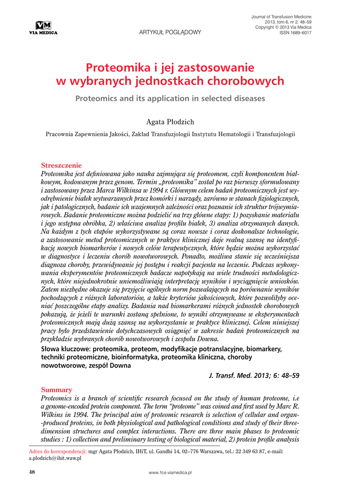 artykuł poglądowy Journal of Transfusion Medicine 2013, tom 6, nr 2, 48–59 Copyright © 2013 Via Medica ISSN 1689–6017 Proteomika i jej zastosowanie w wybranych jednostkach chorobowych Proteomics and its application in selected diseases Agata Płodzich Pracownia Zapewnienia Jakości, Zakład Transfuzjologii Instytutu Hematologii i Transfuzjologii Streszczenie Proteomika jest definiowana jako nauka zajmująca się proteomem, czyli komponentem białkowym, kodowanym przez genom. Termin „proteomika” został po raz pierwszy sformułowany i zastosowany przez Marca Wilkinsa w 1994 r. Głównym celem badań proteomicznych jest wyodrębnienie białek wytwarzanych przez komórki i narządy, zarówno w stanach fizjologicznych, jak i patologicznych, badanie ich wzajemnych zależności oraz poznanie ich struktur trójwymiarowych. Badanie proteomiczne można podzielić na trzy główne etapy: 1) pozyskanie materiału i jego wstępna obróbka, 2) właściwa analiza profilu białek, 3) analiza otrzymanych danych. Na każdym z tych etapów wykorzystywane są coraz nowsze i coraz doskonalsze technologie, a zastosowanie metod proteomicznych w praktyce klinicznej daje realną szansę na identyfikację nowych biomarkerów i nowych celów terapeutycznych, które będzie można wykorzystać w diagnostyce i leczeniu chorób nowotworowych. Ponadto, możliwa stanie się wcześniejsza diagnoza choroby, przewidywanie jej postępu i reakcji pacjenta na leczenie. Podczas wykonywania eksperymentów proteomicznych badacze napotykają na wiele trudności metodologicznych, które niejednokrotnie uniemożliwiają interpretację wyników i wyciągnięcie wniosków. Zatem niezbędne okazuje się przyjęcie ogólnych norm pozwalających na porównanie wyników pochodzących z różnych laboratoriów, a także kryteriów jakościowych, które pozwoliłyby oceniać poszczególne etapy analizy. Badania nad biomarkerami różnych jednostek chorobowych pokazują, że jeżeli te warunki zostaną spełnione, to wyniki otrzymywane w eksperymentach proteomicznych mają dużą szansę na wykorzystanie w praktyce klinicznej. Celem niniejszej pracy było przedstawienie dotychczasowych osiągnięć w zakresie badań proteomicznych na przykładzie wybranych chorób nowotworowych i zespołu Downa. Słowa kluczowe: proteomika, proteom, modyfikacje potranslacyjne, biomarkery, techniki proteomiczne, bioinformatyka, proteomika kliniczna, choroby nowotworowe, zespół Downa J. Transf. Med. 2013; 6: 48–59 Summary Proteomics is a branch of scientific research focused on the study of human proteome, i.e a genome-encoded protein component. The term “proteome” was coined and first used by Marc R. Wilkins in 1994. The principal aim of proteomic research is selection of cellular and organ-produced proteins, in both physiological and pathological conditions and study of their threedimension structures and complex interactions. There are three main phases to proteomic studies : 1) collection and preliminary testing of biological material, 2) protein profile analysis Adres do korespondencji: mgr Agata Płodzich, IHiT, ul. Gandhi 14, 02–776 Warszawa, tel.: 22 349 63 87, e-mail: [email protected] 48 www.fce.viamedica.pl Agata Płodzich, Proteomika i jej zastosowanie w wybranych jednostkach chorobowych 3) final data analysis. Each phase relies on increasingly novel and advanced technologies therefore application of proteomic techniques in clinical practice provides the opportunity of identifying new biomarkers and novel therapeutic targets for use in diagnostics and treatment of oncological diseases. Furthermore, proteomic technologies applied in clinical practice allow for earlier diagnosis of disease, prognosis for treatment and patient’s response to treatment. Proteomic experiments involve several methodological challenges which may impede data interpretation and conclusions. A uniform set of standards seems therefore indispensible as it would allow the comparison of results from different laboratories whereas a uniform set of quality criteria would enable comparison of results obtained at each stage of analysis. Research on various biomarkers demonstrates that results of proteomic studies could then be successfully applied in clinical practice. The aim of this paper was to present the current achievements of proteomics on the examples of selected malignant tumors and the Down syndrome. Key words: proteomics, proteome, posttranslational modifications, biomarkers, proteomic techniques, bioinformatics, clinical proteomics, oncological disorders, Down syndrome J. Transf. Med. 2013; 6: 48–59 Wstęp Rozwój nowoczesnych technik laboratoryjnych umożliwia nie tylko lepszą diagnostykę chorych, ale także prowadzenie badań profilaktycznych na znacznie szerszą skalę. Coraz większym zainteresowaniem, zarówno naukowców, jak i lekarzy, cieszą się badania, które pozwalają, poprzez jednoczesne oznaczanie wielu markerów chorobowych, monitorować funkcje wybranego narządu i całego organizmu ludzkiego. Jedną z dziedzin, która umożliwia prowadzenia takich badań jest proteomika — nauka zajmująca się proteomem, czyli komponentem białkowym, kodowanym przez genom. Termin „proteom” został po raz pierwszy sformułowany i zastosowany w 1994 roku przez Marca R. Wilkinsa. Definicja proteomu mówi, że jest to zestaw wszystkich białek występujących w komórce, tkance czy organizmie, w określonym czasie [1]. Proteomika może być zatem definiowana jako nauka zajmująca się identyfikacją, opisywaniem oraz oznaczaniem ilościowym wszystkich białek uczestniczących w poszczególnych szlakach biochemicznych, znajdujących się w organellach, komórkach, tkankach i narządach. Eksperymenty przeprowadzane w ramach badań proteomicznych dostarczają bardzo dokładnych i kompleksowych informacji na temat funkcjonowania danego organizmu, jednak analiza proteomu jest o wiele bardziej skomplikowana niż analiza genomu. Różnica wynika 