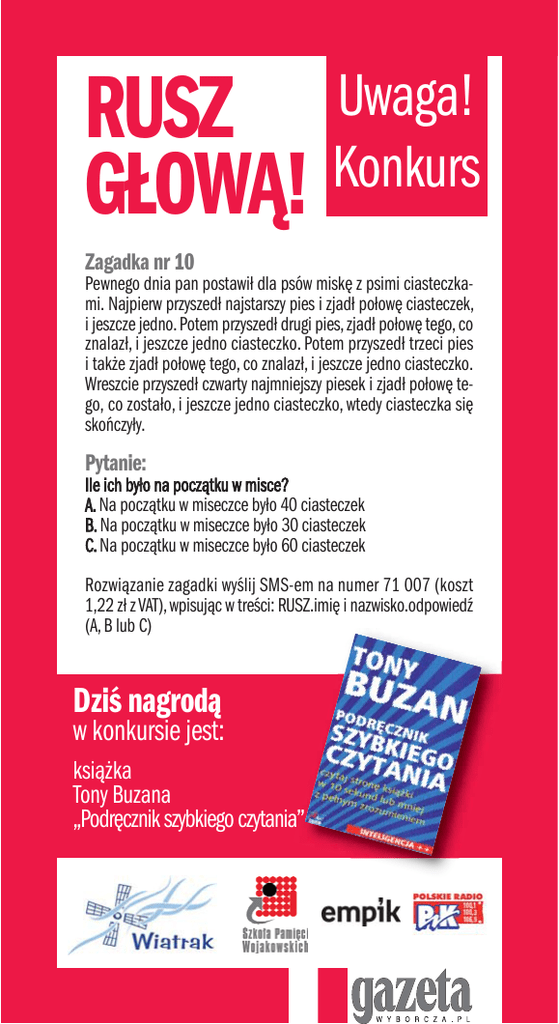 RUSZ Uwaga! GŁOWĄ! Konkurs Zagadka nr 10 Pewnego dnia pan postawił dla psów miskę z psimi ciasteczkami. Najpierw przyszedł najstarszy pies i zjadł połowę ciasteczek, i jeszcze jedno. Potem przyszedł drugi pies, zjadł połowę tego, co znalazł, i jeszcze jedno ciasteczko. Potem przyszedł trzeci pies i także zjadł połowę tego, co znalazł, i jeszcze jedno ciasteczko. Wreszcie przyszedł czwarty najmniejszy piesek i zjadł połowę tego, co zostało, i jeszcze jedno ciasteczko, wtedy ciasteczka się skończyły. Pytanie: Ile ich było na początku w misce? A. Na początku w miseczce było 40 ciasteczek B. Na początku w miseczce było 30 ciasteczek C. Na początku w miseczce było 60 ciasteczek Rozwiązanie zagadki wyślij SMS-em na numer 71 007 (koszt 1,22 zł z VAT), wpisując w treści: RUSZ.imię i nazwisko.odpowiedź (A, B lub C) Dziś nagrodą w konkursie jest: książka Tony Buzana „Podręcznik szybkiego czytania”