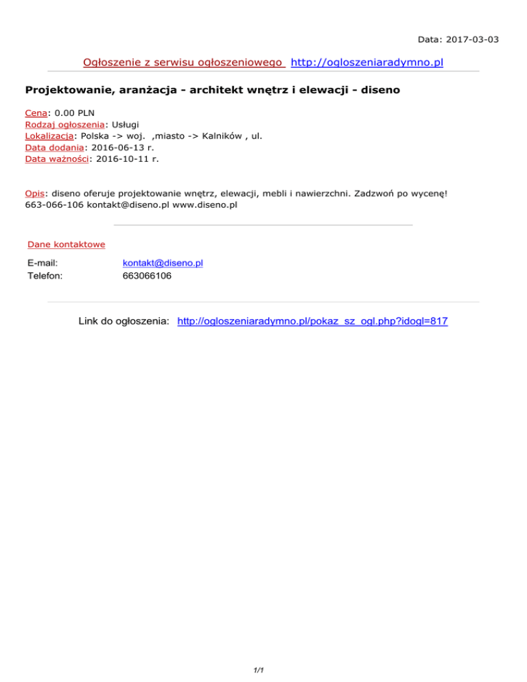 Data: 2017-03-03 Ogłoszenie z serwisu ogłoszeniowego http://ogloszeniaradymno.pl Projektowanie, aranżacja - architekt wnętrz i elewacji - diseno Cena: 0.00 PLN Rodzaj ogłoszenia: Usługi Lokalizacja: Polska -> woj. ,miasto -> Kalników , ul. Data dodania: 2016-06-13 r. Data ważności: 2016-10-11 r. Opis: diseno oferuje projektowanie wnętrz, elewacji, mebli i nawierzchni. Zadzwoń po wycenę! 663-066-106 [email protected] www.diseno.pl Dane kontaktowe E-mail: Telefon: [email protected] 663066106 Link do ogłoszenia: http://ogloszeniaradymno.pl/pokaz_sz_ogl.php?idogl=817 1/1