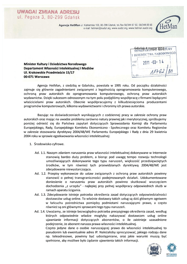 Agencja HetMan, z siedzibą w Gdańsku, powstała w 1995 roku. Od początku działalności zajmuje się głównie zagadnieniami związanymi z legalnością oprogramowania komputerowego, ochroną praw autorskich do oprogramowania komputerowego, ochroną praw autorskich wydawnictw. Dzięki sukcesom odnoszonym na tym polu podjęliśmy współpracę z firmami będącymi właścicielami praw autorskich. Obecnie współpracujemy z kilkudziesięcioma producentami programów komputerowych, kilkoma wydawnictwami i chronimy ich prawa autorskie. Bazując na doświadczeniach wynikających z codziennej pracy w zakresie ochrony praw autorskich oraz mając na uwadze problemy zarówno natury prawnej jak i merytorycznej, spróbujemy poniżej odnieść się do Państwa zapytań dotyczących Sprawozdania Komisji dla Parlamentu Europejskiego, Rady, Europejskiego Komitetu Ekonomiczno - Społecznego oraz Komitetu Regionów w zakresie stosowania dyrektywy 2004/48/WE Parlamentu Europejskiego i Rady z dnia 29 kwietnia 2004 roku w sprawie egzekwowania własności intelektualnej: 1. Środowisko cyfrowe. Ad. 1.1. Naszym zdaniem naruszenia praw własności intelektualnej dokonywane w Internecie stanowią bardzo duży problem, a biorąc pod uwagę tempo rozwoju technologii umożliwiających dokonywanie tego typu naruszeń, większość przedsięwziętych środków, w tym również tych przewidzianych dyrektywą 2004/48/WE jest zdecydowanie niewystarczająca. Ad. 1.2. Przepisy wykonawcze do ustaw związanych z ochroną praw autorskich powinny stanowić o pełnej transgraniczności podejmowanych działań. Udokumentowane doniesienie o naruszeniu praw autorskich powinno skutkować wszczęciem dochodzenia „z urzędu" - najlepiej przy pełnej współpracy odpowiednich służb w ramach aparatu ścigania. Ad. 1.3. Zdecydowanie istnieje potrzeba określenia zasad dotyczących odpowiedzialności dostawców usług online. To właśnie dostawcy takich usług są dziś głównym ogniwem w łańcuchu pośrednictwa pomiędzy podmiotami naruszającymi prawo, a często również są oni głównymi sprawcami tego typu naruszeń. Ad. 1.4. Uważamy, ze istnieje bezwzględna potrzeba precyzyjnego określenia zasad, według których odpowiednie władze mogłyby nakazywać dostawcom usług online ujawnianie informacji dotyczących abonentów, o ile zaistnieje uzasadnione podejrzenie, że abonent narusza prawa własności intelektualnej. Często jedyne dane o osobie naruszającej prawo do własności intelektualnej to pseudonim lub ewentualnie adres IP. Należałoby sprecyzować, jakiego rodzaju dane np. teleadresowe, powinny być udostępniane, oraz jakie warunki muszą być spełnione, aby możliwe było żądanie ujawnienia takich informacji. Uważamy, ze dane takie powinny być udostępniane organom ścigania już na etapie wszczętego dochodzenia. Jeśli istnie uzasadnione podejrzenie dokonania przestępstwa, na wniosek uprawnionych organów ścigania dostawcy usług powinni udostępnić niezbędne do identyfikacji podejrzanego abonenta dane, pod sankcją odpowiedzialności karnej (pomocnictwo w dokonaniu przestępstwa) lub pod groźbą zawieszenia, lub blokady usług. Może istnieć pakiet danych poufnych, które mogłyby być wyłączone z żądania ich udostępnienia takie jak: dane profilowe, zainteresowania, dane poufne itp. Co do pytania, czy tego typu środki powinny być stosowane również w innych niż naruszenia własności intelektualnej przypadkach, nie mamy na ten temat zdania. Ad. 1.5. Uważamy, ze istnieje potrzeba zmiany (rozszerzenia) obowiązujących norm prawnych w stosunku do dostawców usług online. Zarówno naruszanie praw własności w zakresie handlu elektronicznego (nieautoryzowany obrót przedmiotami chronionymi przez prawo własności) jak również w zakresie znaków towarowych. Ad. 1.6. Widzimy pilną potrzebę wprowadzenia specjalnych środków cywilnoprawnych skierowanych przeciwko stronom internetowym wspierającym nielegalną wymianę plików. Środkami takimi mogą być przykładowo: - obowiązek poddawania się okresowym obowiązkowym auditom legalności, w których upoważnione służby stwierdzą legalność treści zawartych natakicrrstronach - obowiązek udostępniania upoważnionym służbom części praw administracyjnych i dostępu do treści zawartych na stronie w celu umożliwienia automatycznej weryfikacji tych treści i jeśli zaistnieje przypadek naruszenia praw własności automatycznej blokady lub usunięcia tychże treści. 2. Zakres dyrektywy Ad. 2.1. Powinny być stosowane wszystkie możliwe środki ujęte w dyrektywie do zastosowania w każdym przypadku, w którym prawa własności intelektualnej są lub mogą być naruszane. Ad. 2.2. Nie mamy zdania w kwestiach związanych z ochroną tajemnicy handlowej, natomiast ochrona nazw domen internetowych, czy też ochrona przed kopiami stron internetowych są naszym zdaniem ściśle powiązane z prawami własności intelektualnej i jako takie powinny być obszarze działania UE. Ad. 2.3. Naszym zdaniem istnieje potrzeba zamieszczenia w dyrektywie 2004/48/WE listy praw własności intelektualnej. Lista taka powinna być wyczerpująca z ewentualnym uwzględnieniem praw obowiązujących w niektórych krajach, poprzez dodanie lub wyodrębnienie niektórych przepisów. Lista powinna być publikowana oddzielnie (preambuła). Szczegółowość takiej listy spowoduje jednoznaczność przepisów i pozwoli uniknąć różnych interpretacji i ewentualnych sporów prawnych na tym polu. 3. Dowody Ad. 3.1. Tak, uważamy, ze na gruncie polskiego prawa jest wiele problemów w zakresie dostępu do informacji prywatnych. Zdobycie takich informacji dla celów dowodowych jest utrudnione niejednoznacznymi procedurami. Ad. 3.2. Zdecydowanie istnieje potrzeba zapewnienia ze komputery osobiste mogą być przedmiotem przeszukania i zatrzymania dla celów dowodowych w przypadku uzasadnionego podejrzenia o naruszenie praw własności intelektualnej dokonanego pr