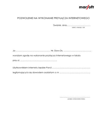 POZWOLENIE NA WYKONANIE PRZYŁĄCZA INTERNETOWEGO Świdnik, dnia…………………………… dzień, miesiąc, rok Ja ………………………………………… Nr. Dow.Os. ………………………………... wyrażam zgodę na wykonanie przyłącza internetowego w lokalu przy ul. …………………………………………… Użytkownikiem Internetu będzie Pan/i……………………………………………… legitymujący/a się dowodem osobistym o nr ……………………………………. …………………………………… podpis właściciela lokalu