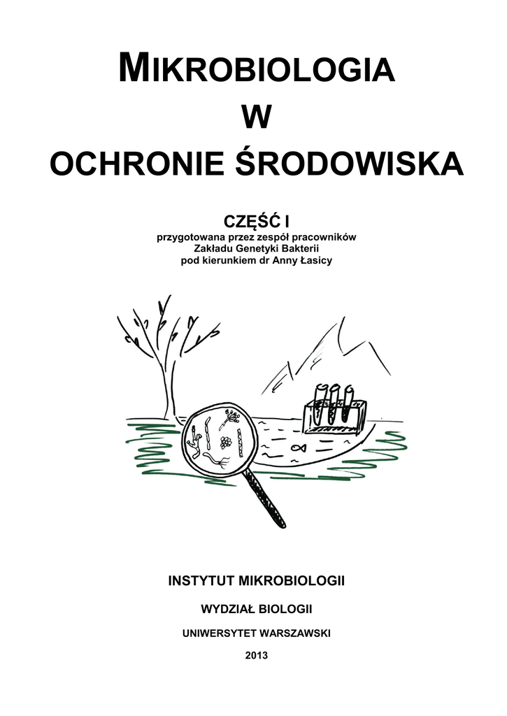 MIKROBIOLOGIA W OCHRONIE ŚRODOWISKA CZĘŚĆ I przygotowana przez zespół pracowników Zakładu Genetyki Bakterii pod kierunkiem dr Anny Łasicy INSTYTUT MIKROBIOLOGII WYDZIAŁ BIOLOGII UNIWERSYTET WARSZAWSKI 2013 SPIS TREŚCI I. REGULAMIN PRACOWNI 4 II. ĆWICZENIA Ćwiczenie 1 5 Podłoża mikrobiologiczne, jałowienie i podstawowe techniki mikrobiologiczne Izolacja mikroorganizmów ze środowisk naturalnych Ćwiczenie 2 14 Izolacja czystych kultur mikroorganizmów z różnych środowisk naturalnych Obserwacje mikroskopowe różnych form morfologicznych i wybranych struktur bakterii wyizolowanych ze środowisk naturalnych Ćwiczenie 3 19 Badanie rozkładu związków organicznych oraz przemian związków azotu przez mikroorganizmy występujące w wodzie i glebie Ćwiczenie 4 Aktywność oddechowa i fermentacyjna mikroorganizmów Ćwiczenie 5 i 6 Analiza mikrobiologicznego skażenia wody (bakterie grupy coli) Analiza mikrobiologicznego skażenia żywności (izolacja pałeczek Campylobacter) Ćwiczenie 7 29 35 Wpływ czynników środowiskowych na rozwój mikroorganizmów Ćwiczenie 8 25 40 Odczyt wyników ćwiczenia 7. Konsultacje III. SKŁAD PODŁOŻY STOSOWANYCH NA ĆWICZENIACH „Mikrobiologia w ochronie środowiska” CZĘŚĆ I Zakład Genetyki Bakterii, Instytut Mikrobiologii, Wydział Biologii, Uniwersytet Warszawski, 2013 41 2 IV. ADDENDUM 43 1. Podstawowe formy morfologiczne bakterii 43 2. Kształt nitek grzybni promieniowców 43 3. Różnorodność budowy sinic (cyjanobakterii) 44 4. Budowa konidioforów u różnych gatunków pleśni 44 5. Typowe ugrupowania u drożdży 45 6. Metody opisu kolonii bakteryjnych 45 V. ZALECANA LITERATURA 46 „Mikrobiologia w ochronie środowiska” CZĘŚĆ I Zakład Genetyki Bakterii, Instytut Mikrobiologii, Wydział Biologii, Uniwersytet Warszawski, 2013 3 I. REGULAMIN PRACOWNI 1. W pracowni obowiązuje noszenie fartucha ochronnego (najlepiej białego). 2. Wszystkie odczynniki i ich roztwory, a także podłoża i hodowle mikroorganizmów muszą być czytelnie oznakowane. 3. Na stołach laboratoryjnych wykonywania ćwiczenia. mogą znajdować się wyłącznie materiały potrzebne do 4. Należy zachować daleko idącą ostrożność przy pracy z materiałem mikrobiologicznym, a w szczególności: a) stosować się do zasad pracy jałowej (zachować szczególną ostrożność przy pracy w bezpośrednim sąsiedztwie płomienia palnika); b) wstawiać hodowle bakteryjne w probówkach do statywów (nie wolno ich kłaść na stole); c) opisywać każdą posianą próbę (rodzaj posiewu, inicjały osoby wykonującej posiew, itp.); d) po skończeniu posiewów wyżarzać ezy, opalać głaszczki i zawsze wstawiać je do statywów, a zużyte pipety wkładać do specjalnych pojemników. 5. W pracowni obowiązuje szczególna ostrożność przy pracy z odczynnikami chemicznymi (do pipetowania ich roztworów należy używać WYŁĄCZNIE pompek lub gruszek); 6. W pracowni zabronione jest spożywanie posiłków, a także picie napojów. 7. Po zakończeniu pracy należy: a) posprzątać stół laboratoryjny; b) niepotrzebny już sprzęt odłożyć na miejsce, pozostawić w porządku mikroskopy. 8. Niepotrzebne hodowle drobnoustrojów oraz szkło zużyte w trakcie pracy należy odłożyć do specjalnie przygotowanych pojemników, po uprzednim usunięciu wszelkich napisów i zanieść do zmywalni. 9. Nie wolno wynosić z pracowni żadnych hodowli bakteryjnych, preparatów i odczynników bez pozwolenia prowadzącego zajęcia. 10. Po zakończeniu pracy należy sprawdzić, czy został wyłączony gaz oraz aparatura nie przeznaczona do pracy ciągłej, a przed wyjściem z sali – umyć ręce. 11. W razie pojawienia się jakichkolwiek problemów należy niezwłocznie zgłosić się do prowadzącej zajęcia lub do opiekuna. „Mikrobiologia w ochronie środowiska” CZĘŚĆ I Zakład Genetyki Bakterii, Instytut Mikrobiologii, Wydział Biologii, Uniwersytet Warszawski, 2013 osoby 4 II. ĆWICZENIA Ćwiczenie 1 Podłoża mikrobiologiczne, mikrobiologiczne jałowienie i podstawowe techniki Wprowadzenie Obiektem badań w mikrobiologii są mikroskopijnej wielkości organizmy występujące powszechnie we wszystkich środowiskach naturalnych. Badanie tych organizmów w naturalnych warunkach bytowania jest jednak z wielu względów bardzo trudne, a często niemożliwe. Poznanie morfologii, fizjologii, wymagań pokarmowych i środowiskowych drobnoustrojów stało się realne dzięki stworzeniu sztucznych środowisk do ich hodowli - tzw. podłoży (pożywek) mikrobiologicznych. Umożliwiły one hodowanie drobnoustrojów w warunkach laboratoryjnych i uzyskanie czystych kultur - tzn. hodowli stanowiących potomstwo jednego osobnika i będących materiałem w wielu badaniach mikrobiologicznych. 1. Podłoża Podłoża mikrobiologiczne są to mieszaniny odpowiednio dobranych składników odżywczych, dostarczających hodowanym na nich organizmom niezbędnych pierwiastków chemicznych oraz źródła energii. Każde podłoże musi mieć odpowiednią dla danego gatunku wartość odżywczą, odpowiednie pH oraz odpowiednie ciśnienie osmotyczne. Ważne jest również określenie, do jakiego celu ma służyć dane podłoże - czy chodzi nam tylko o uzyskanie hodowli, o wyselekcjonowanie jakichś określonych bakterii, czy też o zbadanie właściwości metabolicznych tych mikroroganizmów. Zależnie od potrzeby możemy zastosować podłoże minimalne lub pełne, mineralne, selekcyjne czy różnicujące. Ze względu na konsystencję dzielimy podłoża na: płynne, półpłynne i stałe. Podłoża zestala się najczęściej agarem, który jest uzyskiwany z krasnorostów morskich. Podłoża zestalone można wykorzystywać w postaci słupków, skosów i na płytkach Petriego. Jednym z koniecznych warunków, jaki muszą spełniać wszystkie podłoża, jest ich sterylność, co oznacza, że muszą być pozbawione wszelkich żywych organizmów - zarówno ich form wegetatywnych jak i przetrwalnikowy